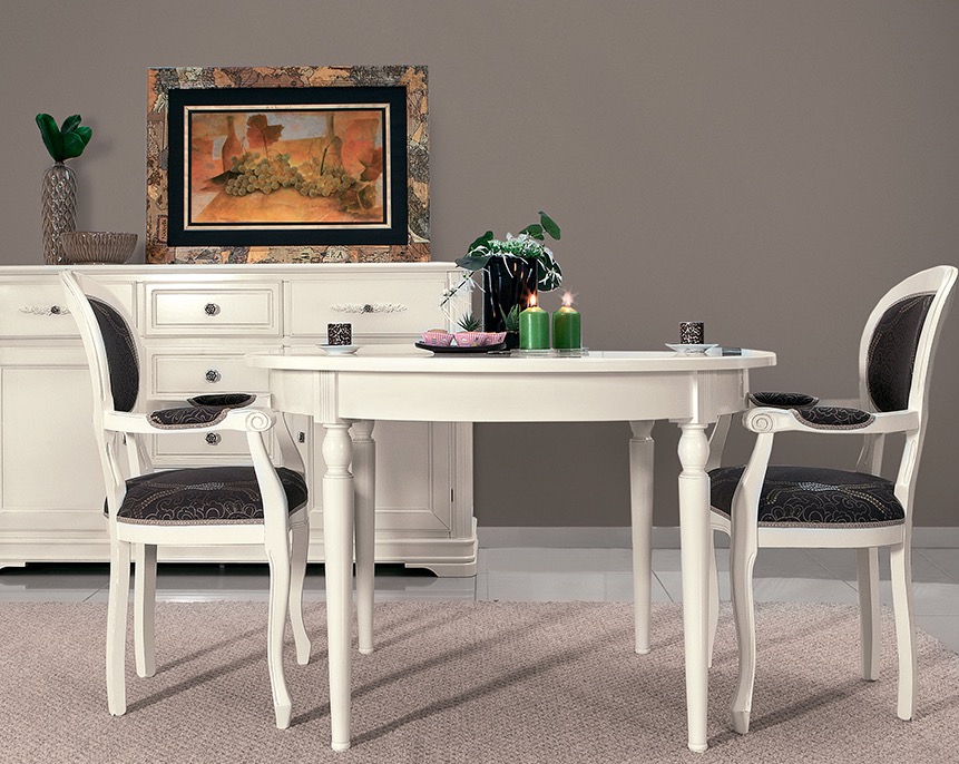 Комплект мебели для обеденной зоны из коллекции Артемида от фабрики Monte Cristo Mobili состоит 3-х предметов и включает: раскладной стол и два стула с подлокотниками.