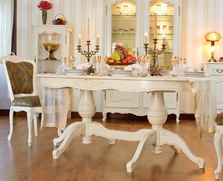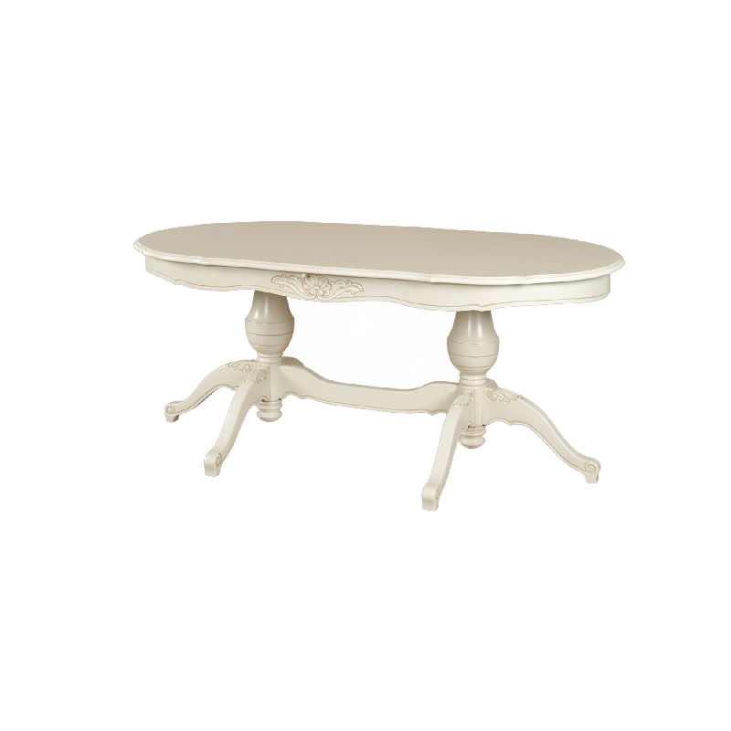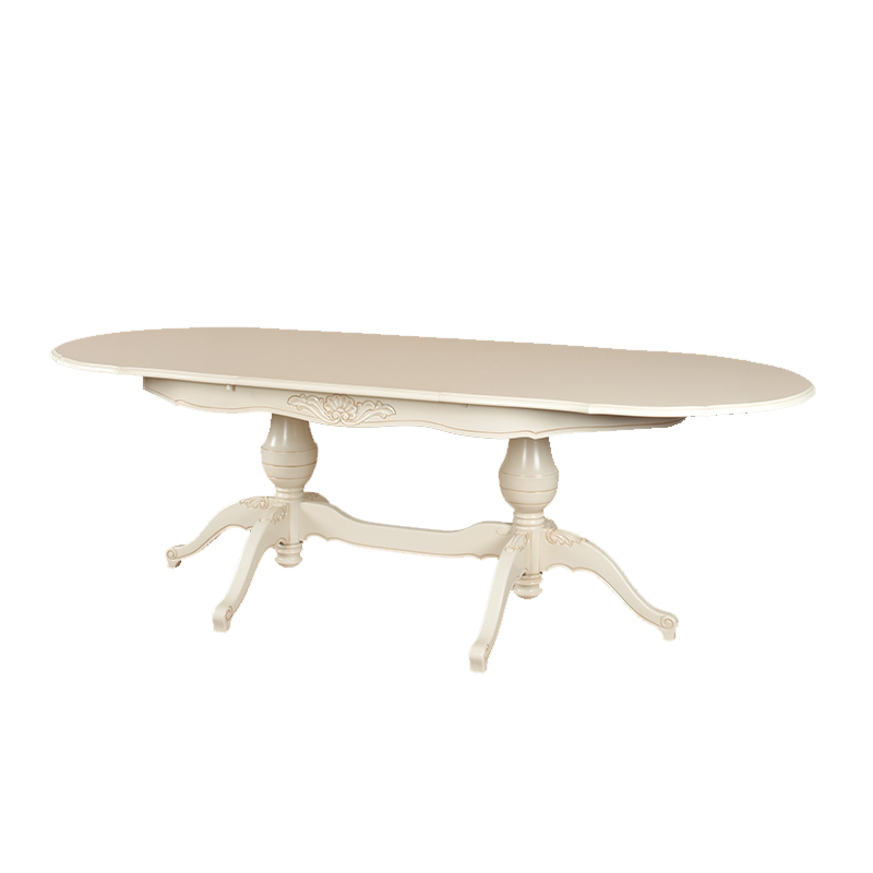 Раздвижной обеденный стол для гостиной и кухни из коллекции Могадор от фабрики Мобекс | Mobex выполнен из массива бука в светлом оттенке слоновая кость и декорирован контрастной патиной, которая подчеркивает резные элементы.