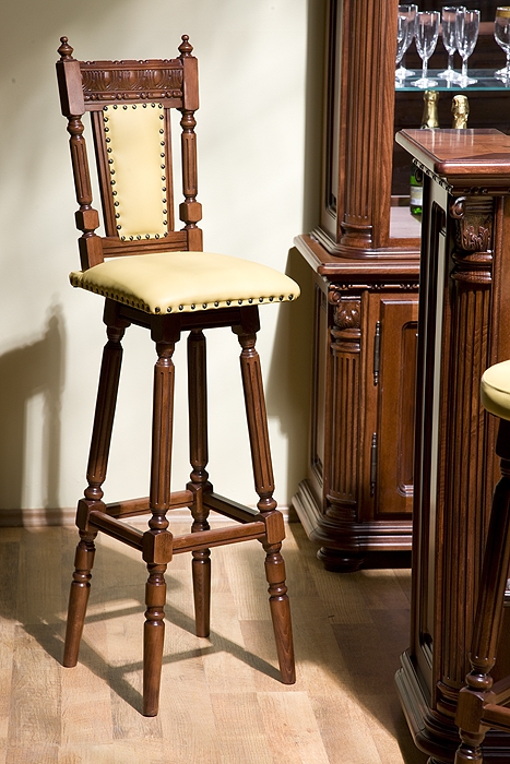 Барный стул со спинкой из коллекции Венеция Люкс от фабрики Simex выполнен из натурального массива дерева и декорирован резными элементами, которые подчеркивают классический дизайн изделия, а в качестве обивочного материала может быть использована: ткань или натуральная кожа из каталога производителя.