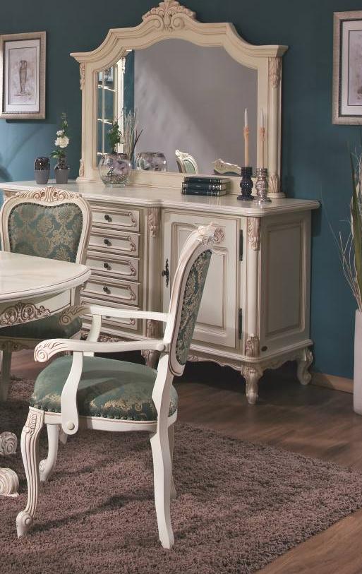 Классический стул с подлокотниками из серии Роял от фабрики Simex гармонично дополнит обеденный стол в светлом оттенке слоновая кость из одноименной коллекции.