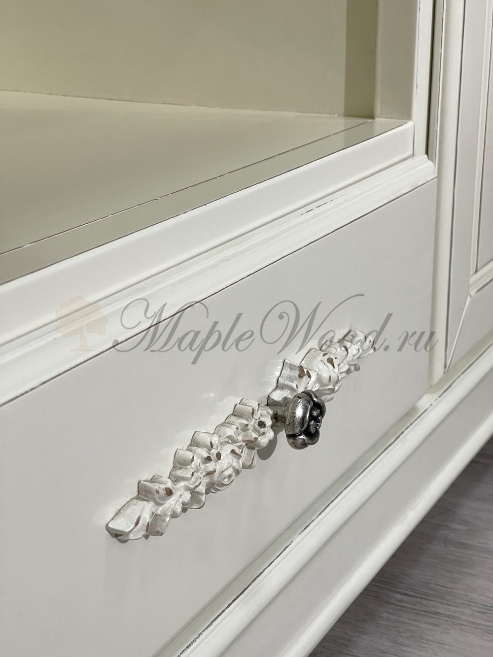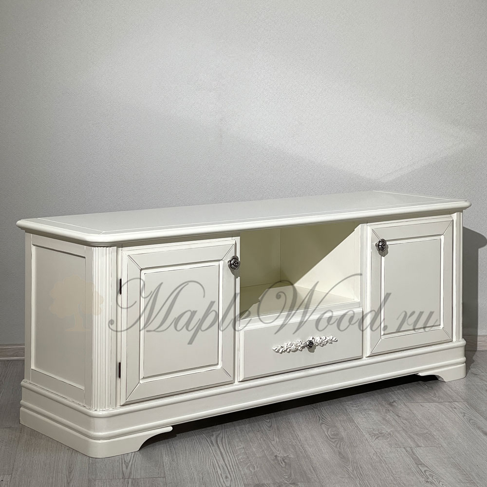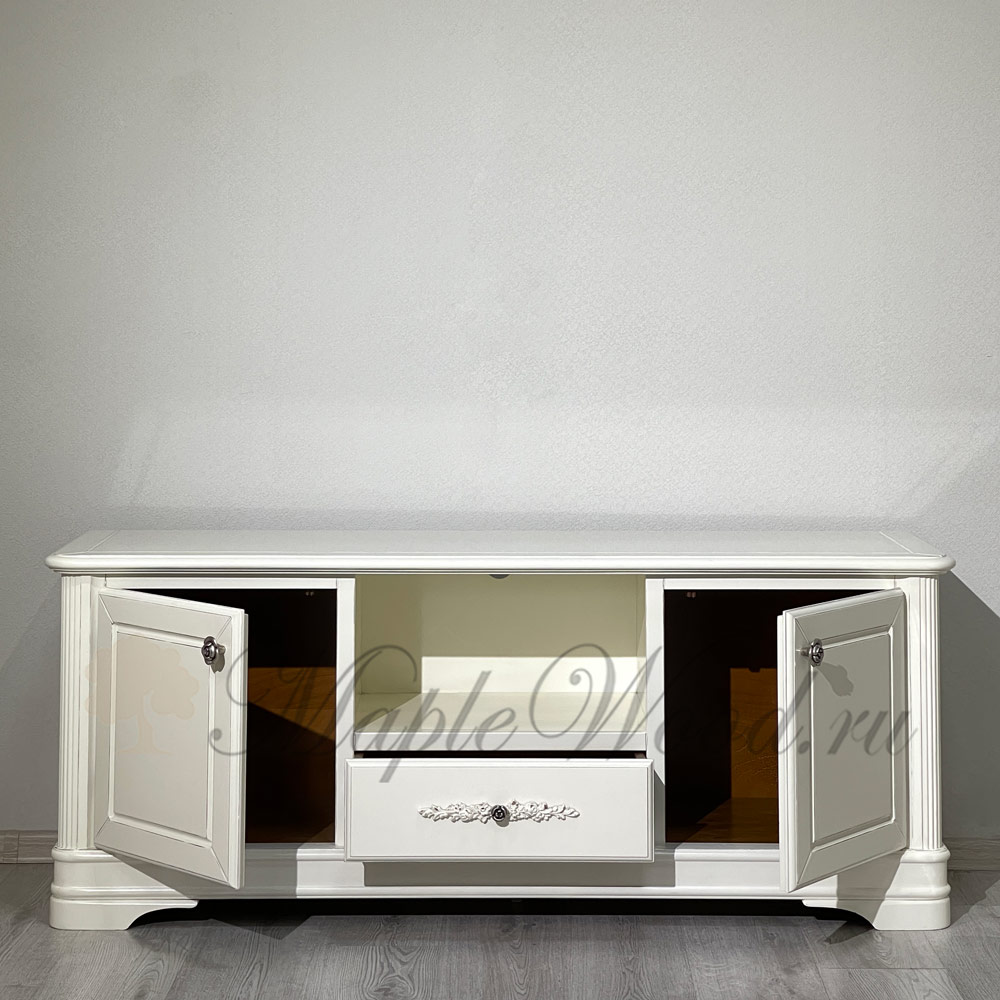 Тумба под ТВ из коллекции Артемида от фабрики Monte Cristo Mobili выполнена в неоклассическом стиле из натурального массива дерева в светлом оттенке слоновая кость и декорирована патиной, которая завершает дизайн изделия и придает ему винтажный облик.