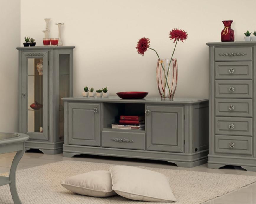 Тумба под ТВ из коллекции Артемида от фабрики Monte Cristo Mobili выполнена в неоклассическом стиле из натурального массива дерева в оригинальном сером оттенке.