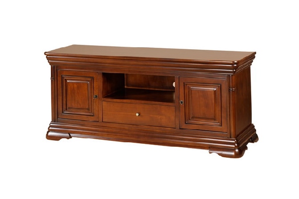 Тумба под ТВ из коллекции Элеганс от фабрики Мобекс | Mobex выполнена из натурального дерева в темной отделке орех, сочетая сдержанность форм и строгий стиль классики.