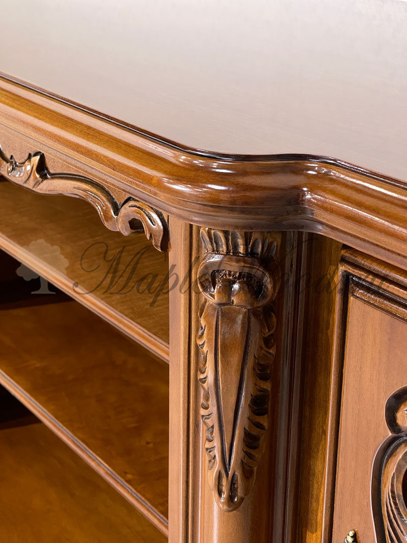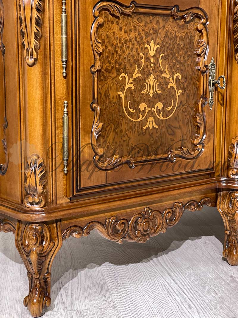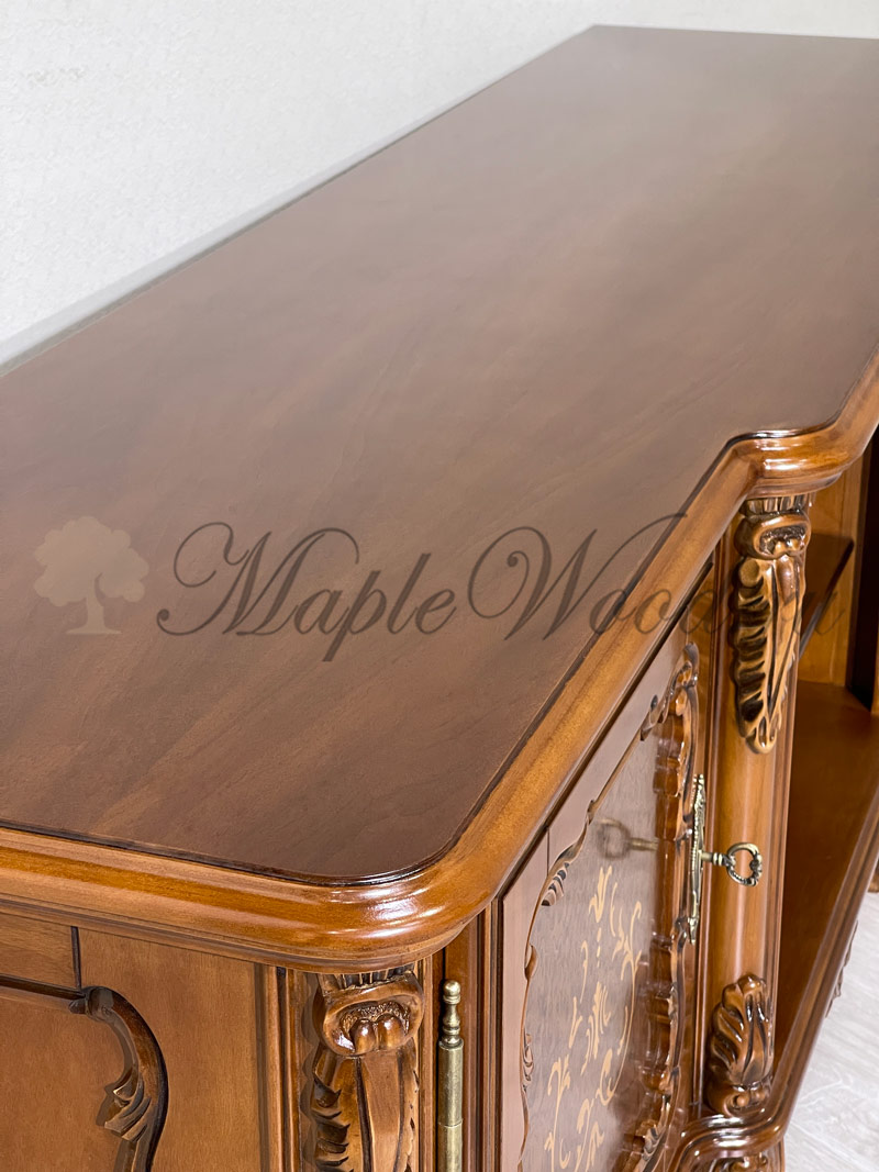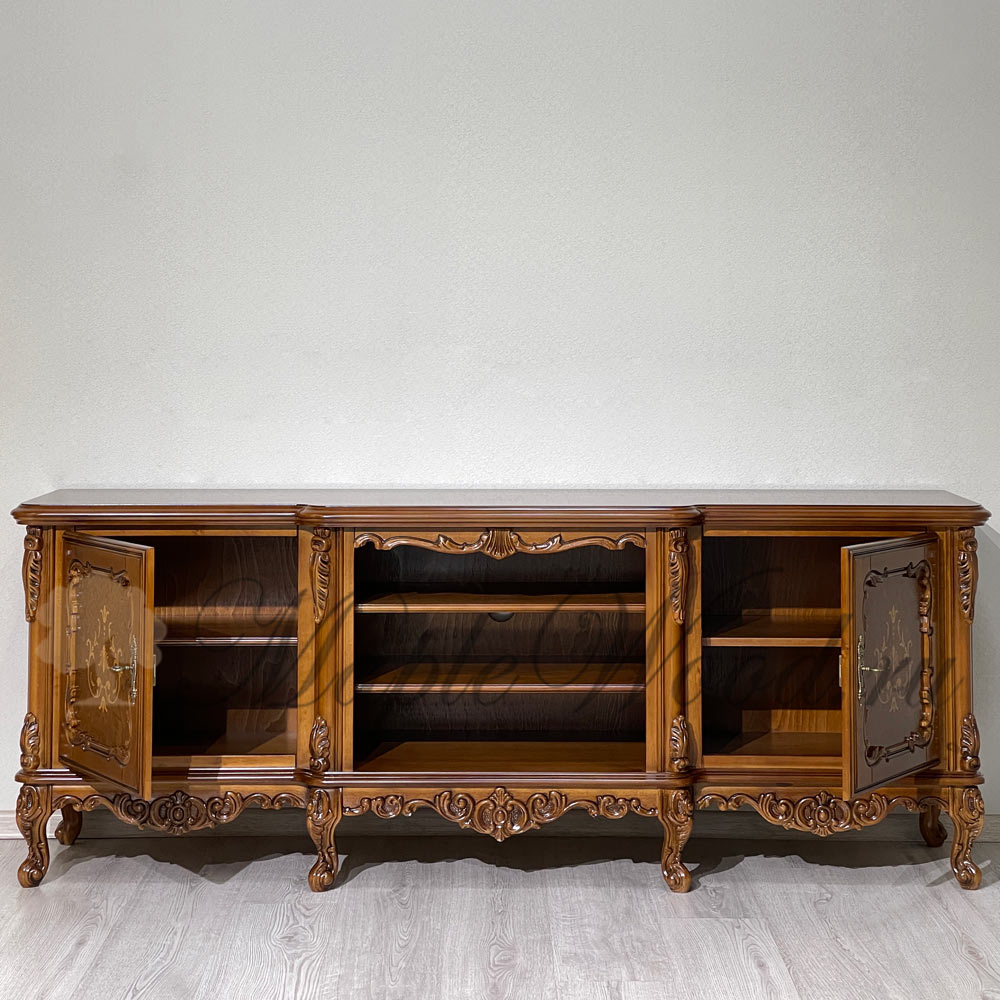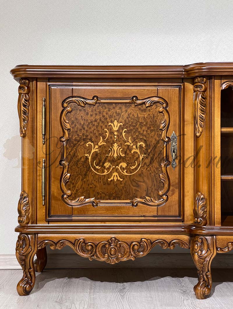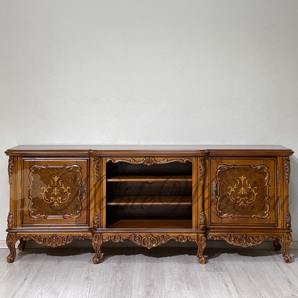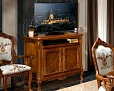 ТВ тумба выполнена в классическом стиле из благородного массива дерева и декорирована искусной резьбой и эффектной инкрустацией.