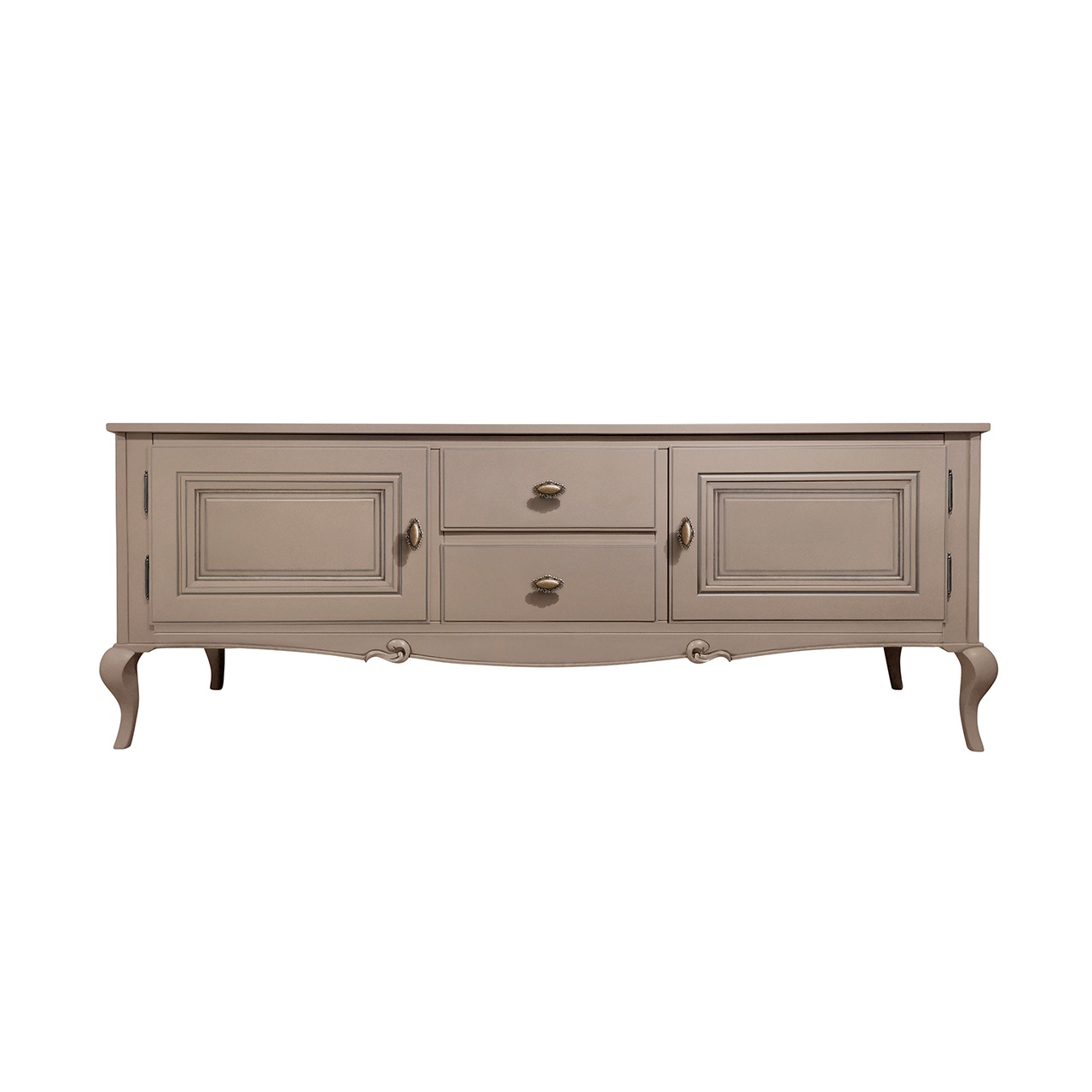 Тумба под ТВ на фигурных ножках кабриоль из коллекции Портофино от фабрики Тимбер выполнена из крашенного МДФ с гладкой фактурой и матовым типом покрытия, которое отличается практичностью и простотой в уходе.