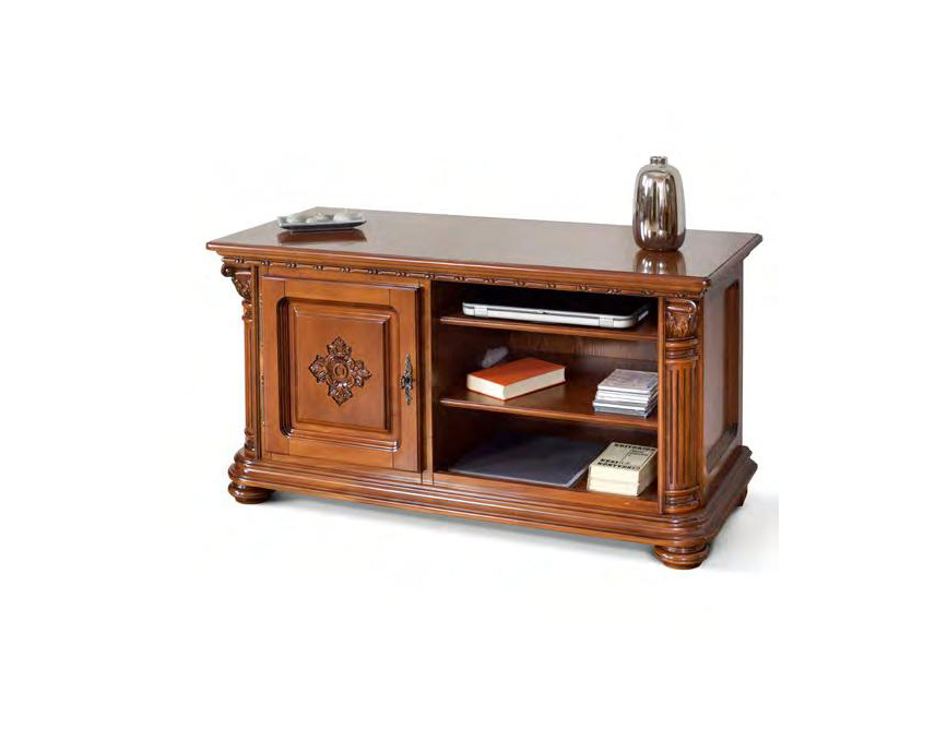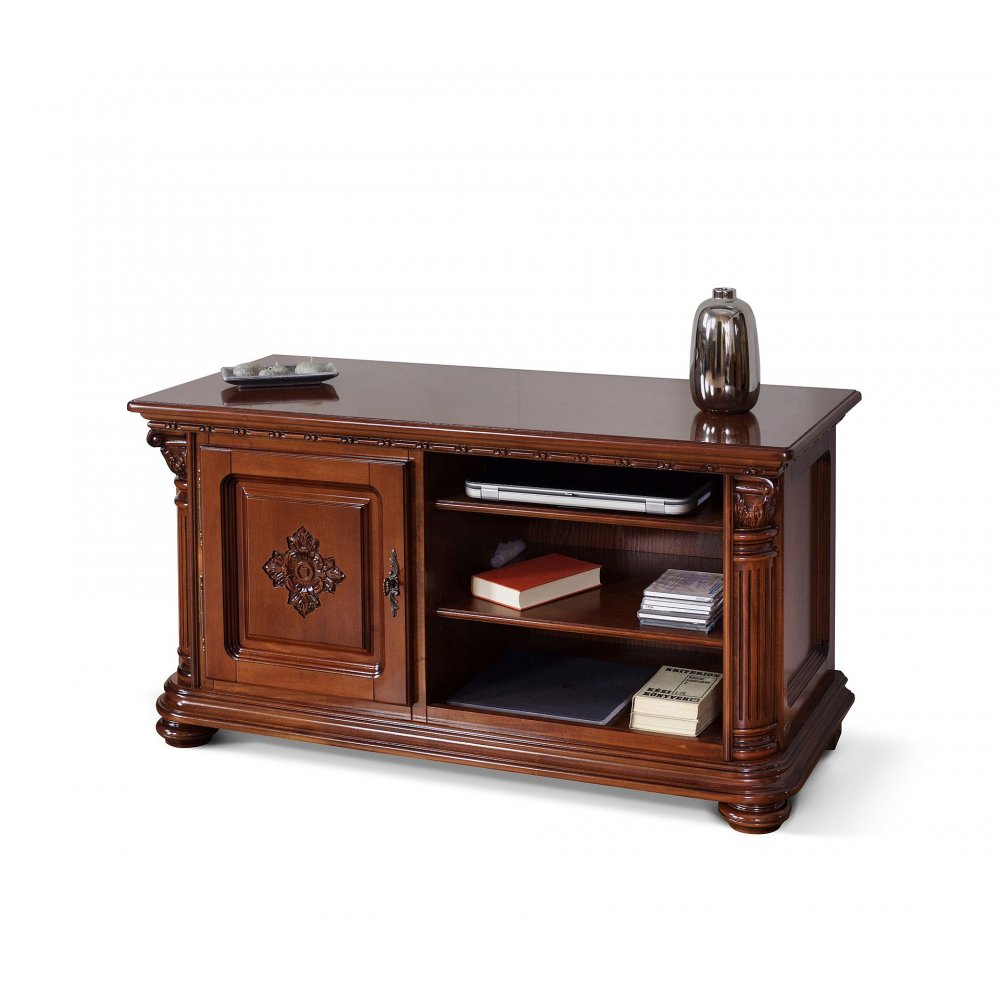 Небольшая ТВ тумба из коллекции Венеция Люкс от фабрики Simex выполнена в классическом стиле из натурального массива дерева и украшена резными элементами и декоративными пилястрами, которые придают изделию законченный вид.