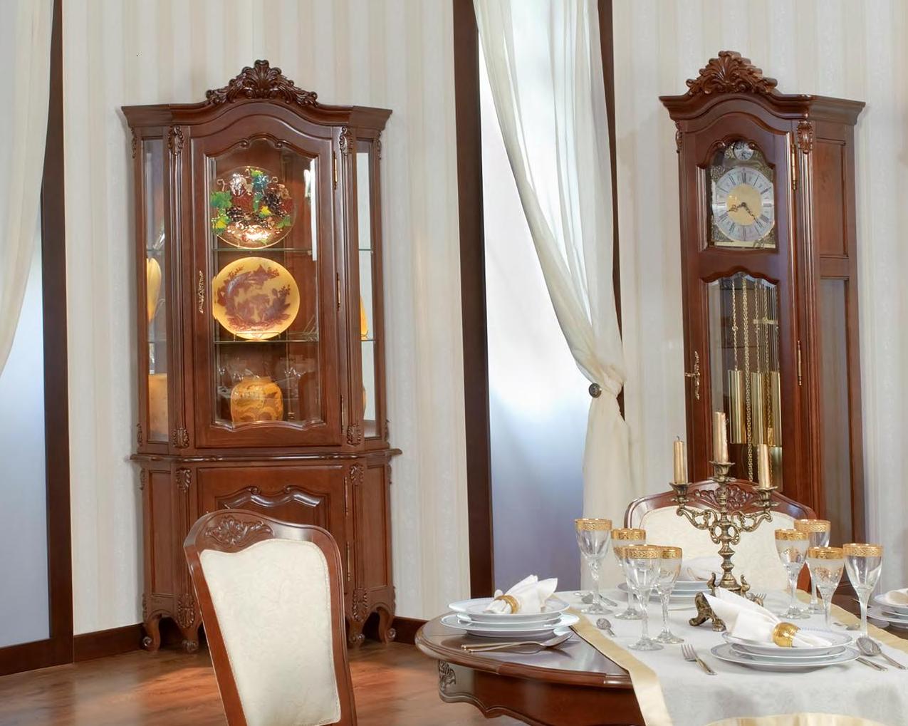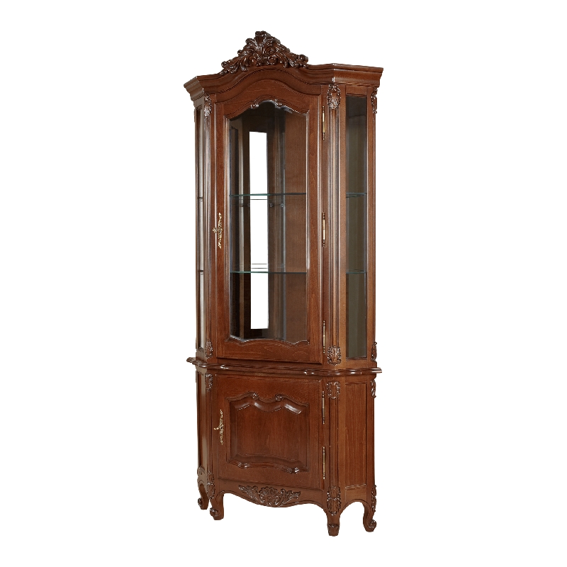 Витрина выполнена из массива дерева в стандартной отделке орех и декорирована резными элементами, которые подчеркивают классический дизайн изделия.