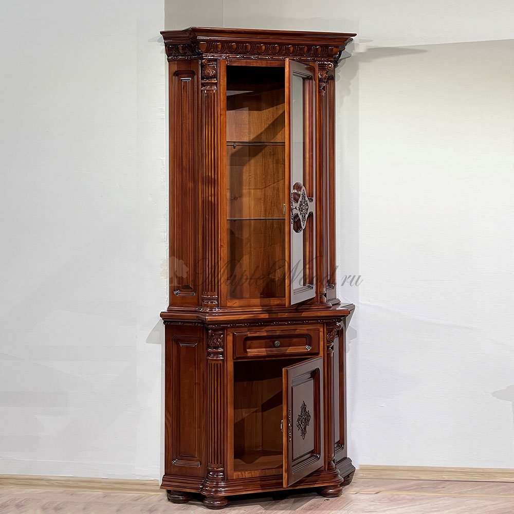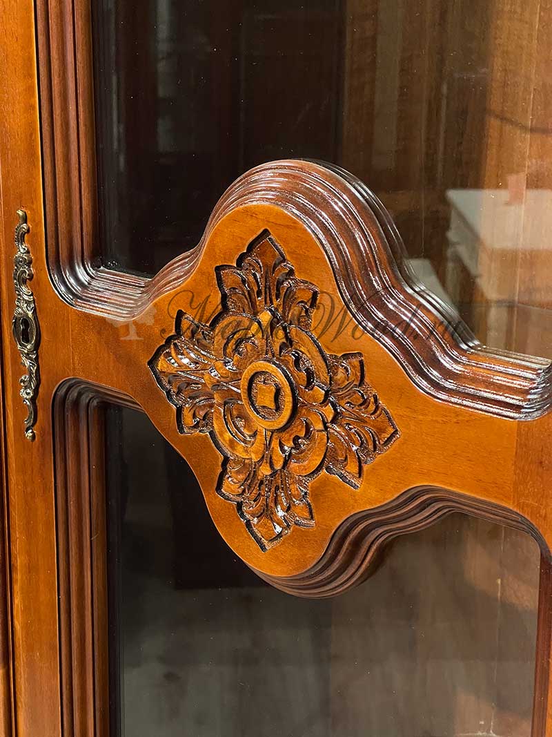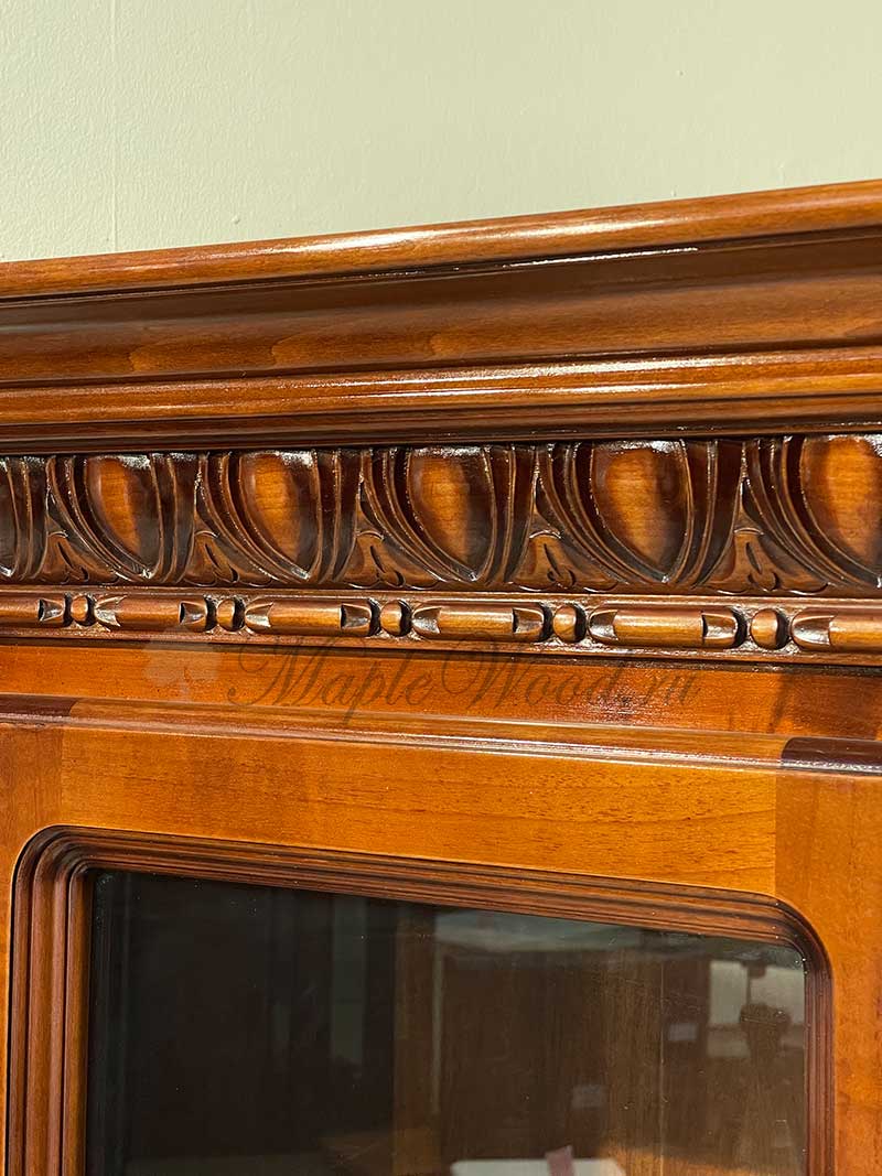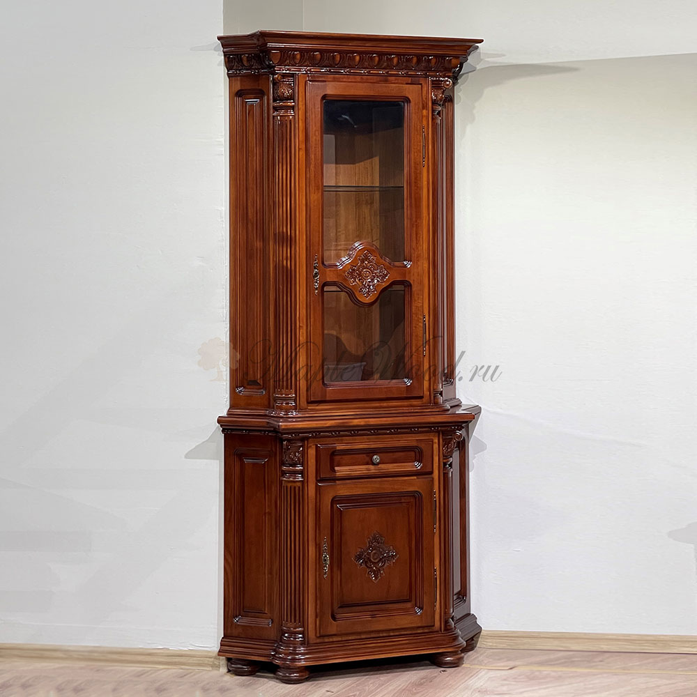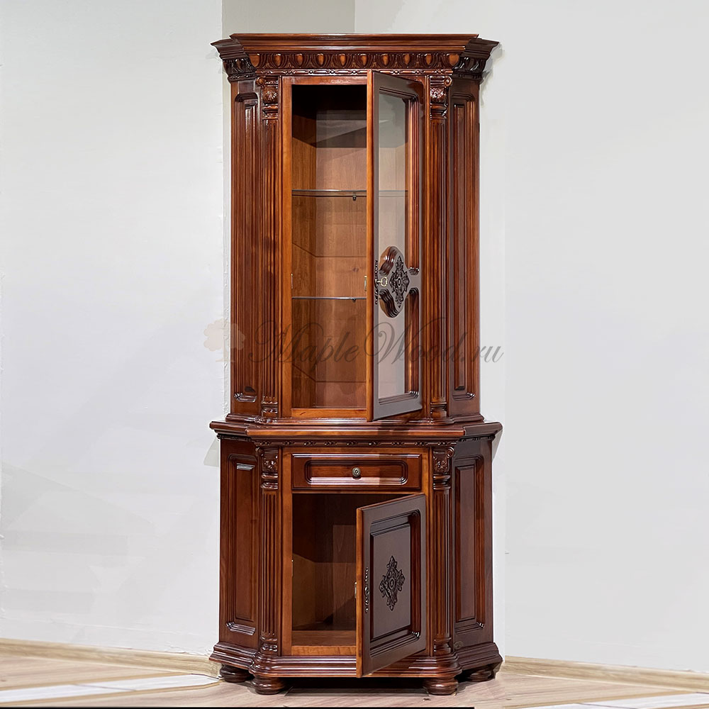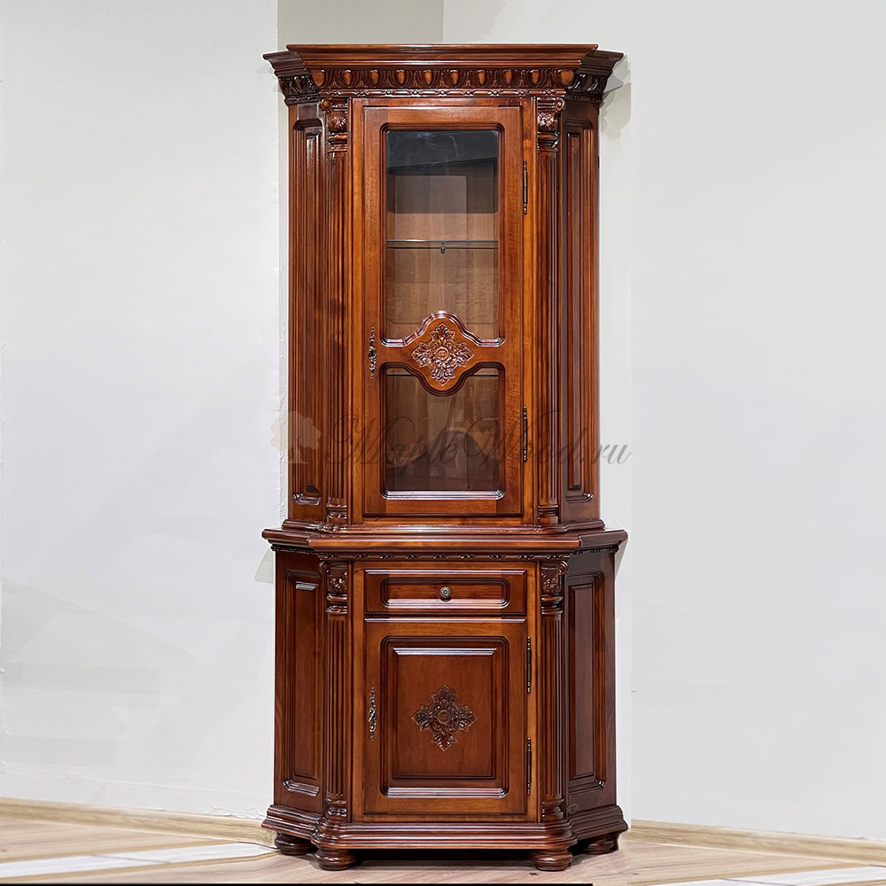 Витрина выполнена из натурального массива дерева в отделке орех с красным оттенком и декорирована резьбой, которая подчеркивает классический стиль изделия.
