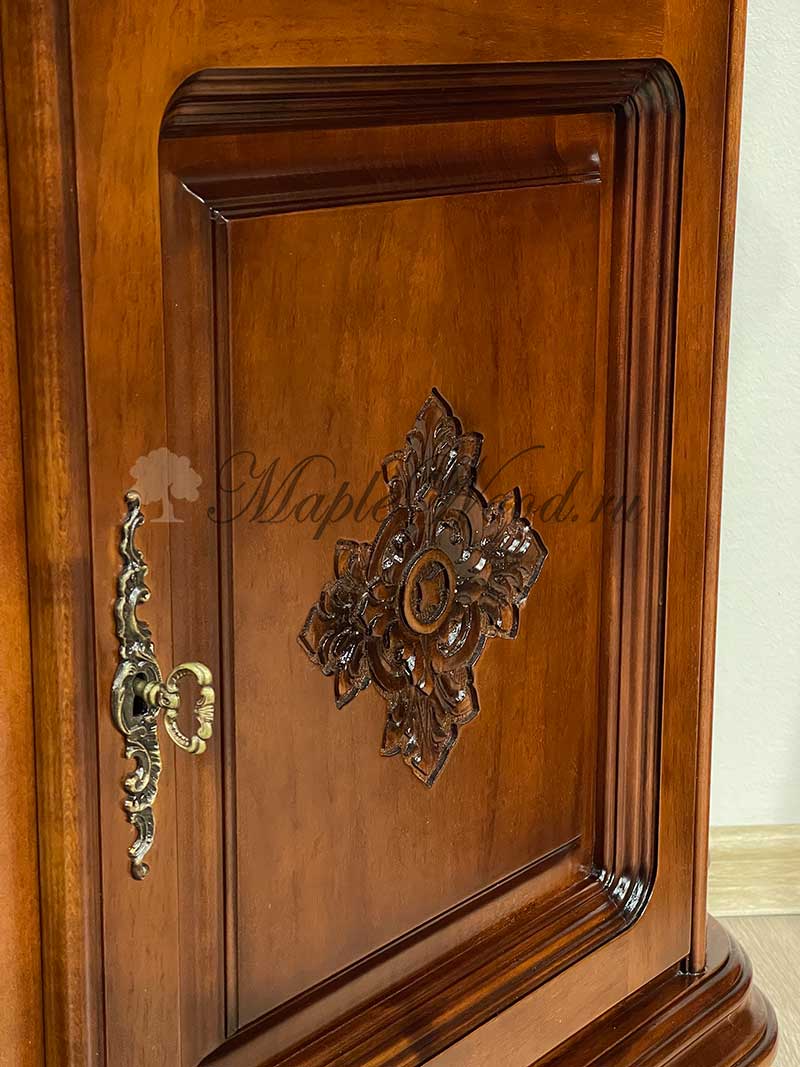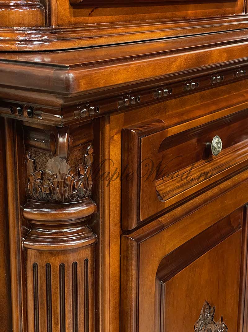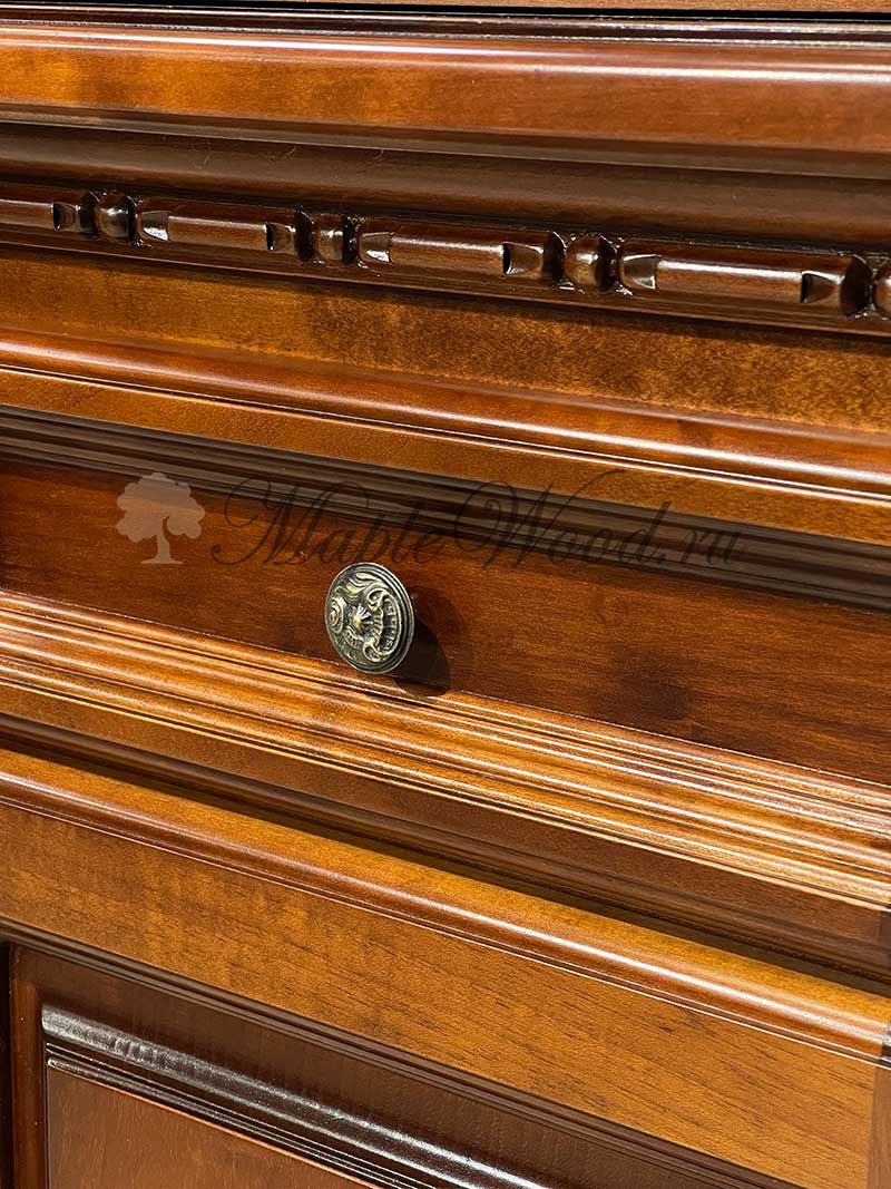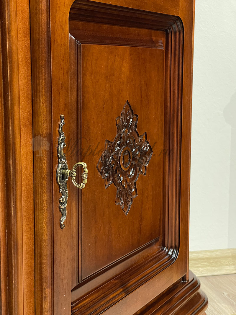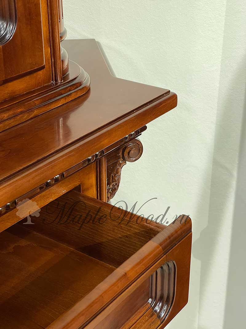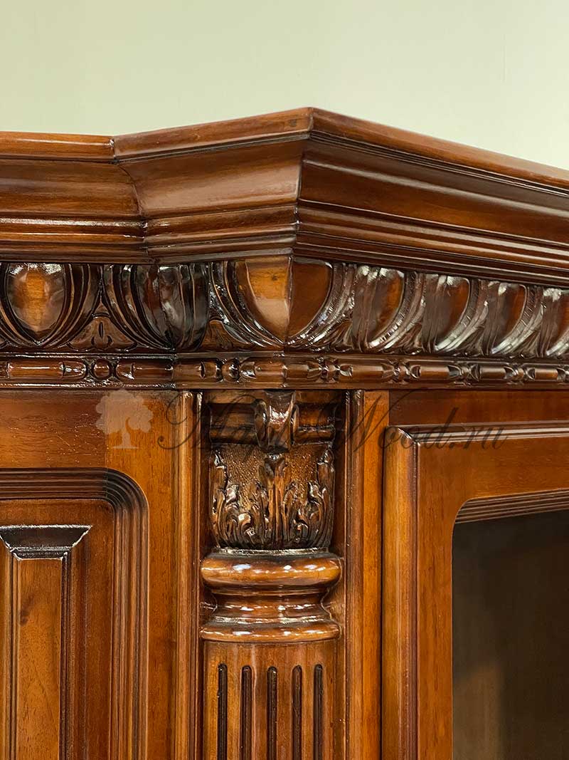 Витрина выполнена из натурального массива дерева в отделке орех с красным оттенком и декорирована резьбой, которая подчеркивает классический стиль изделия.