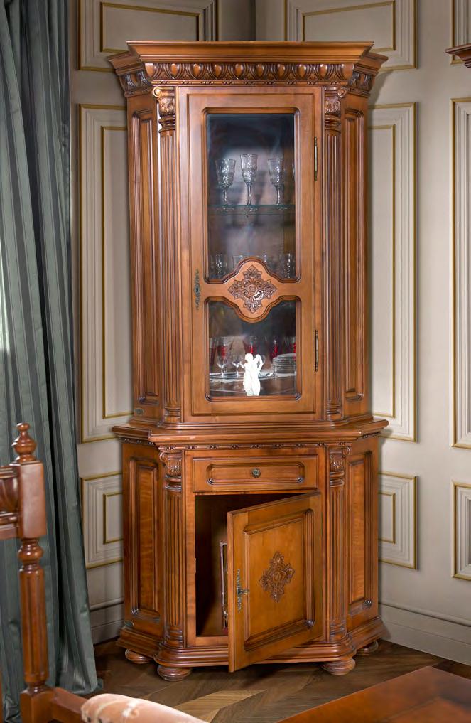 Угловой шкаф для гостиной из коллекции Венеция Люкс от фабрики Simex состоит из 2-х частей и включает: закрытый буфет и витрину со стеклянными полками, на которых можно разместить набор посуды или другие предметы декора.