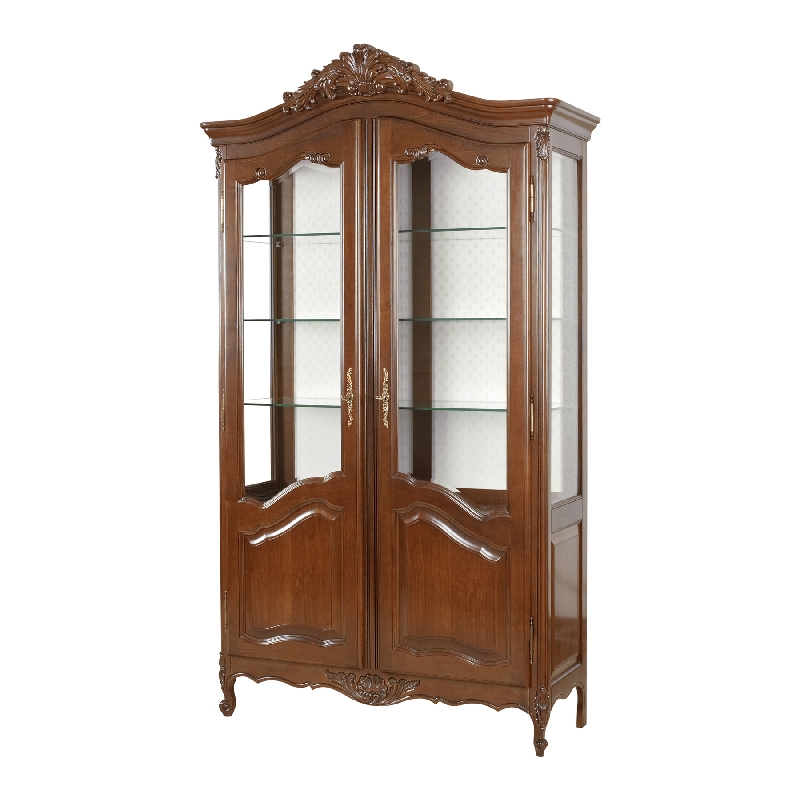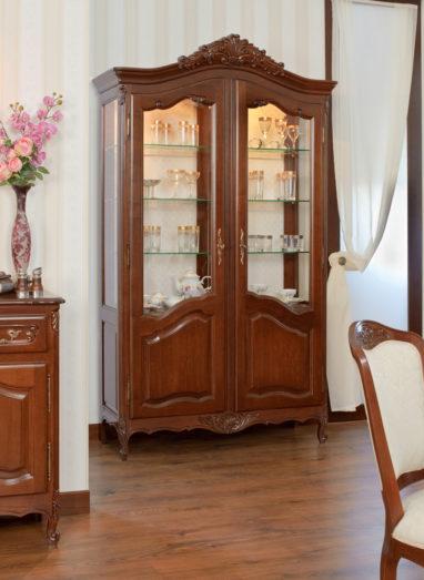 Витрина 2-х дверная из коллекции Могадор от фабрики Мобекс | Mobex выполнена из массива дерева в стандартной отделке орех и декорирована резными элементами, которые подчеркивают классический дизайн изделия.