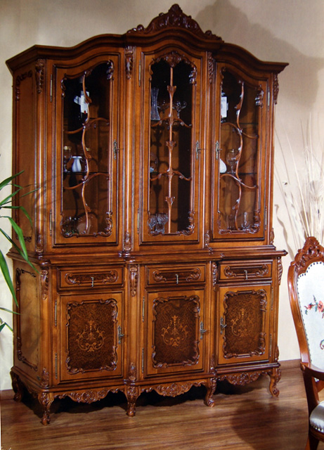 Витрина выполнена в стандартной отделке "орех" из натурального дерева и декорирована инкрустацией и резьбой ручной работы, которая подчеркивает эффектный внешний вид изделия