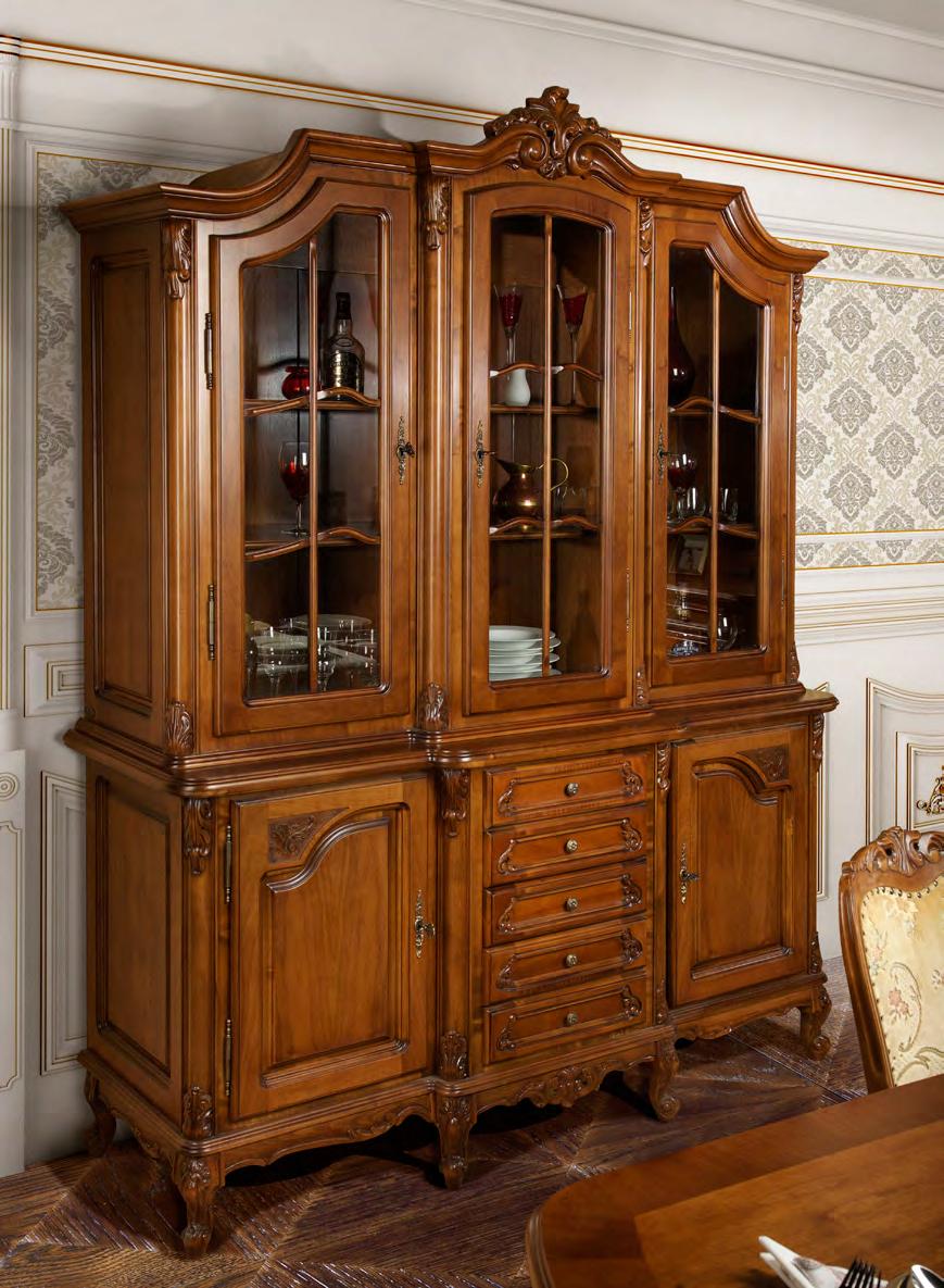 Большой и функциональный шкаф для гостиной и столовой из коллекции Роял от фабрики Simex состоит из 2-х частей и включает: закрытый буфет для хранения столовых принадлежностей и застеклённую 3-х дверную витрину, оборудованную полками, на которых можно разместить набор посуды и другие предметы декора.