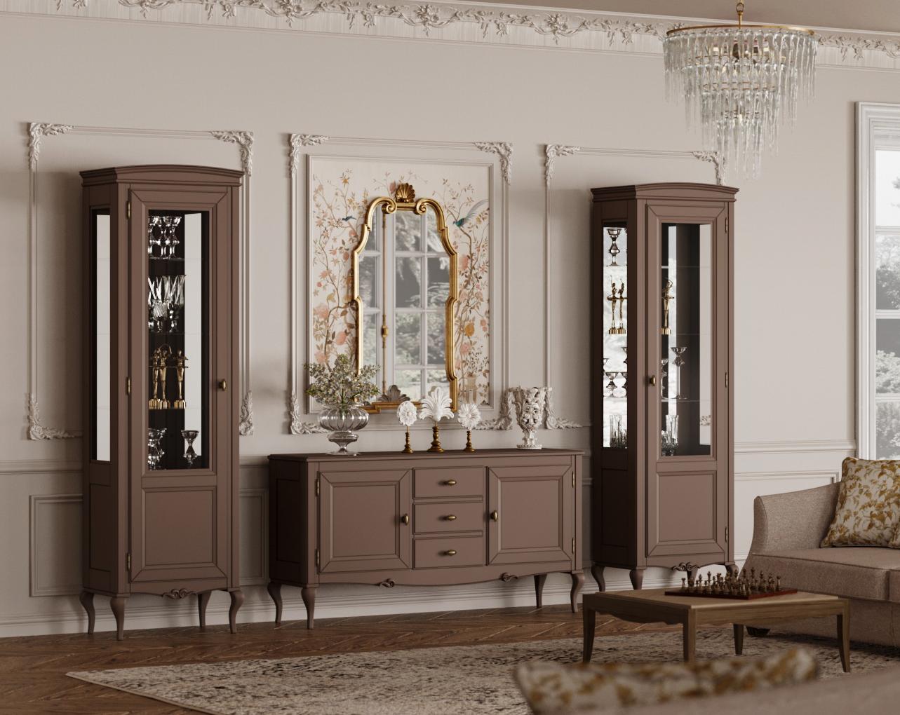 Витрину можно использовать как самостоятельный предмет интерьера или дополнить ее ТВ тумбой или буфетом из одноименной коллекции, создав полноценную и гармоничную мебельную композицию.