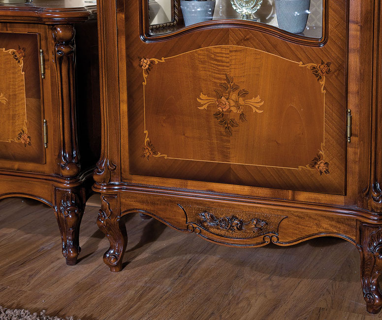 Однодверная витрина для хранения посуды и предметов декора из коллекции Регаллис от фабрики Nord Simex выполнена из массива натурального дерева и декорирована резьбой и инкрустацией ручной работы.