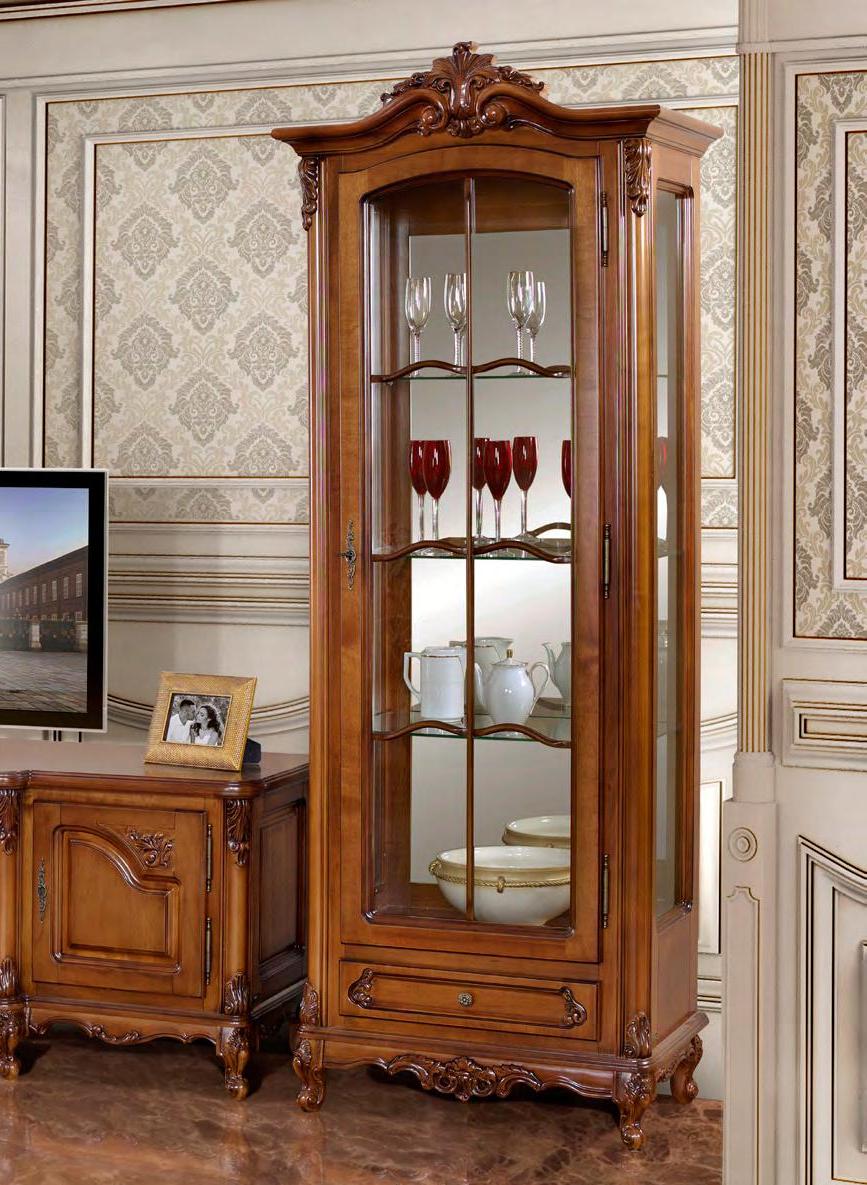Однодверная витрина для хранения посуды из коллекции Роял от фабрики Simex изготавливается из массива и шпона древесины с использованием высококачественной отделки, которая позволяет изделию долгое время сохранять прочность и красоту.