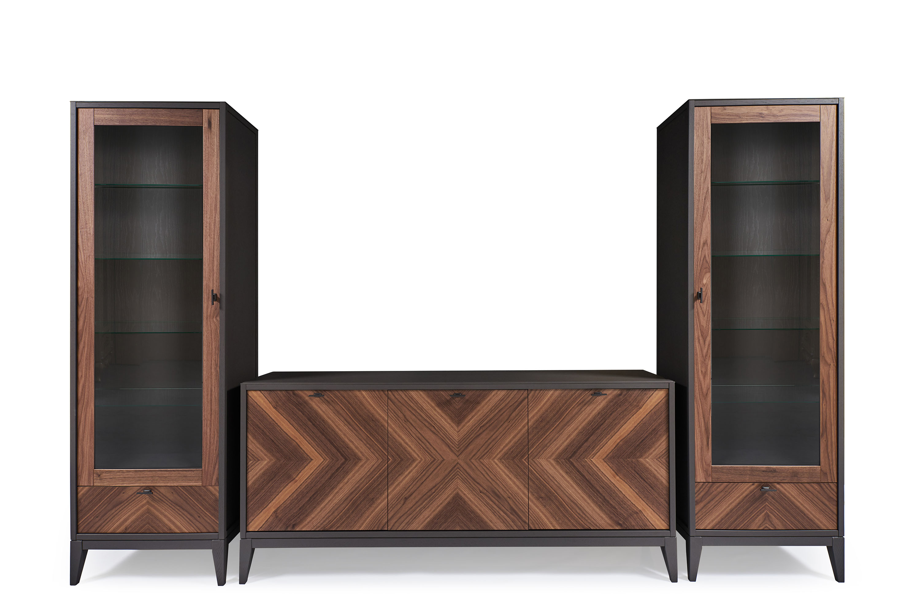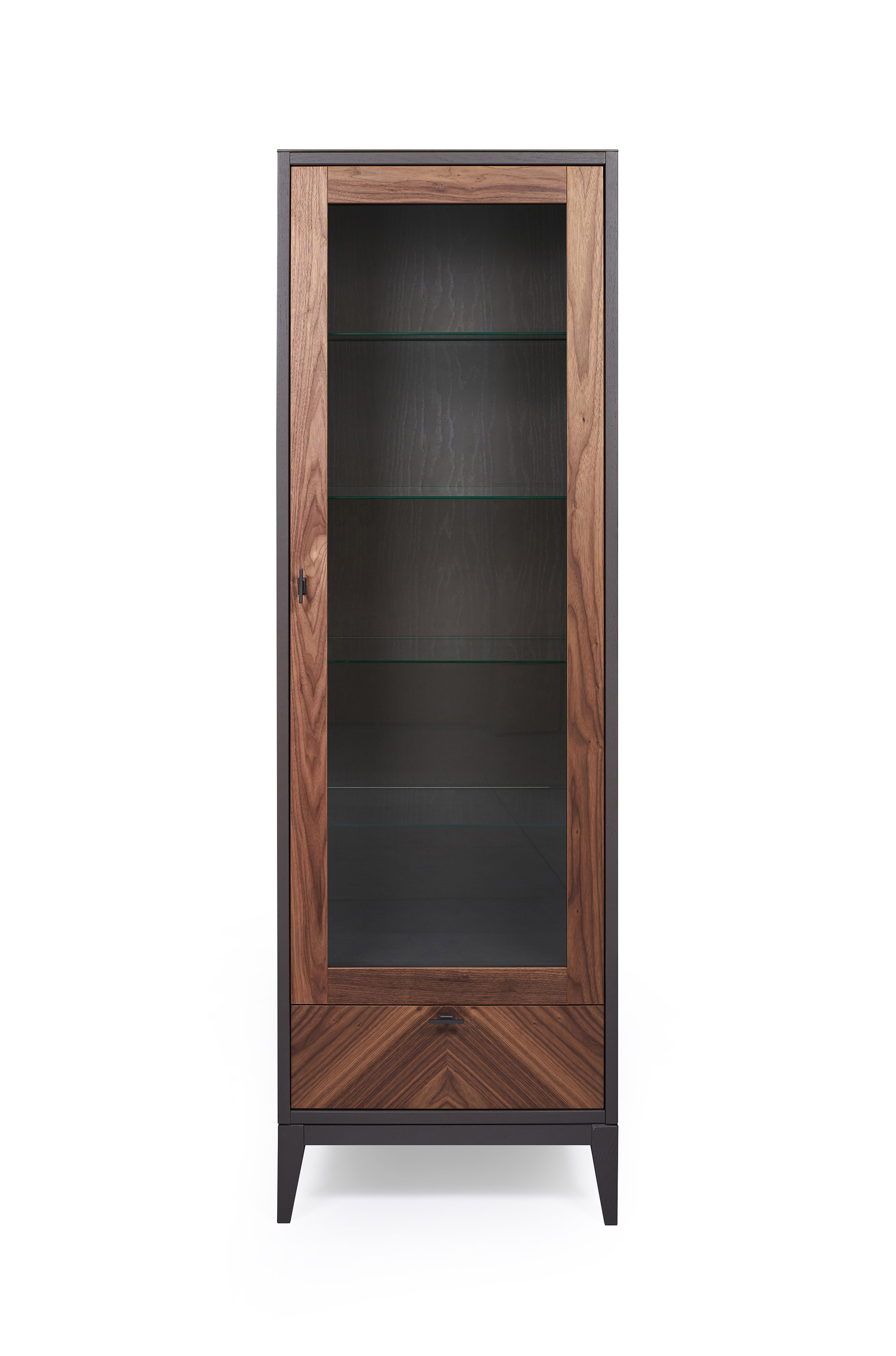 Витрина выполнена в современном дизайне из крашенного МДФ, и декорирована натуральным шпоном дерева, образуя оригинальный узор и завершая дизайн изделия.