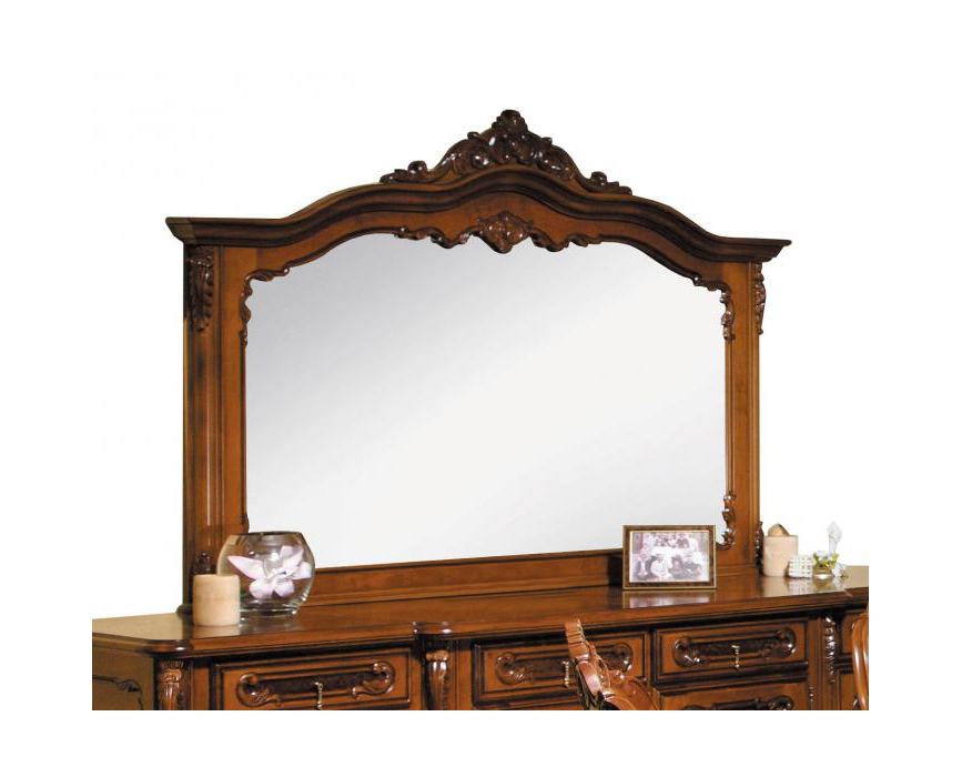 Зеркало выполнено в раме из натурального массива дерева и украшено резными элементами, которые подчеркивают оригинальность изделия.