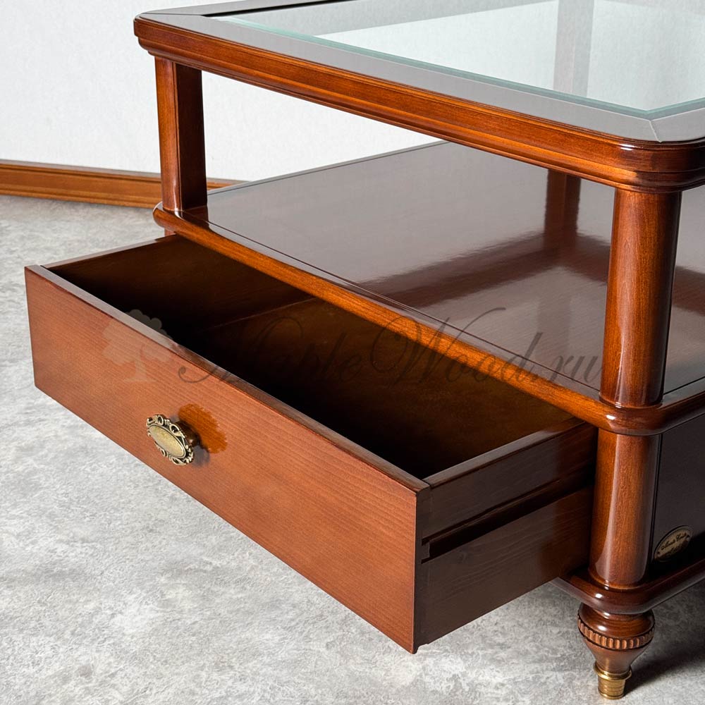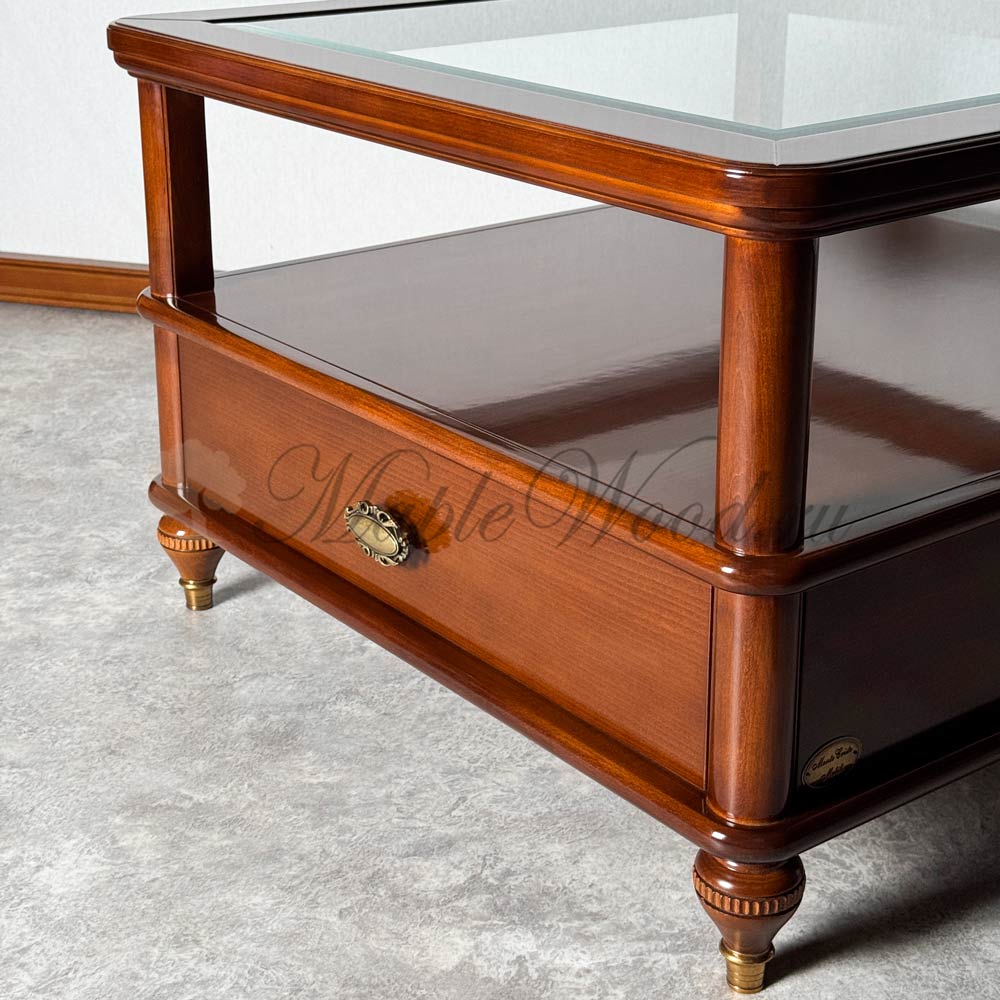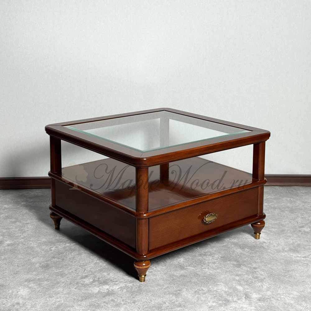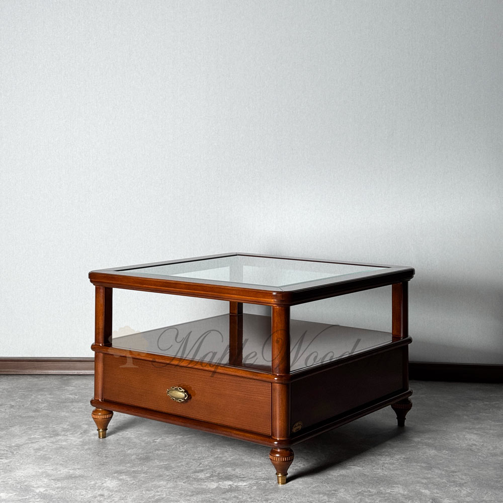 Квадратный столик для гостиной из коллекции Бурбон от фабрики Monte Cristo Mobili сочетает в себе два вида материалов: стекло и массив натурального дерева, а бронзовая фурнитура и фигурные ножки завершают лаконичный дизайн изделия, придавая ему особый стиль и оригинальность.