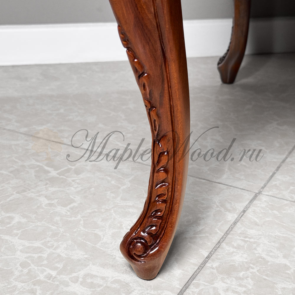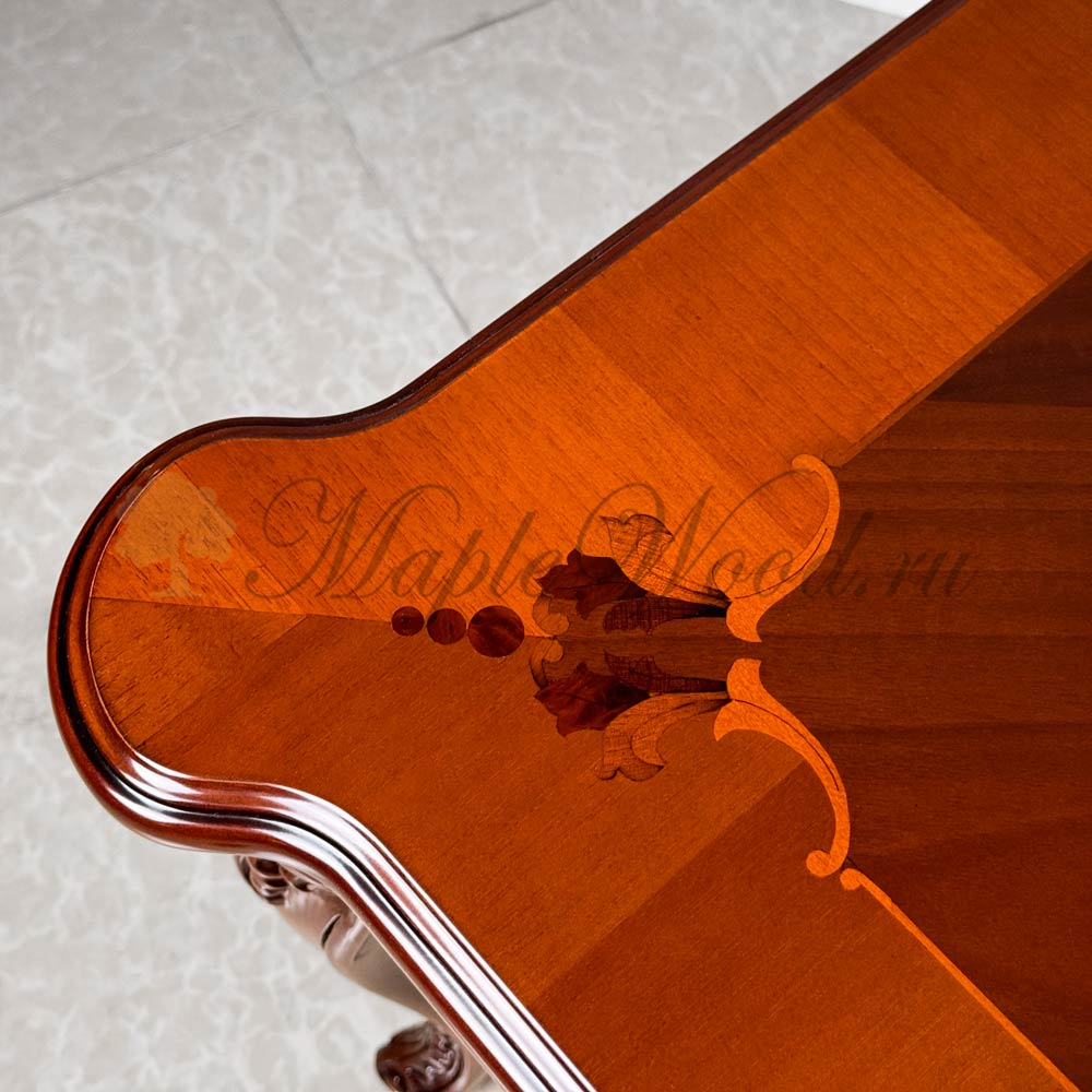 Стол выполнен из массива дерева ореха и декорирован эффектной резьбой и инкрустацией из шпона.