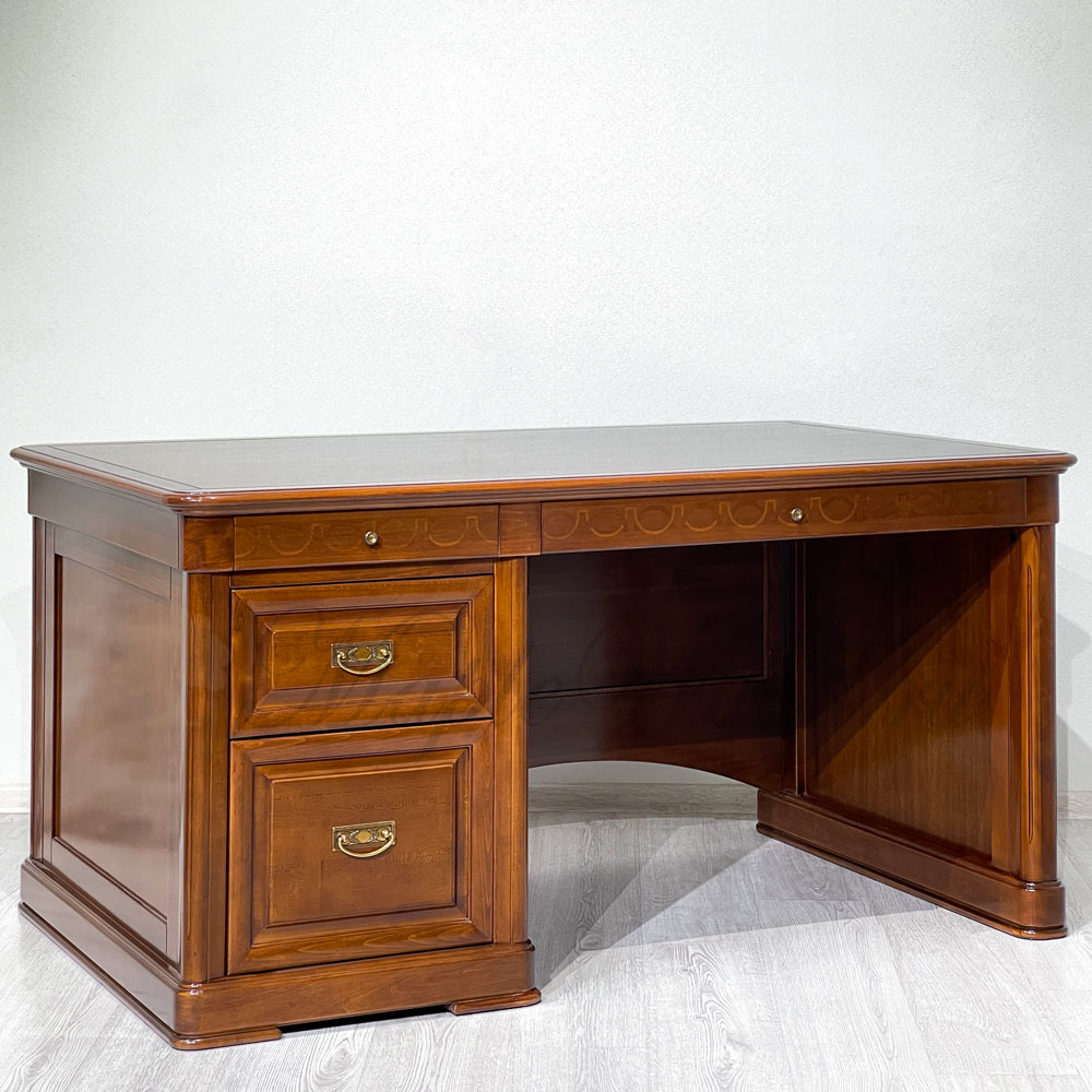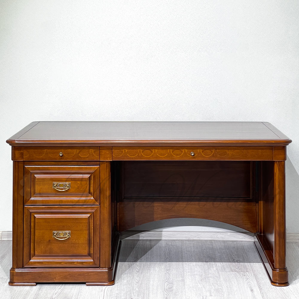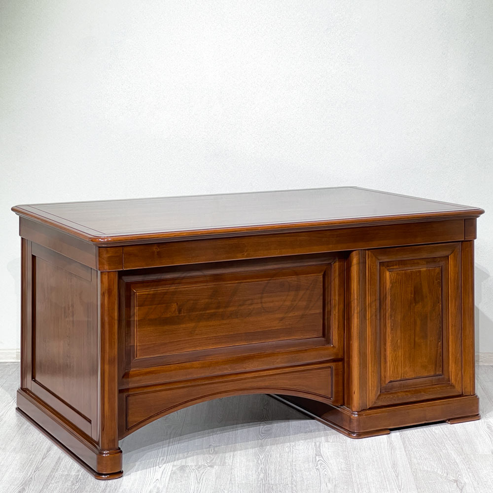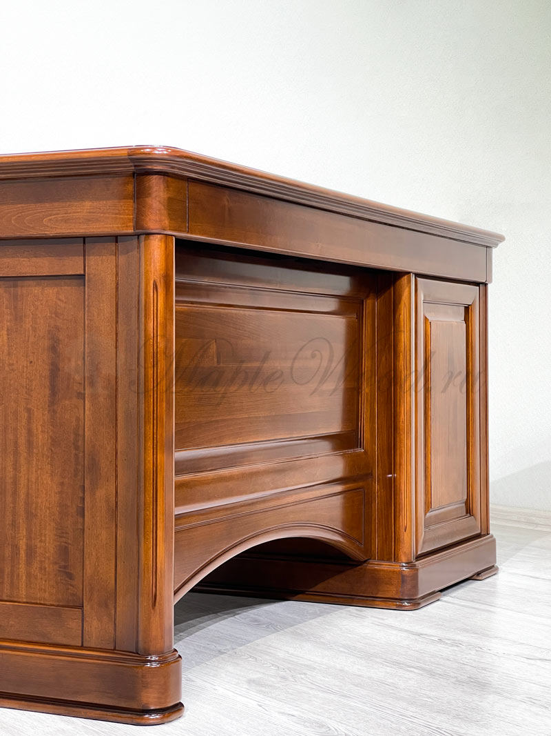 Письменный стол выполнен в классическом стиле из массива дерева и имеет двустороннюю лицевую отделку, что позволяет разместить его по центру кабинета и использовать для зонирования пространства.