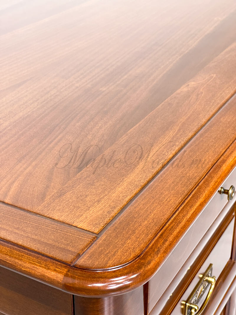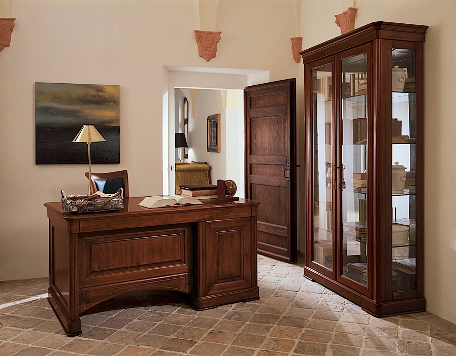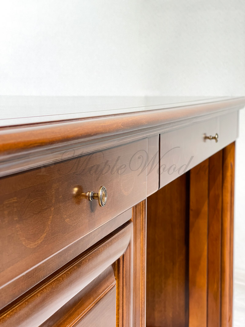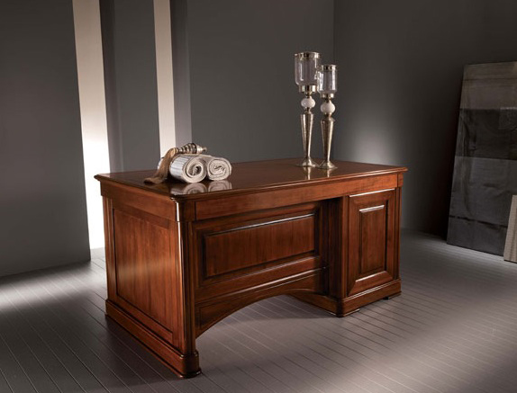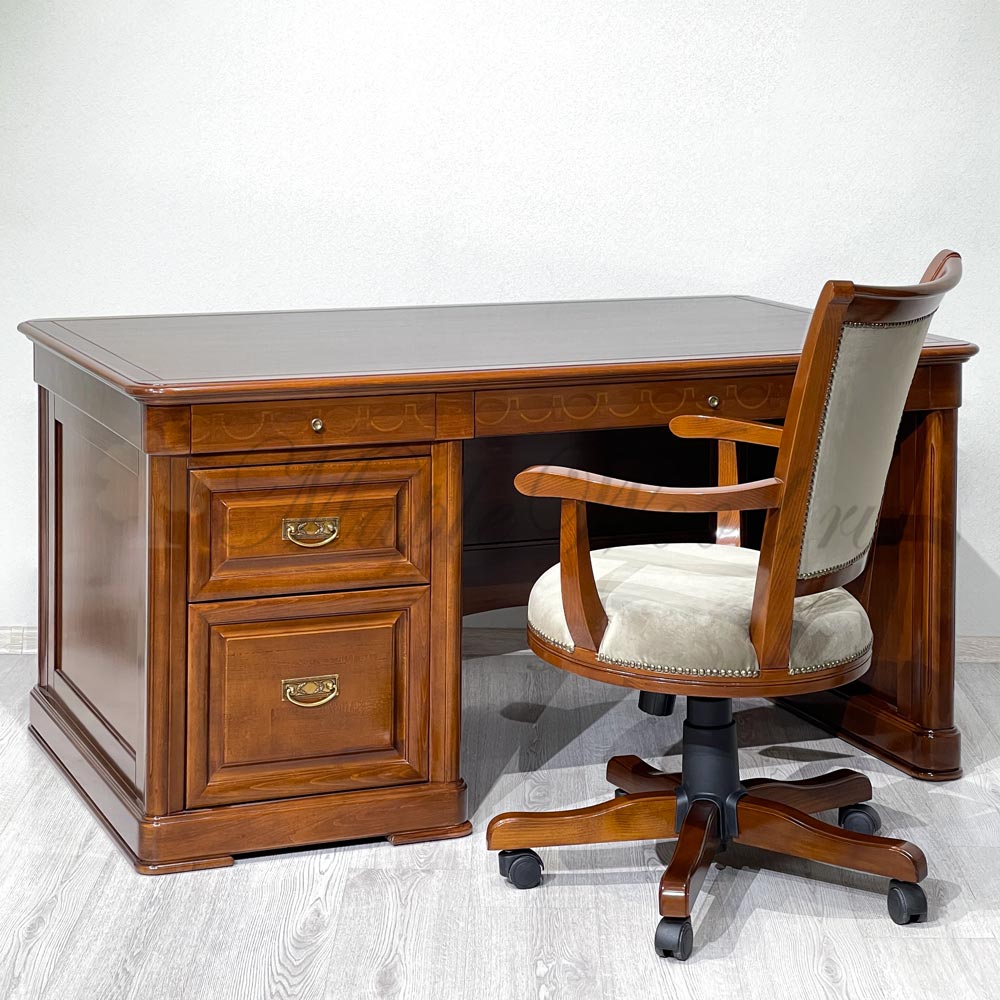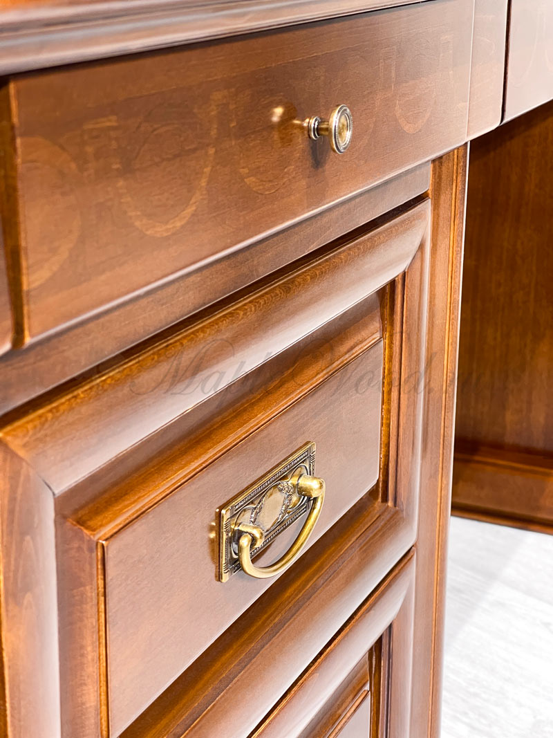 Письменный стол выполнен в классическом стиле из массива дерева и имеет двустороннюю лицевую отделку, что позволяет разместить его по центру кабинета и использовать для зонирования пространства.
