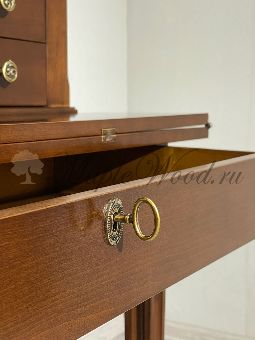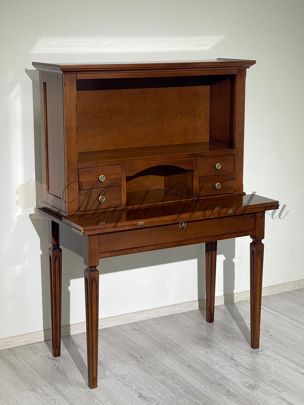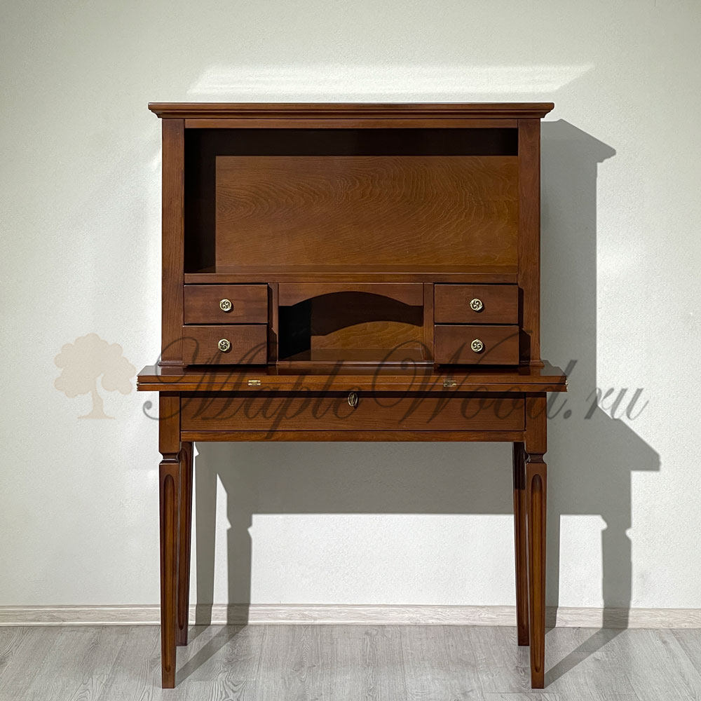 Письменный стол-секретер из коллекции Комплименти от фабрики Монте Кристо Мобили | Monte Cristo Mobili оборудован откидной столешницей, надставкой и большим выдвижным ящиком, который закрывается на ключ.