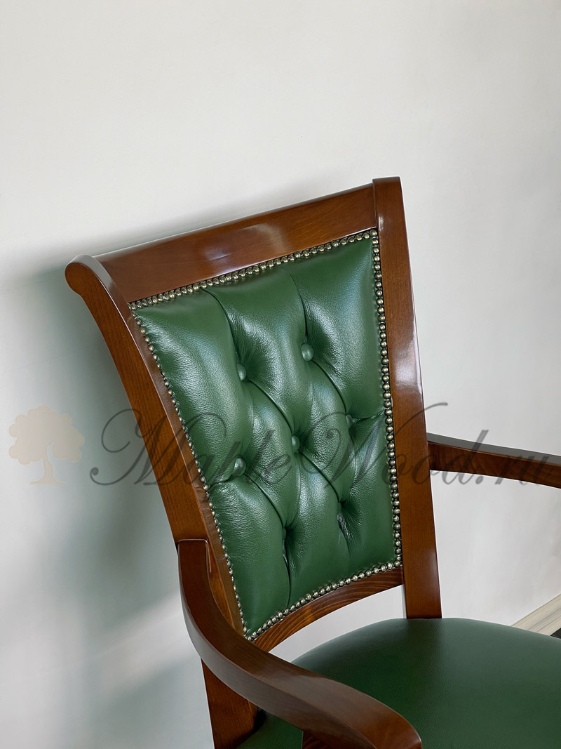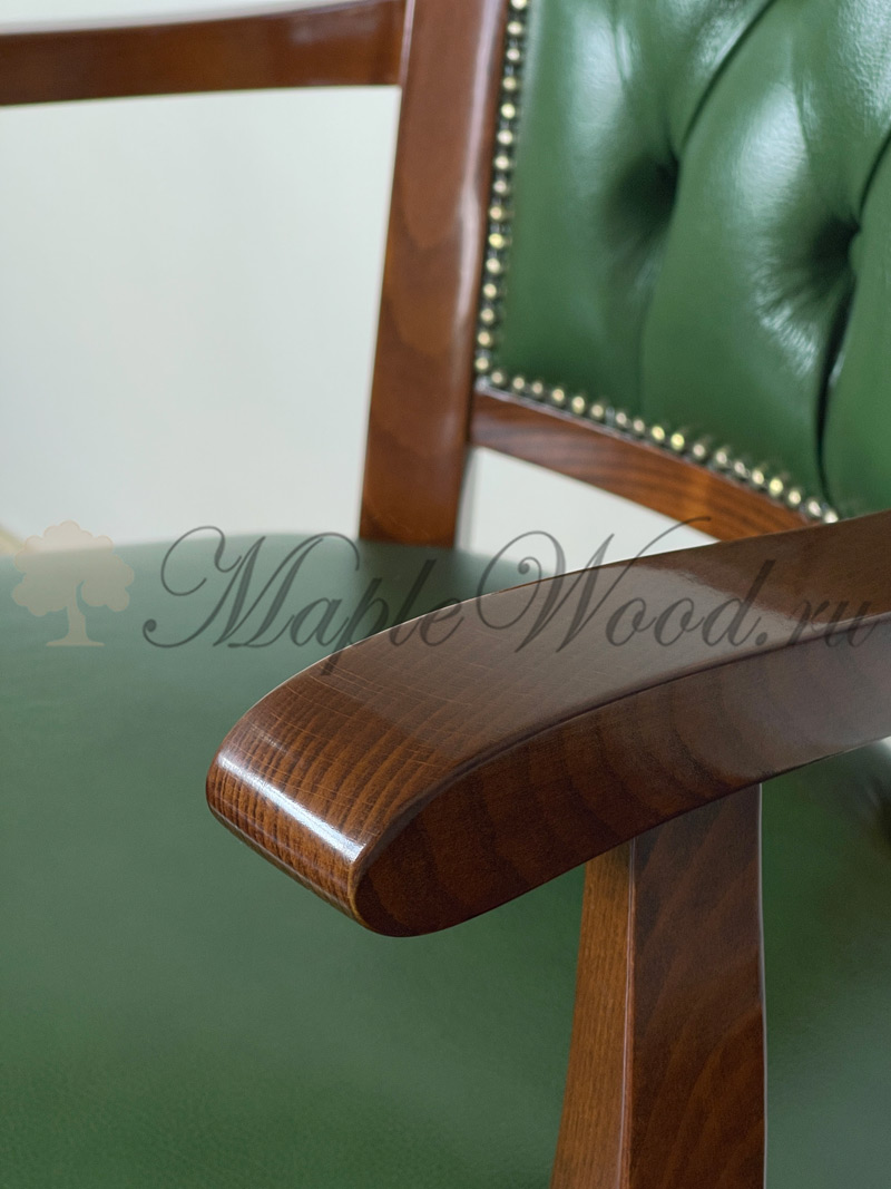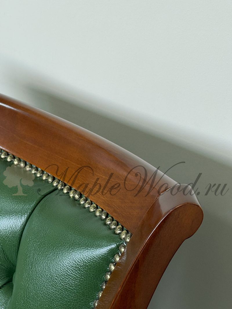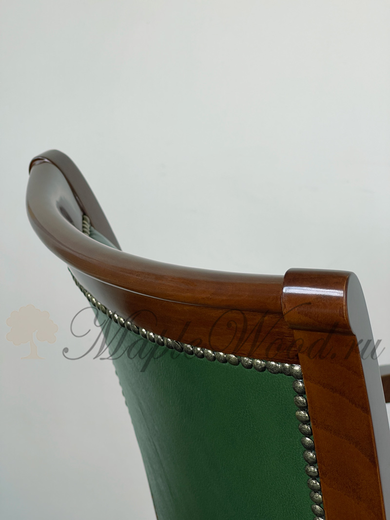 Каркас кресла выполнен из массива дерева, а в качестве обивочного материала использована натуральная кожа.