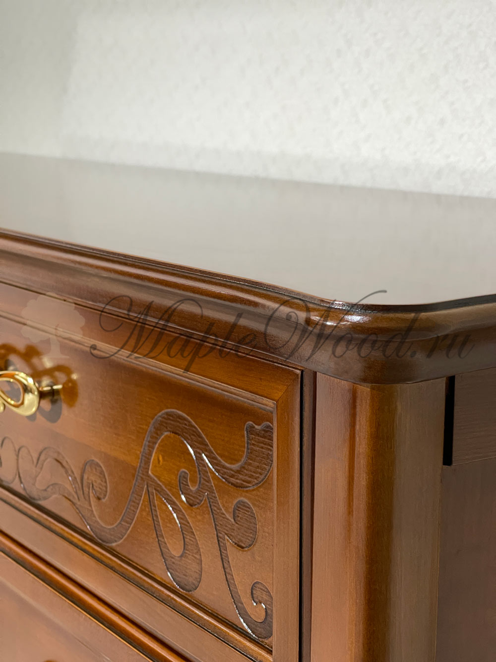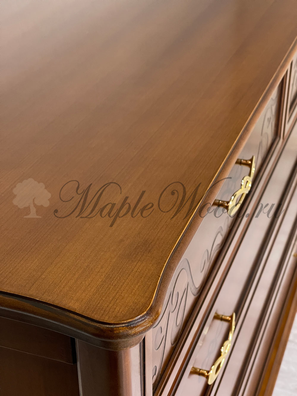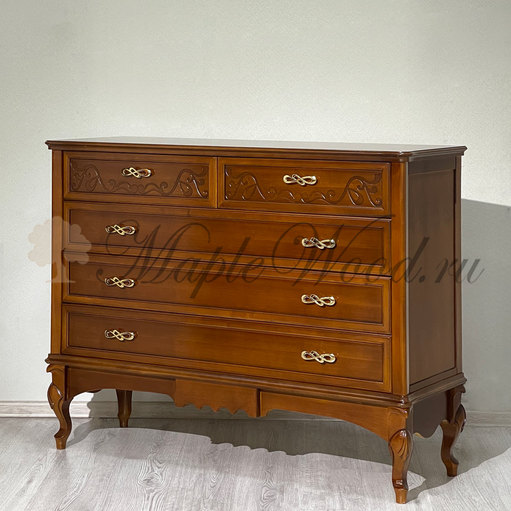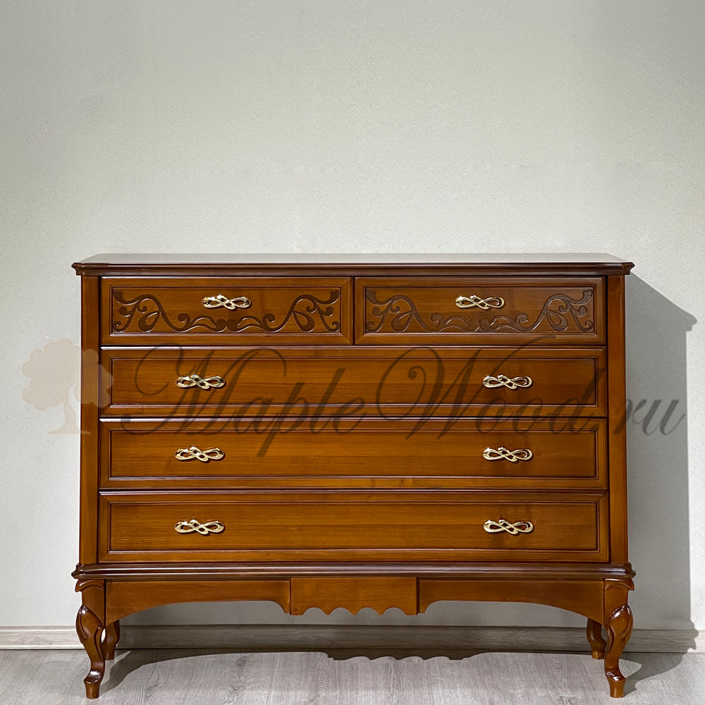 Бельевой комод для спальни из коллекции Маттео от фабрики Мобекс | Mobex выполнен в итальянском стиле из натурального массива дерева и декорирован лаконичными резными элементами, а завершает дизайн изделия качественная фурнитура в золотом цвете.