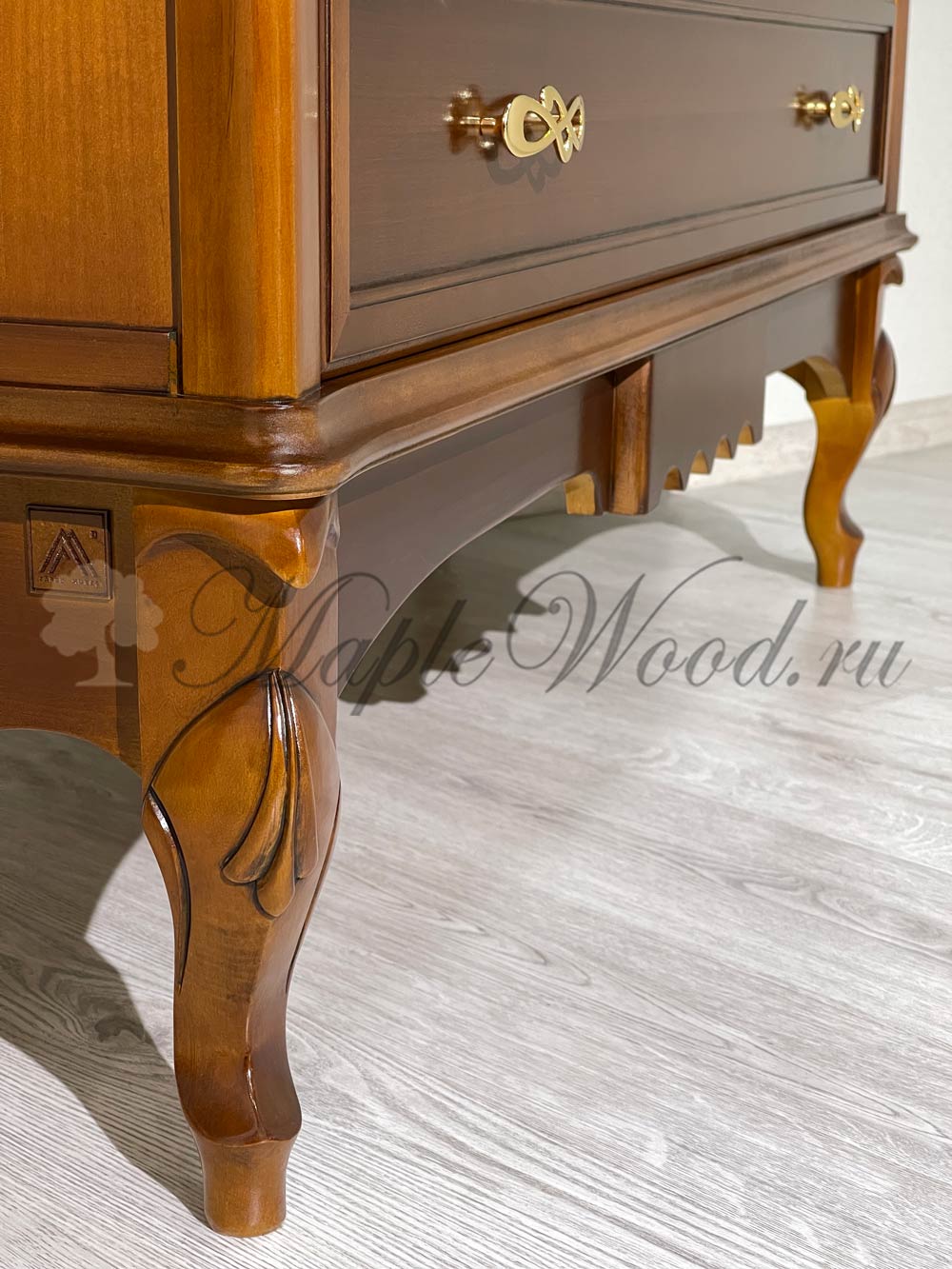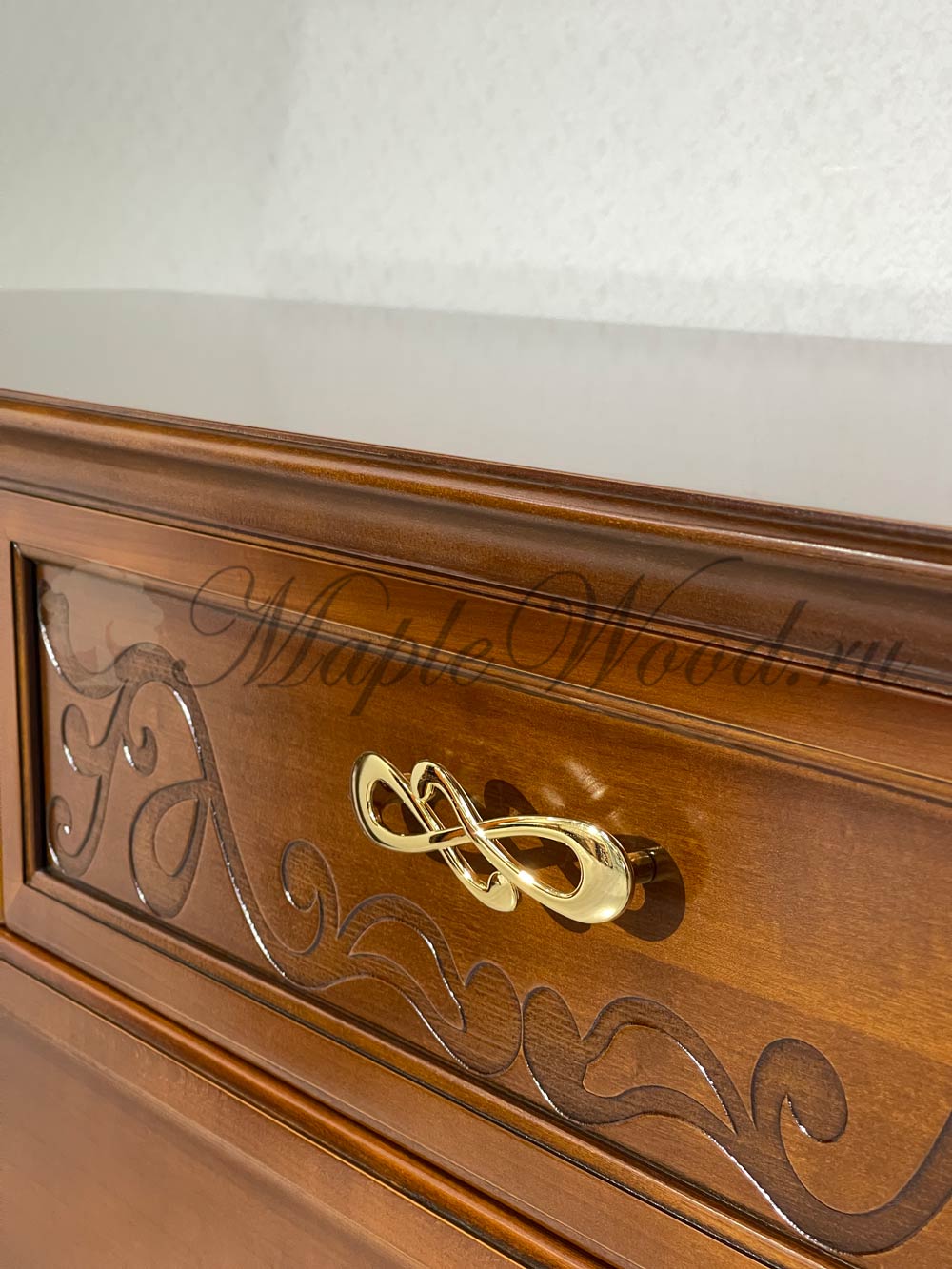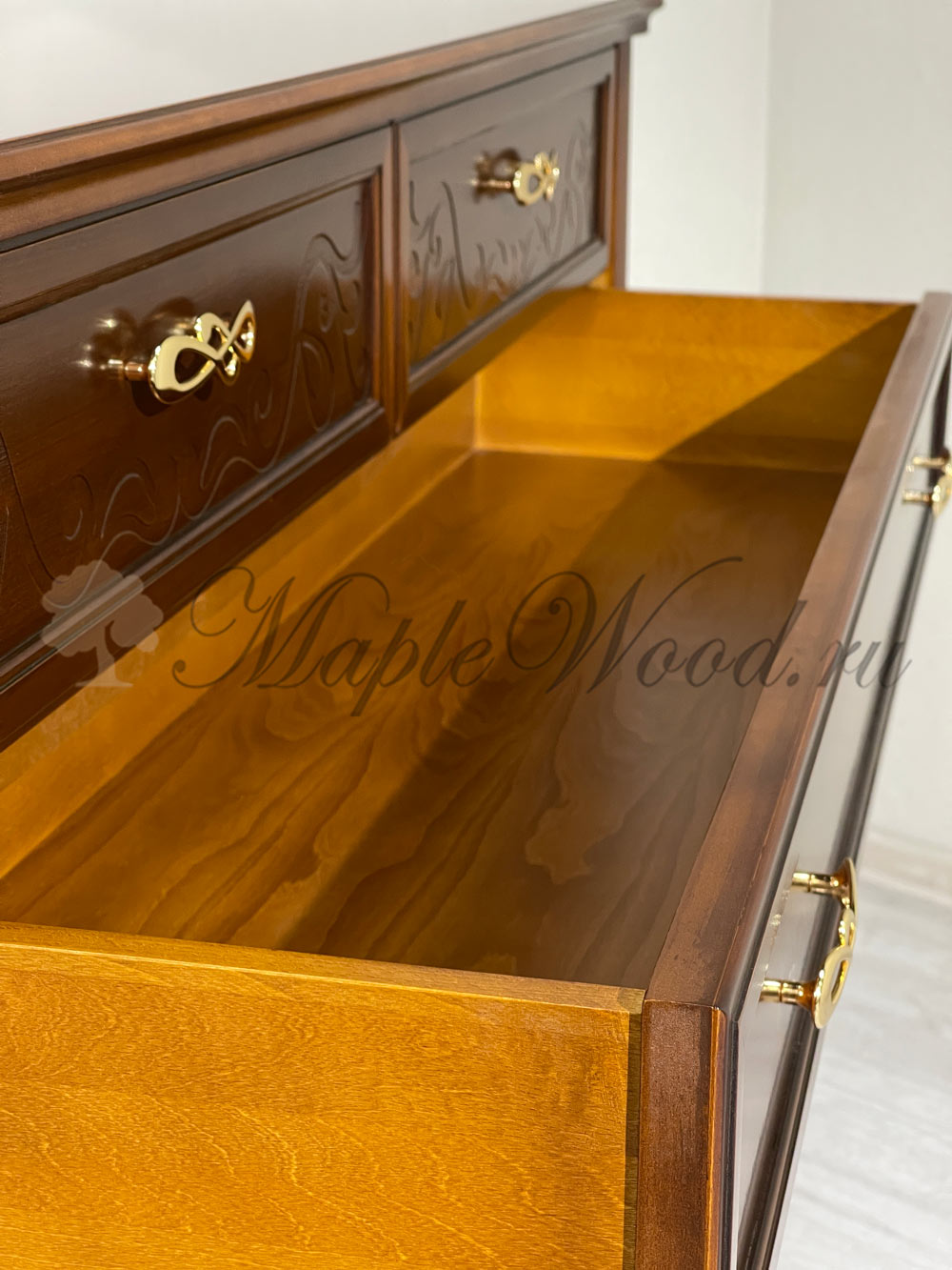 Бельевой комод для спальни из коллекции Маттео от фабрики Мобекс | Mobex выполнен в итальянском стиле из натурального массива дерева и декорирован лаконичными резными элементами, а завершает дизайн изделия качественная фурнитура в золотом цвете.