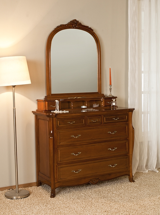 Комод оснащен пятью выдвижными ящиками, который обеспечат достаточно места для хранения белья и одежды, а зеркало обрамлено в элегантную раму и оборудовано нишей и ящиками для удобного размещения аксессуаров и украшений.