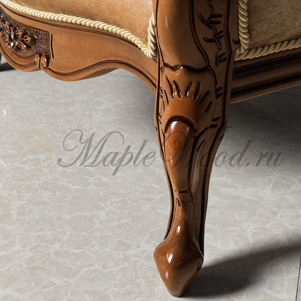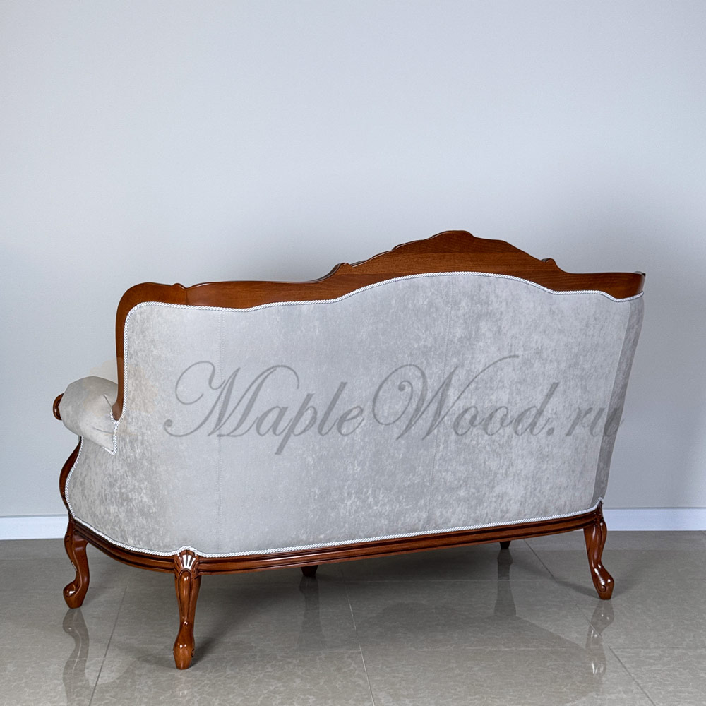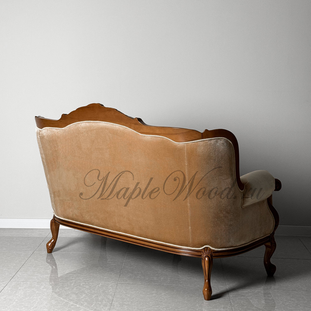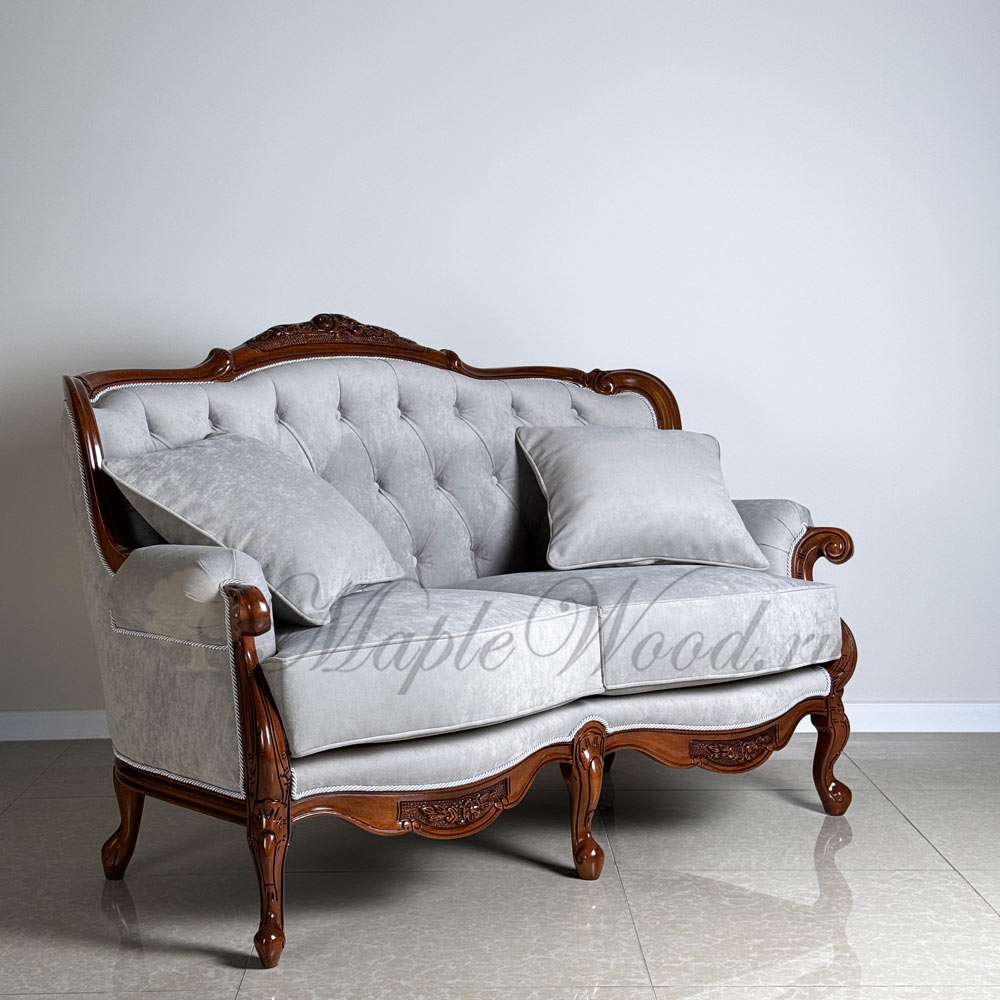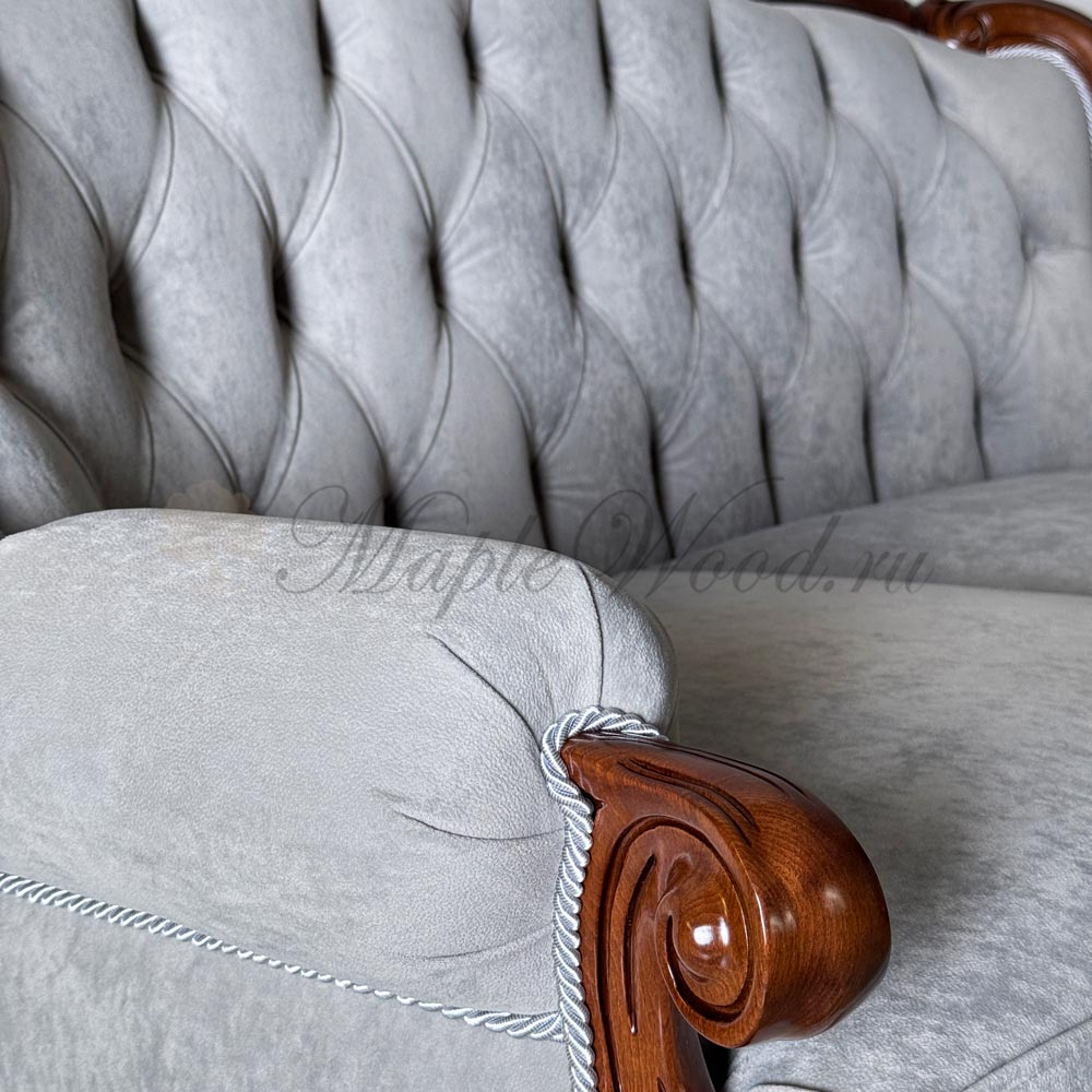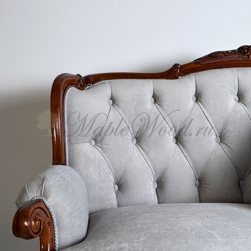 Каркас изделия изготавливается из натурального дерева и декорируется лаконичными резными элементами, а в качестве обивочного материала используется велюр премиального качества или натуральная кожа с применением техники декорирования «каретная стяжка», а завершает дизайн дивана, акцентный кант, обрамляющий края спинки, сидений и подлокотников.