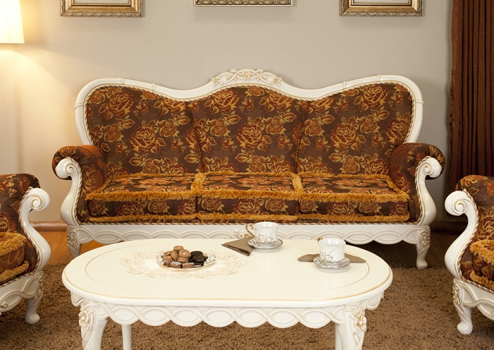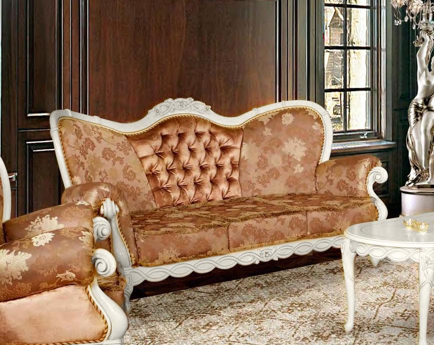 Классический 3-х местный диван на ножках из коллекции Флора от фабрики Simex очаровывает своей изогнутой формой и элегантной отделкой, которая включает контрастную патину и художественную резьбу с цветочным мотивом.