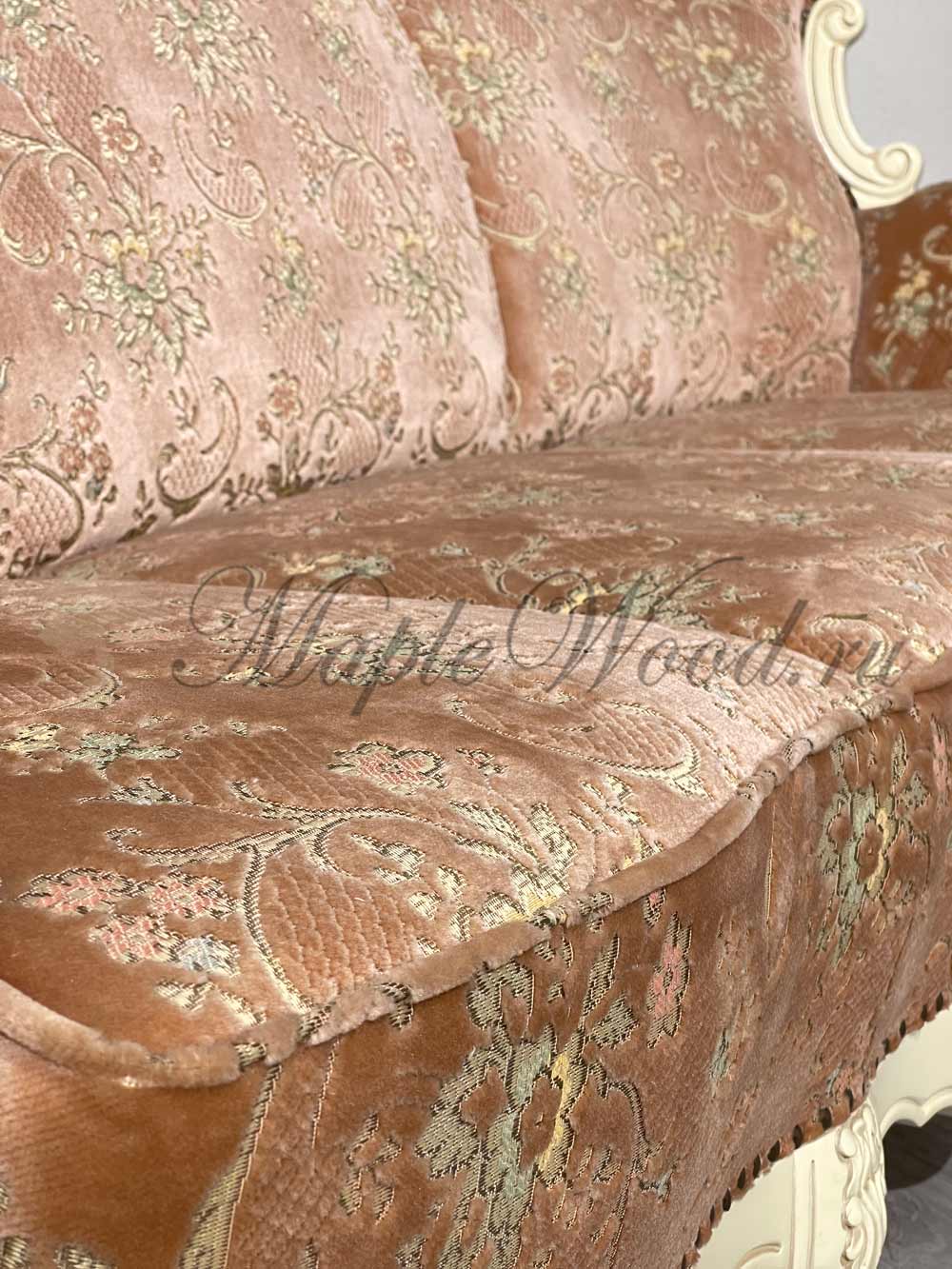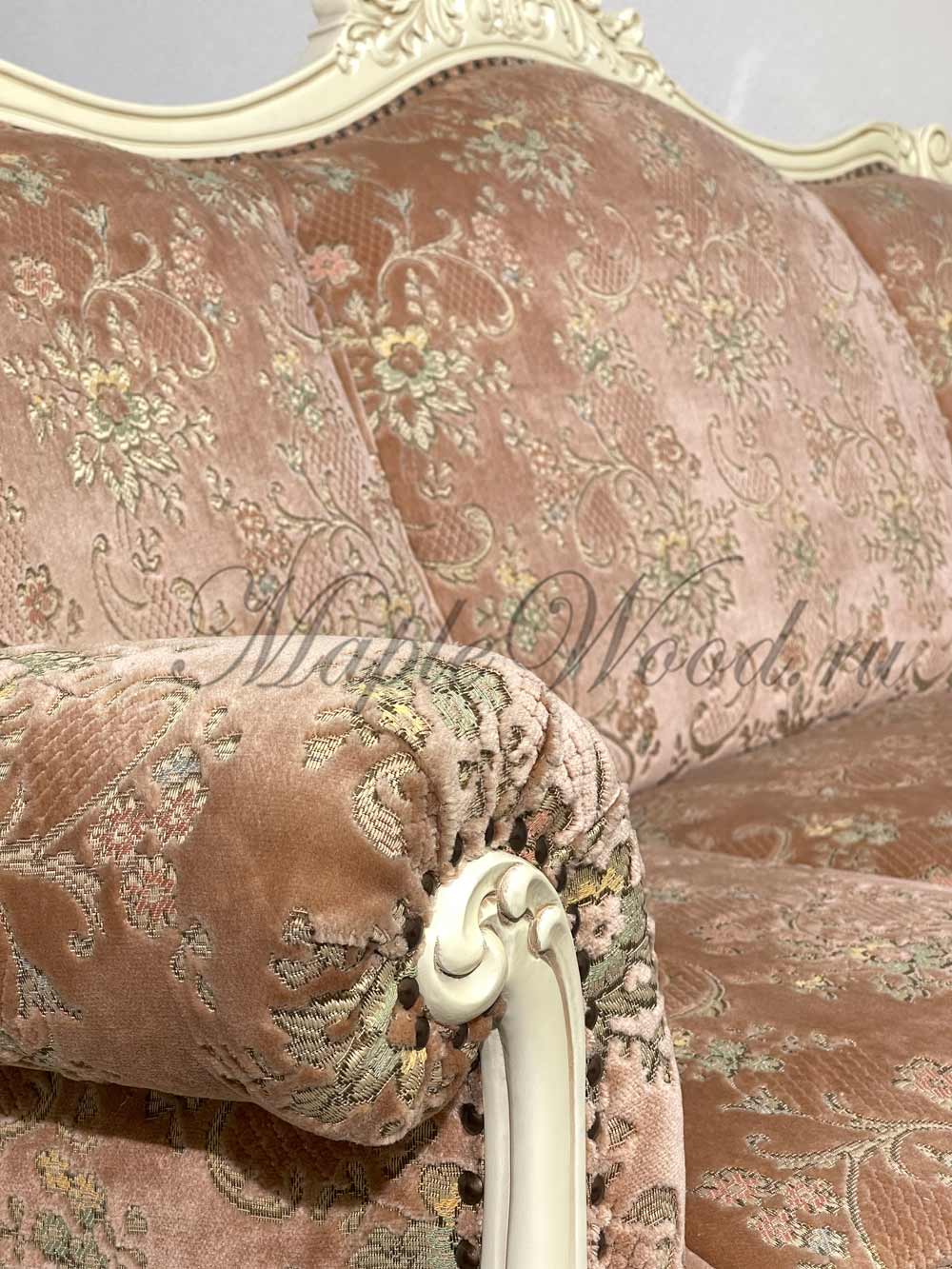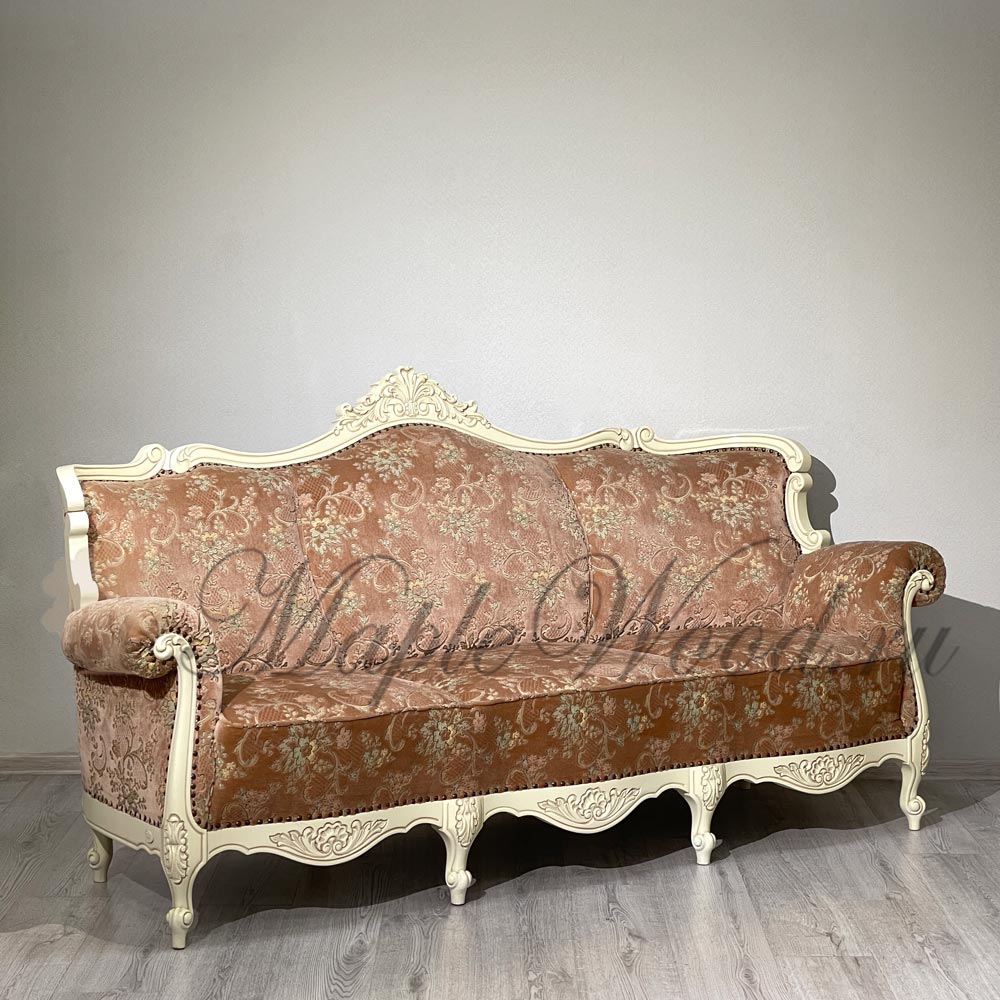 Диван из коллекции Могадор от фабрики Мобекс | Mobex имеет изогнутый каркас из натурального массива дерева в светлом оттенке «слоновая кость», мягкие подлокотники и удобную посадку, которая обеспечит комфортный отдых.