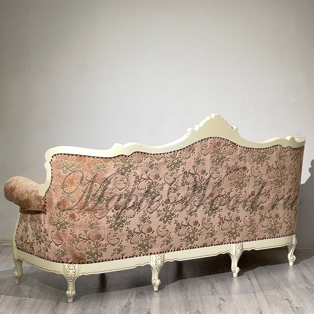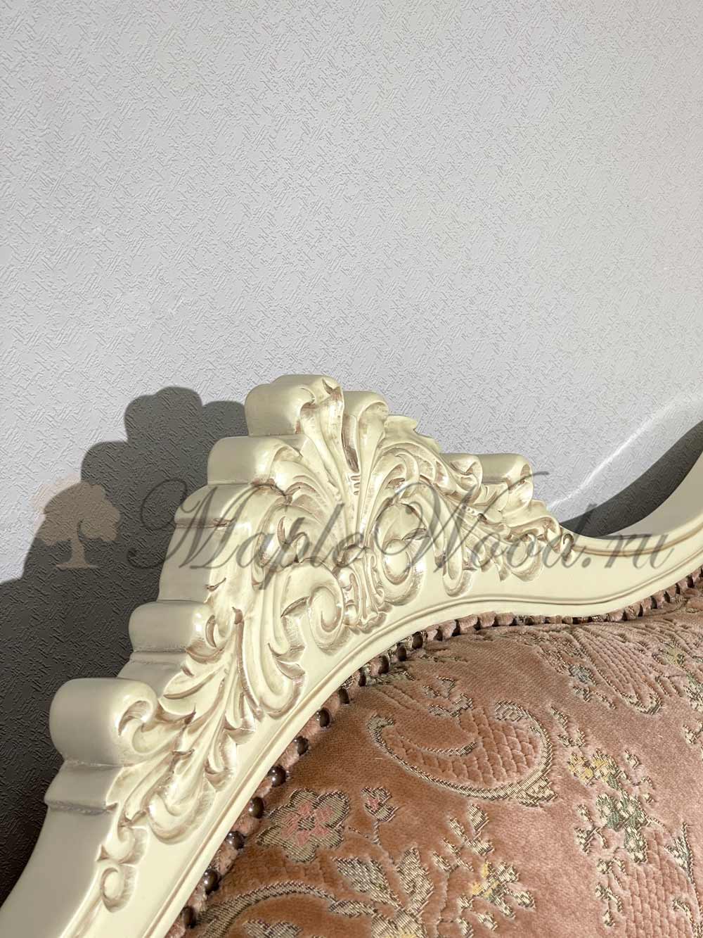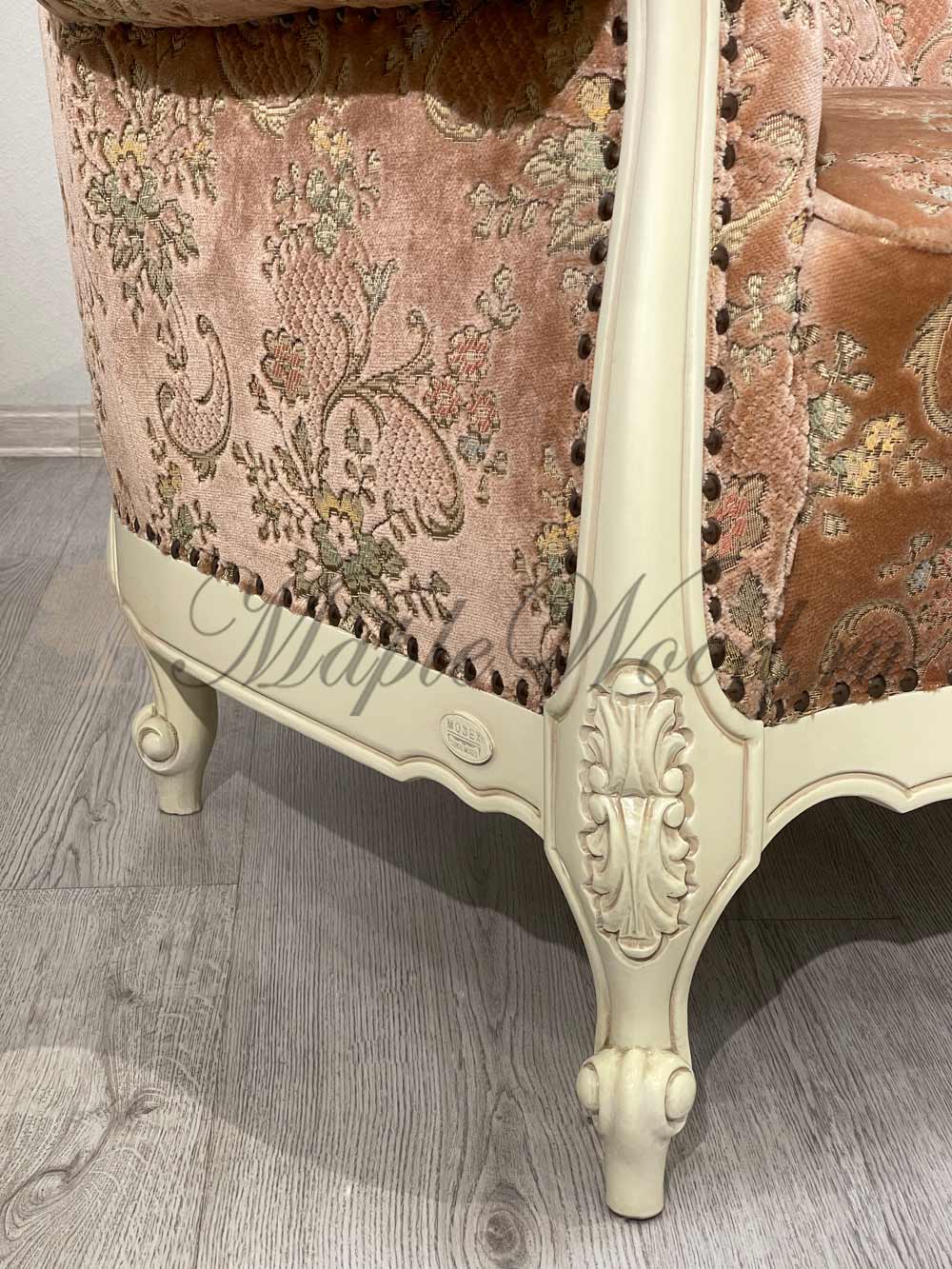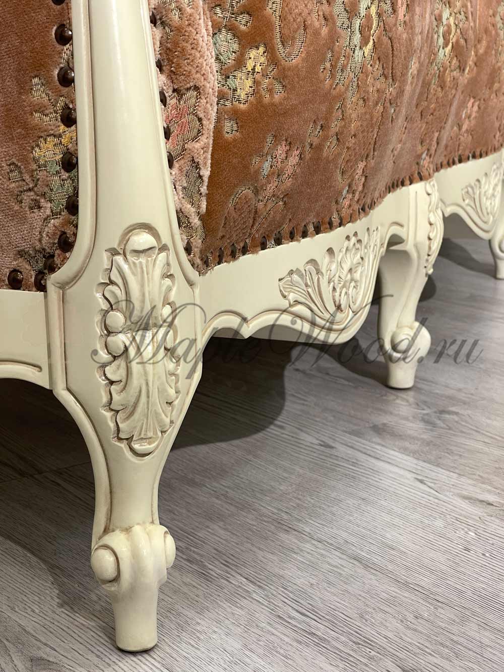 Диван из коллекции Могадор от фабрики Мобекс | Mobex имеет изогнутый каркас из натурального массива дерева в светлом оттенке «слоновая кость», мягкие подлокотники и удобную посадку, которая обеспечит комфортный отдых.