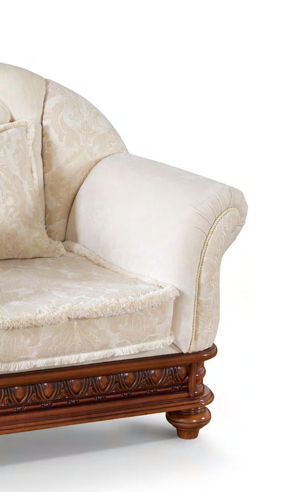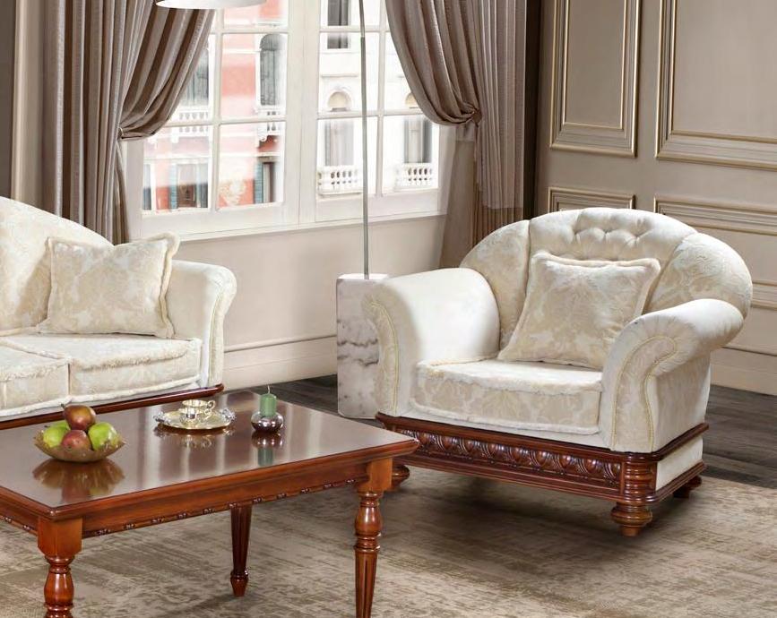 Классическое кресло для гостиной из коллекции Венеция Люкс от фабрики Simex очаровывает своей пышной формой с плавными округлыми линиями и эффектной отделкой, которая сочетает в себе каретную стяжку, обрамляющую бахрому и художественную резьбу ручной работы, которая подчеркивает роскошный внешний вид изделия.
