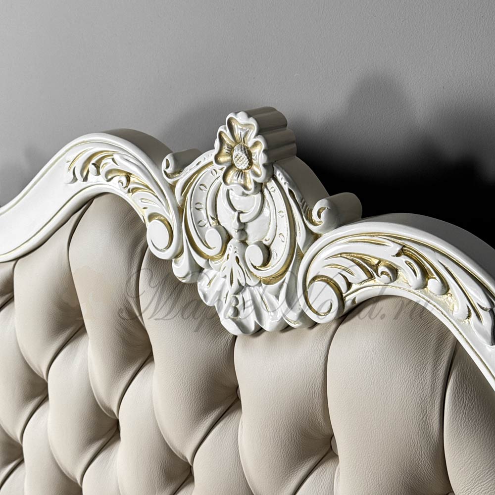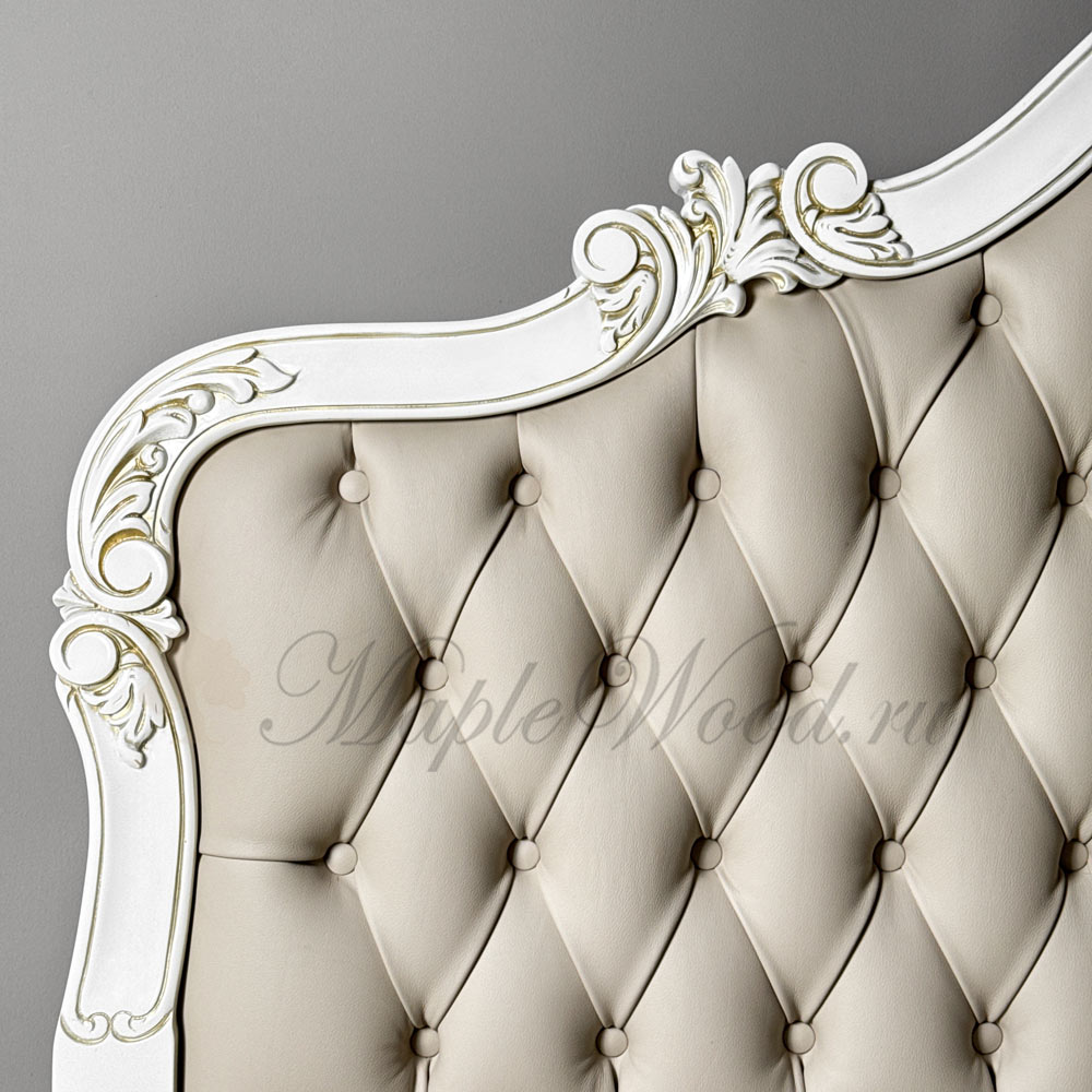 Особенность модели — большое изголовье, обтянутое натуральной кожей с декоративными пуговицами (каретная стяжка), что придаёт кровати благородный объём и классический стиль.