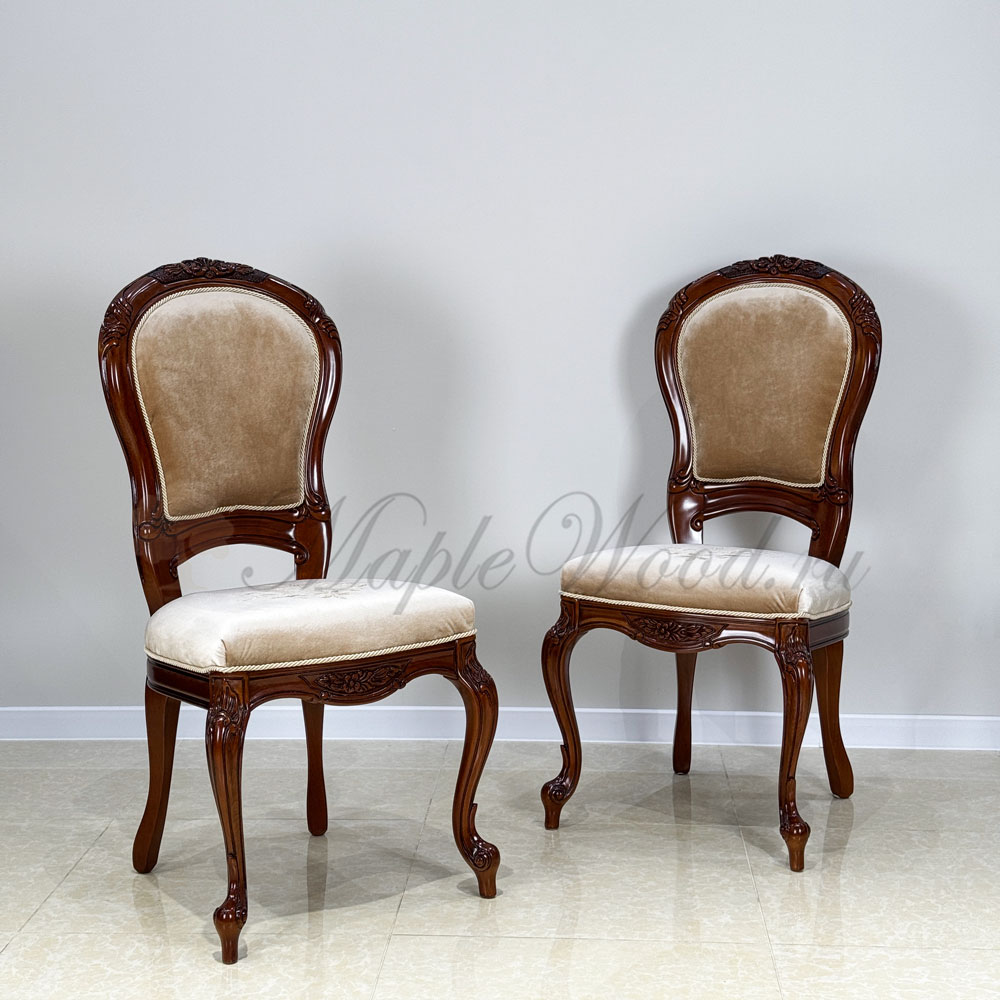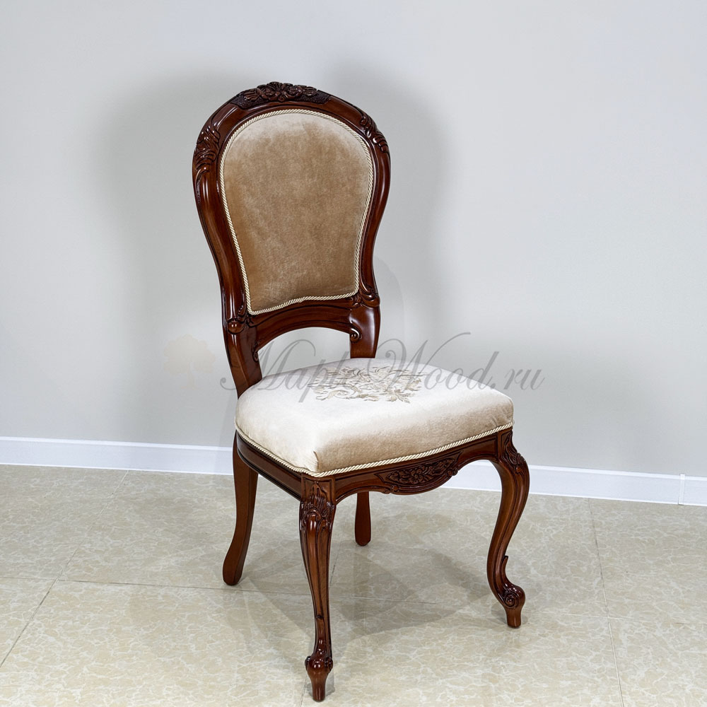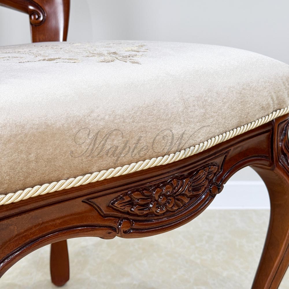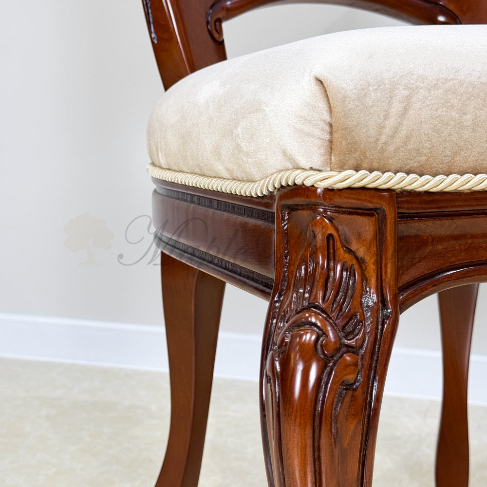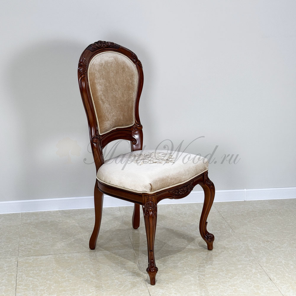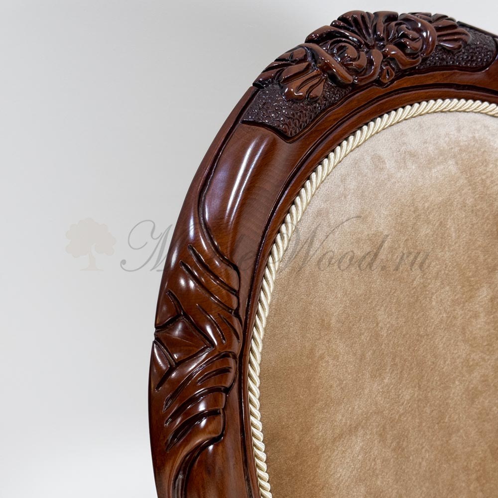 Каркас изделия выполнен из натурального массива дерева и украшен искусной резьбой, в качестве обивочного материала использована велюровая ткань в бежевом оттенке.