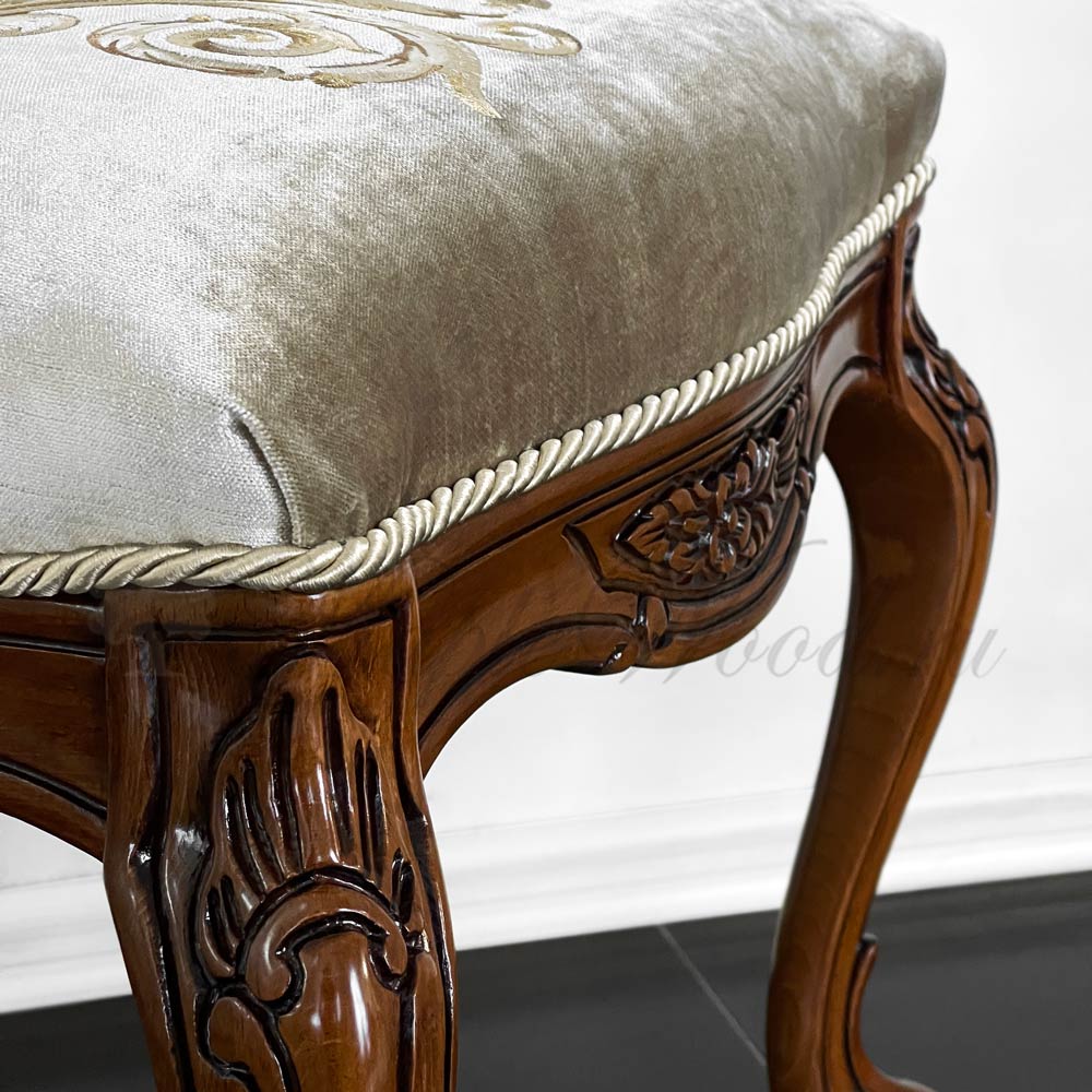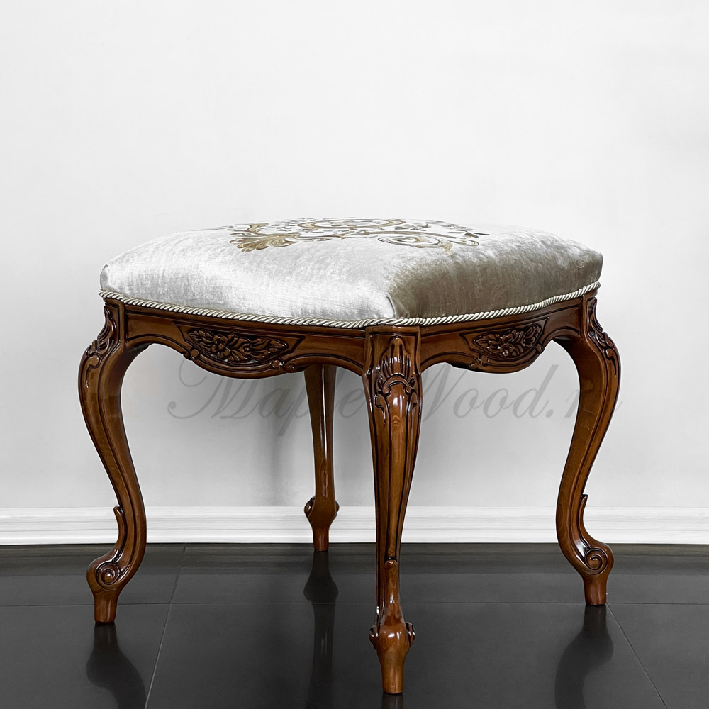 Каркас изделия выполнен из массива дерева и декорирован резными элементами, а в качестве обивочного материала использован велюр в оливковом оттенке.