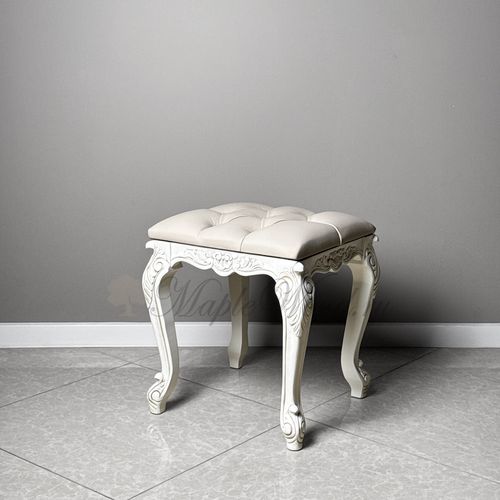 Резной каркас из массива дерева представлен в светлом оттенке и декорирован золотой патиной, что придаёт модели благородство и лёгкое сияние.