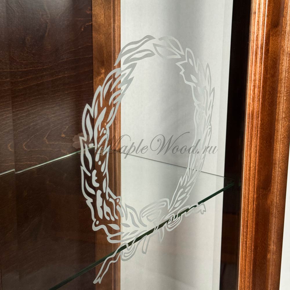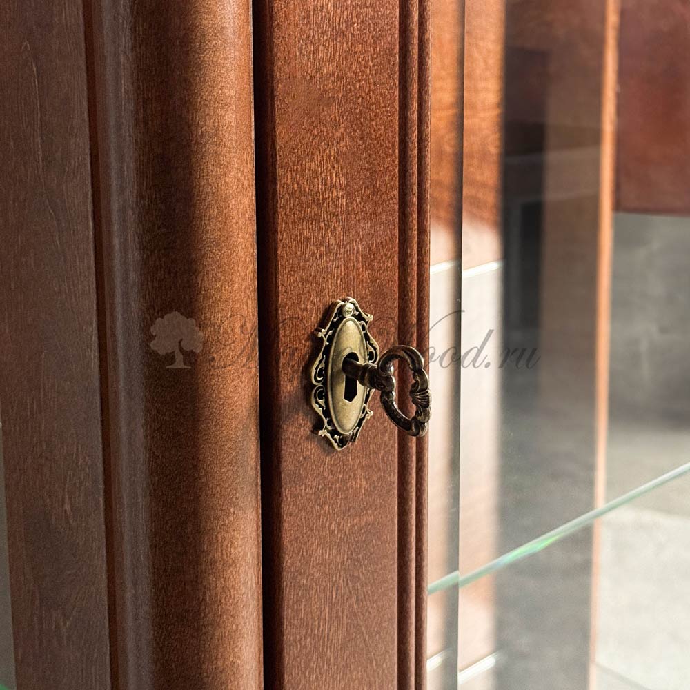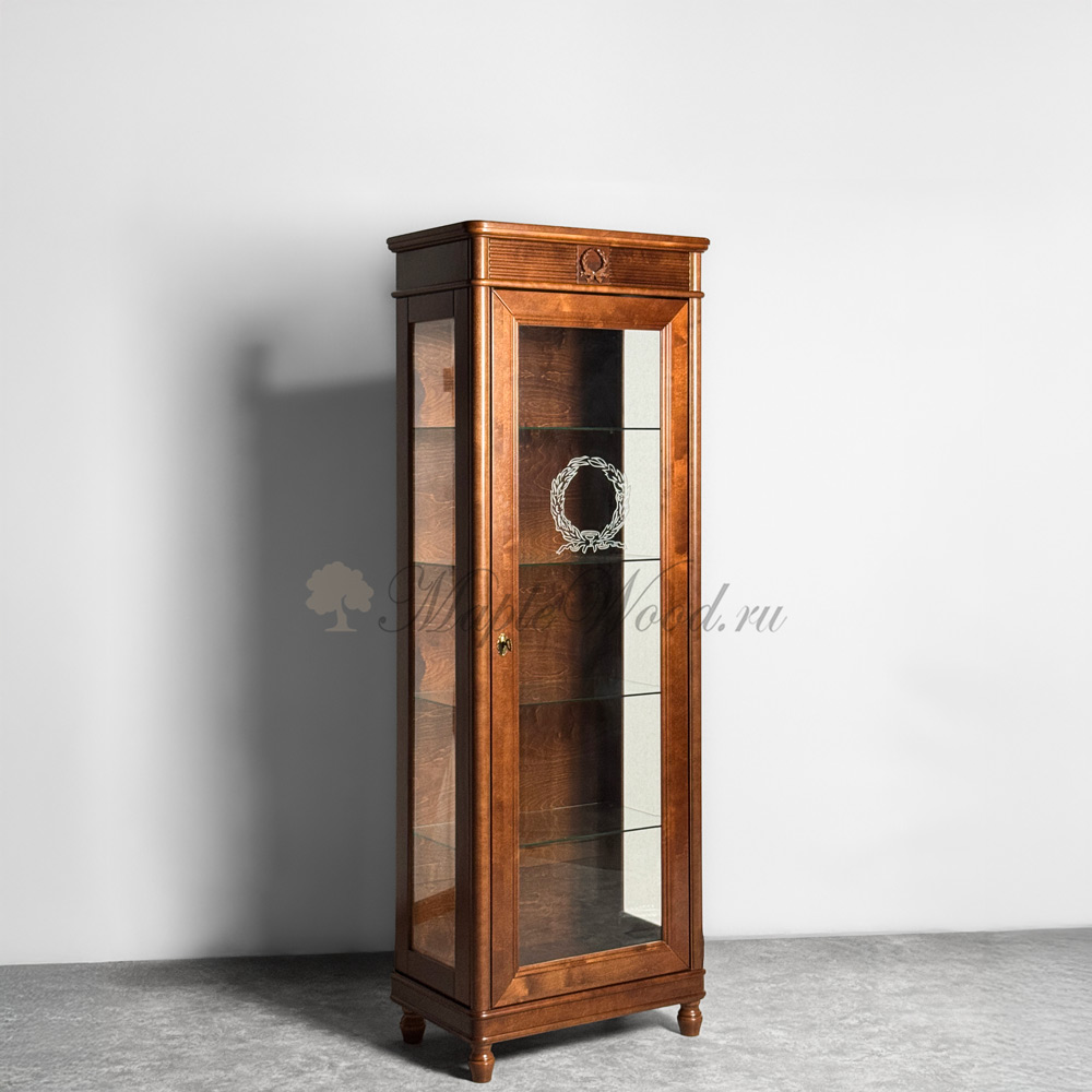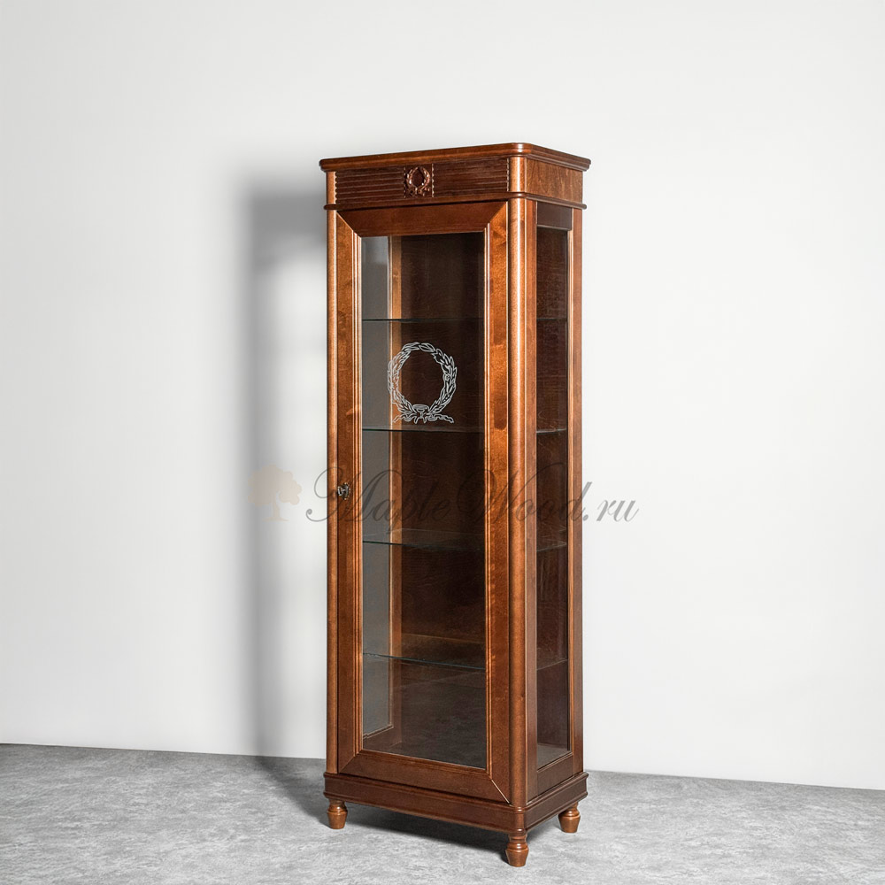 Однодверная витрина для гостиной, выполненная из массива карельской березы и произведённая в Беларуси, является репликой известной коллекции Мария Сильва от румынского производителя Monte Cristo Mobili.