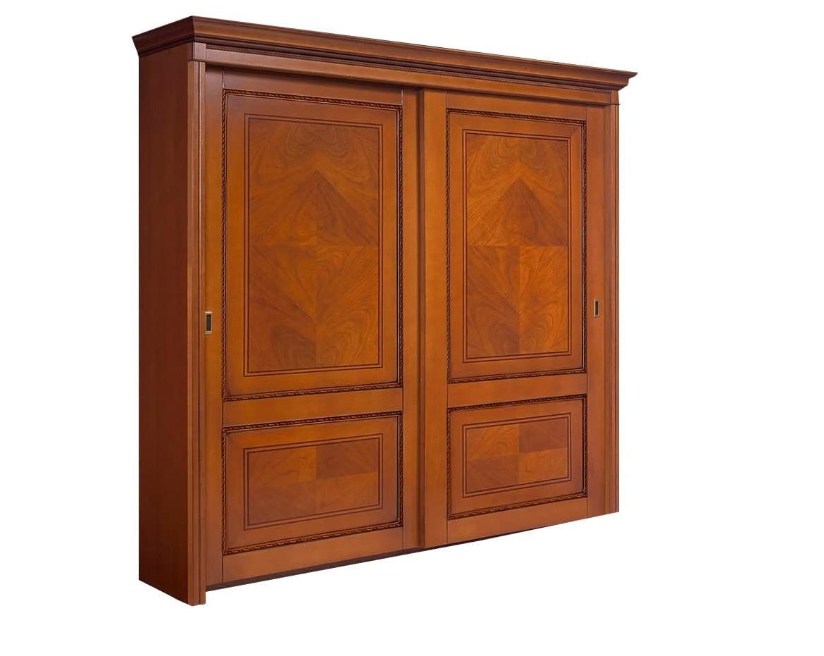 Классический шкаф-купе из коллекции Неаполь от фабрики Тимбер выполнен из шпонированного МДФ с элементами из массива дерева и декорирован эффектной инкрустацией и контрастной патиной, которая завершает дизайн изделия.