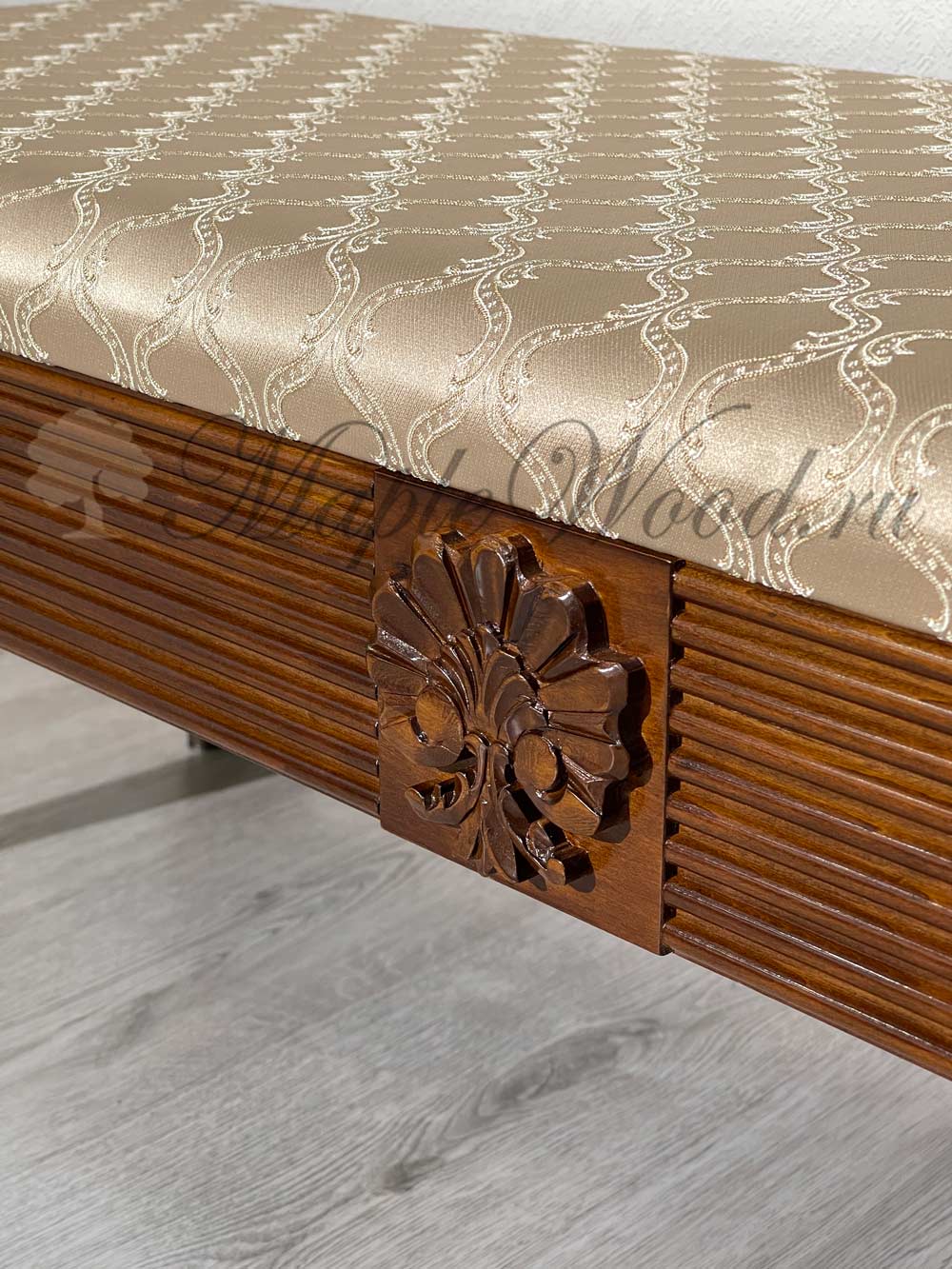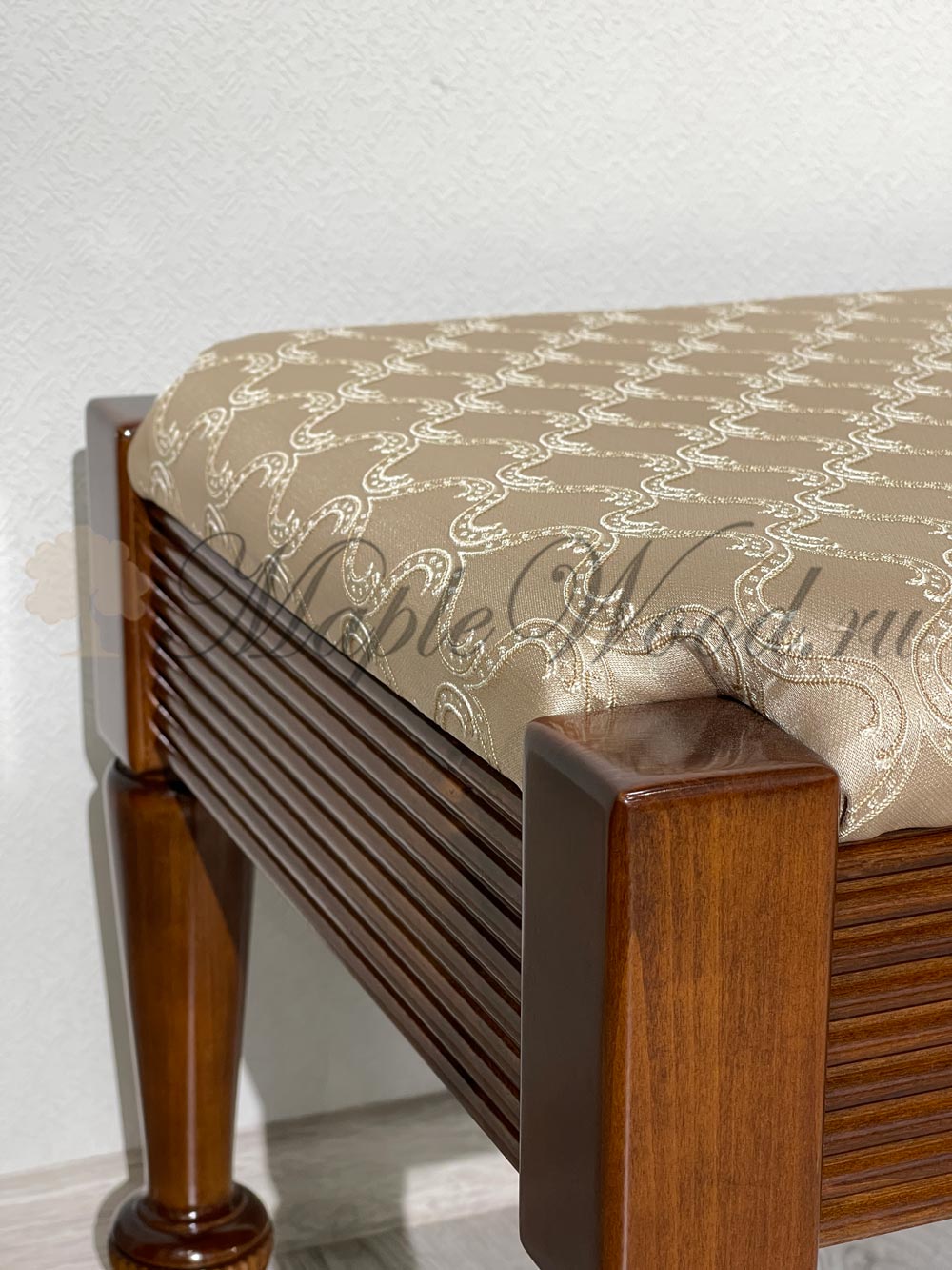 Каркас изделия изготавливается из натурального массива дерева, а обивка сиденья на объёмном слое наполнителя предоставляется на выбор из каталога фабрики.
