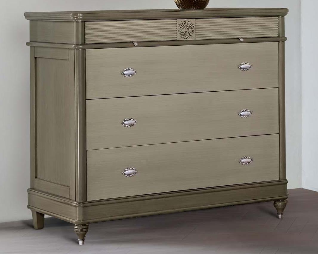 Комод от спального гарнитура Бурбон от фабрики Monte Cristo Mobili выполнен из натурального дерева в нестандартном оливковом оттенке и декорирован фирменной эмблемой и акцентной фрезеровкой, которая подчеркивает оригинальность изделия.