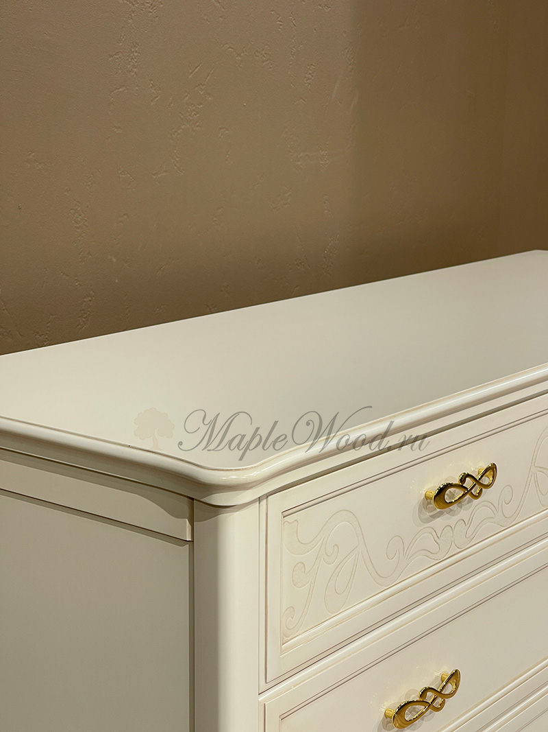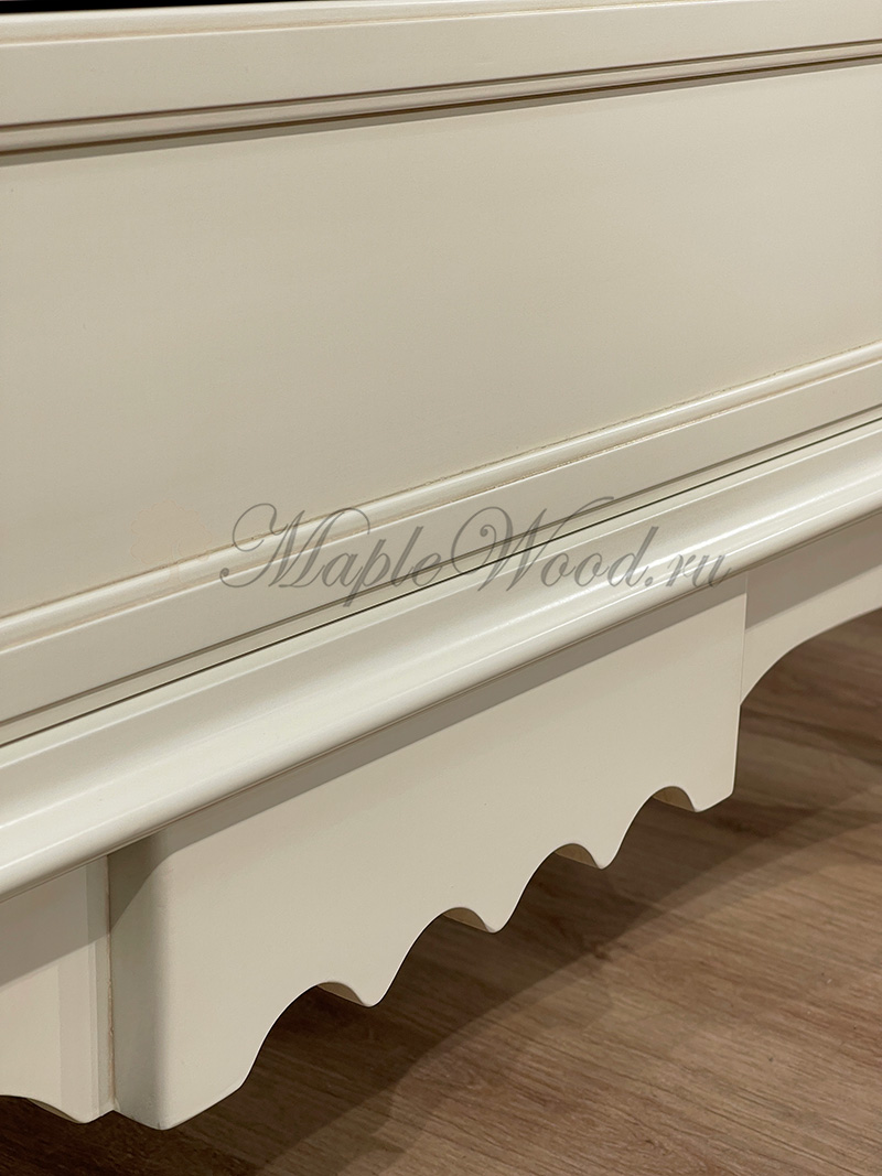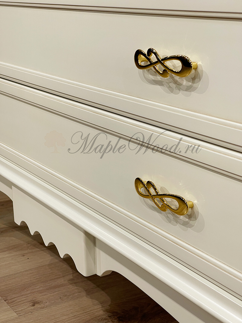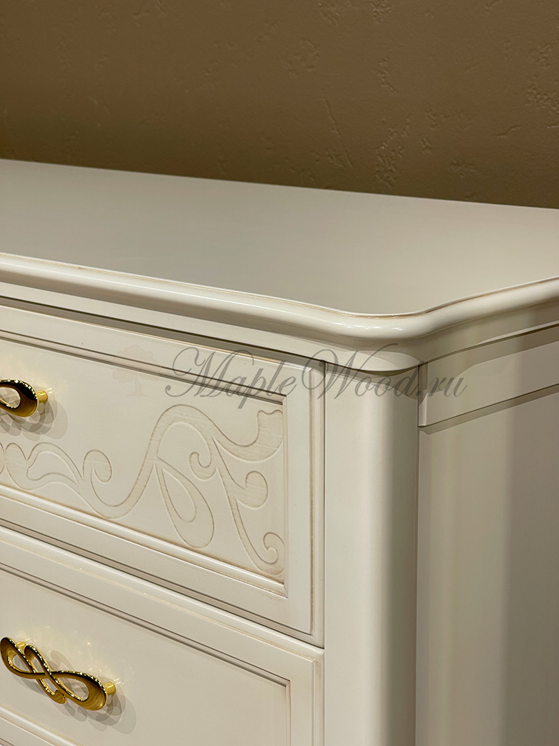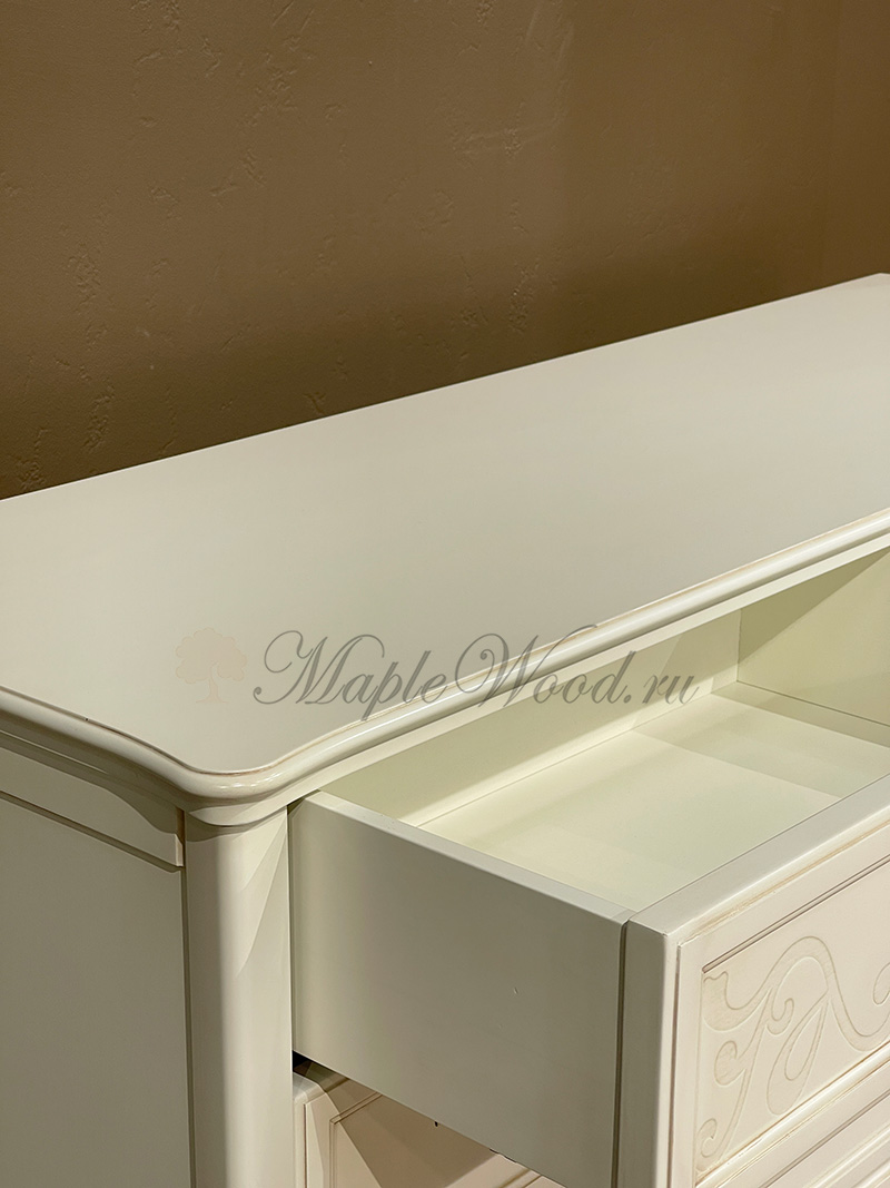 Комод выполнен из натурального дерева в светлом оттенке «слоновая кость» и декорирован контрастной патиной, которая подчеркивает оригинальность изделия.