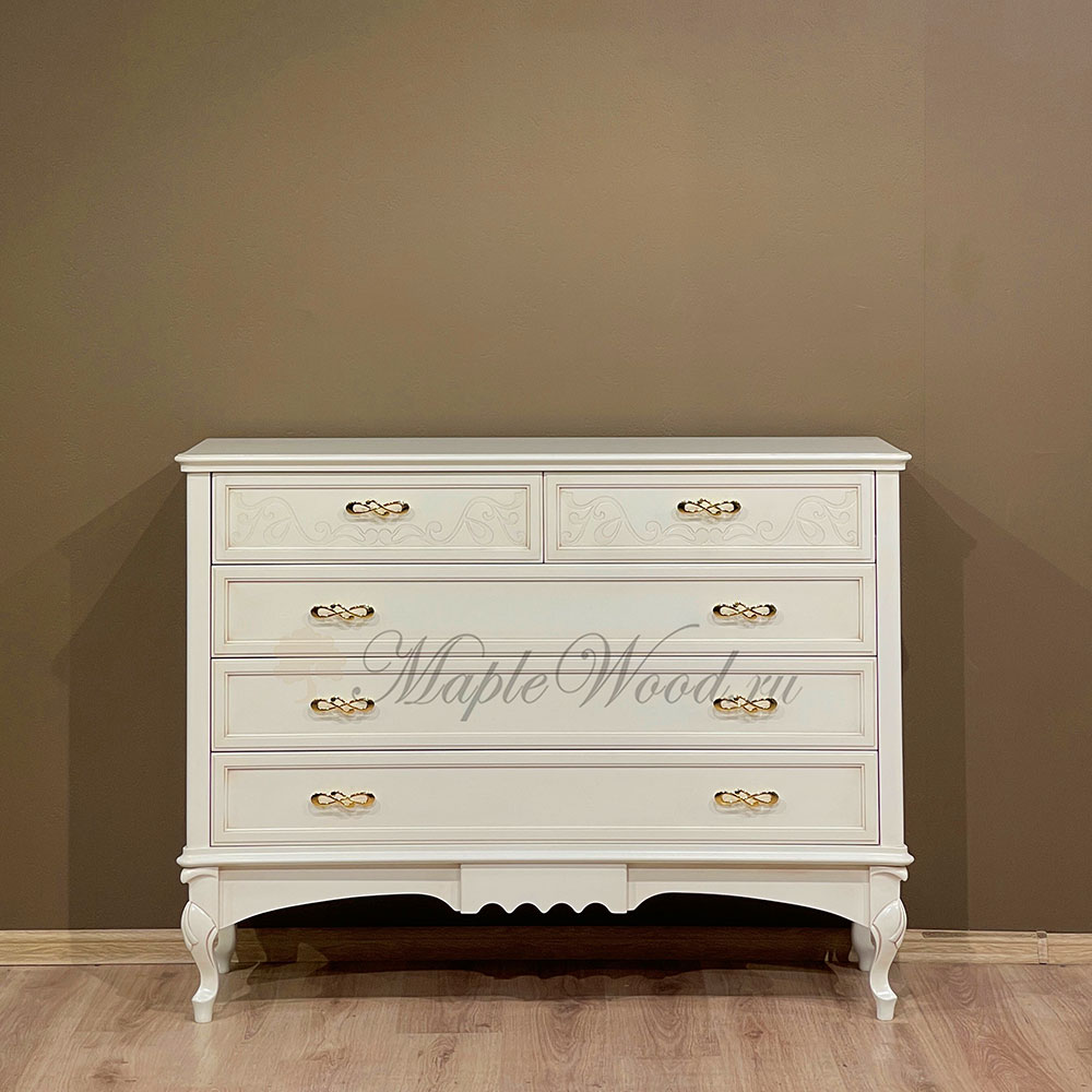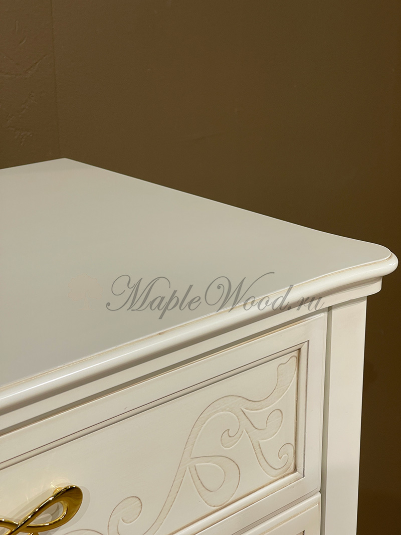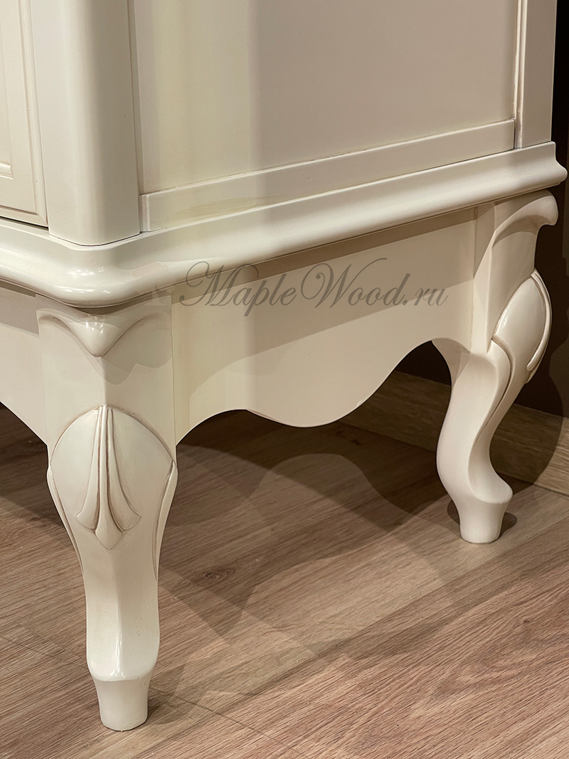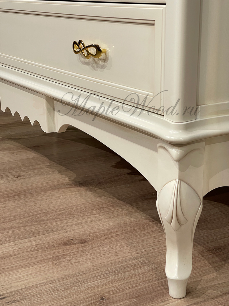 Комод выполнен из натурального дерева в светлом оттенке «слоновая кость» и декорирован контрастной патиной, которая подчеркивает оригинальность изделия.