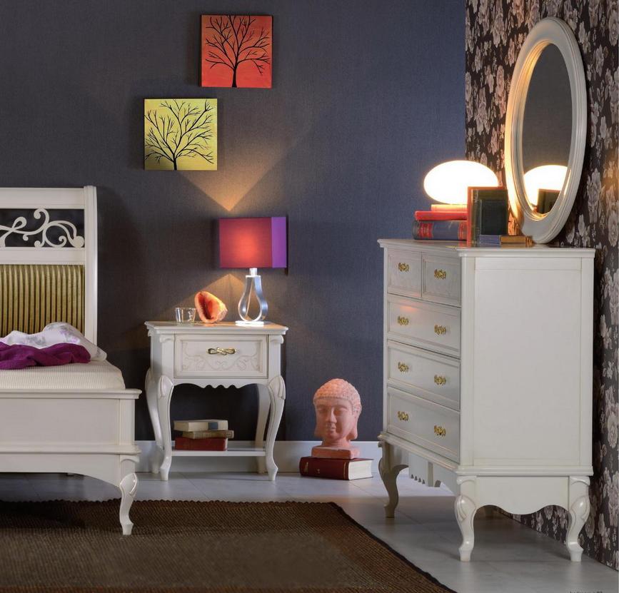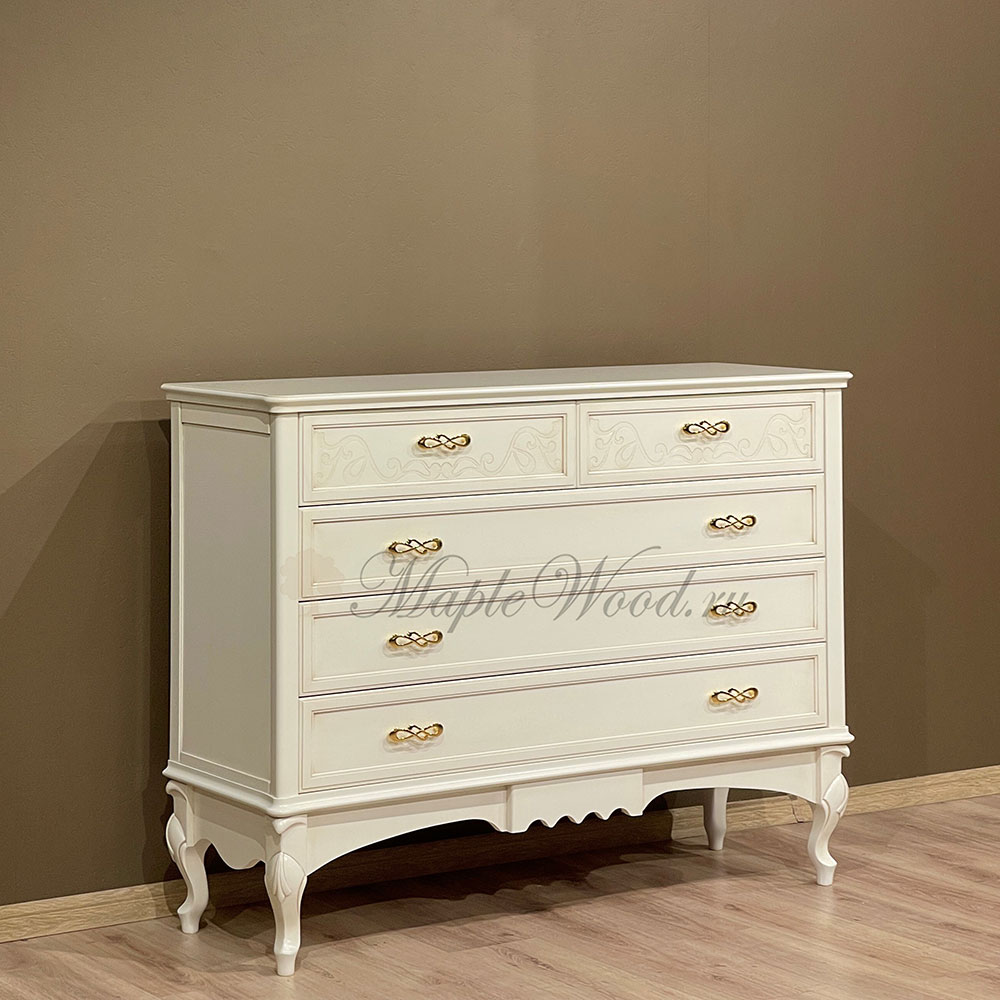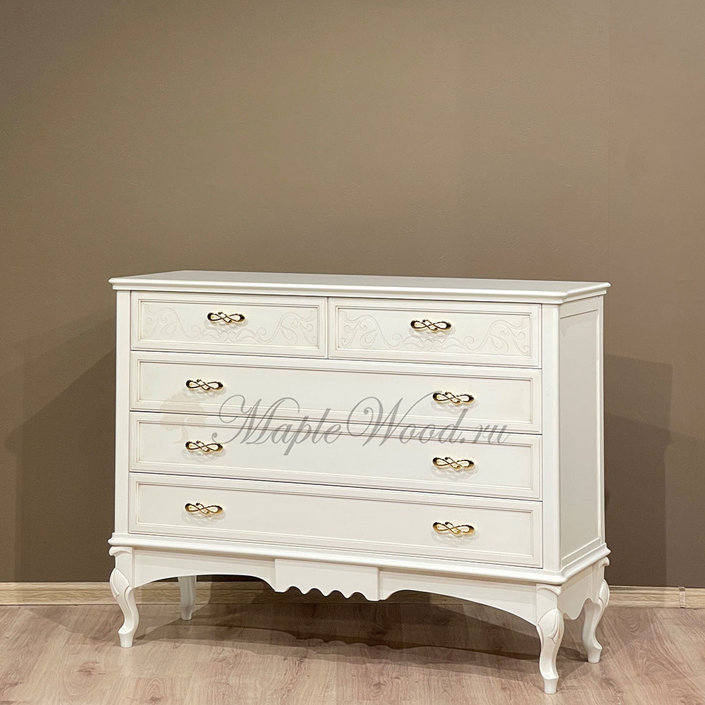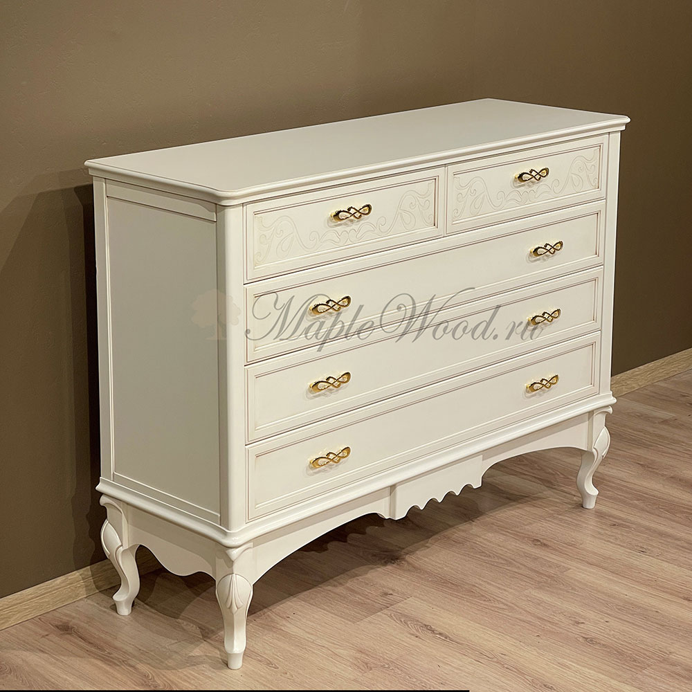 Комод на фигурных ножках от спального гарнитура Маттео от фабрики Мобекс | Mobex оборудован пятью вместительными ящиками для удобного хранения белья и одежды.