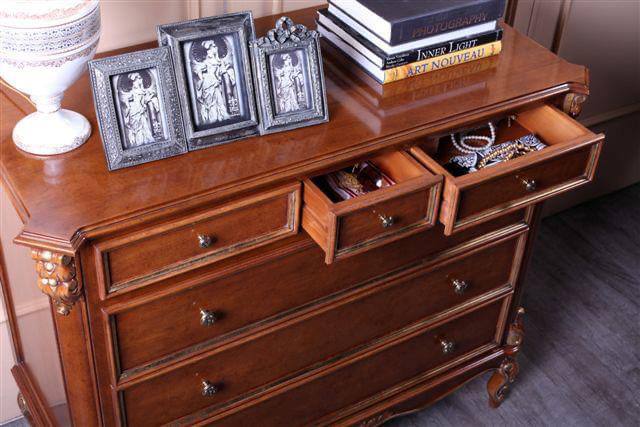 Изделие выполнено из массива дерева, украшено резьбой и элегантными металлическими ручками, такое сочетание декора создает вневременной образ комода, который станет украшением любой спальни, оформленной в классическом стиле.