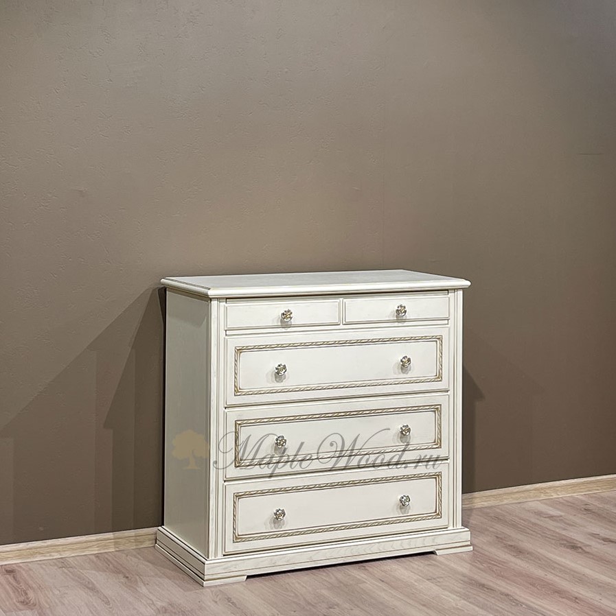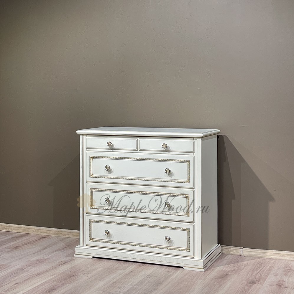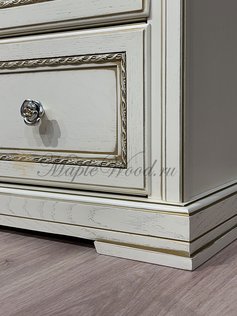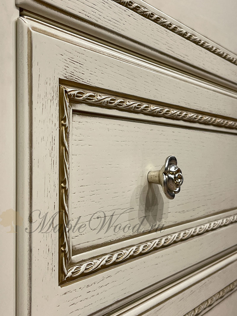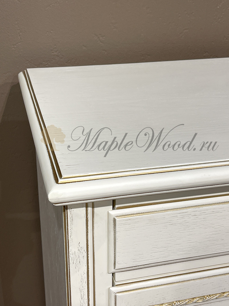 Бельевой комод для спальни из коллекции Палермо от фабрики Тимбер выполнен в классическом стиле из шпонированного МДФ с элементами из массива дерева и декорирован золотой патиной, которая подчеркивает акцентные детали изделия.
