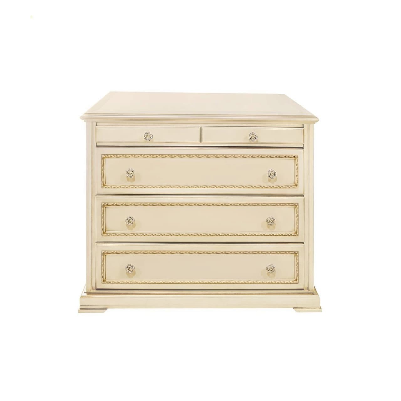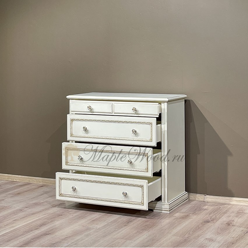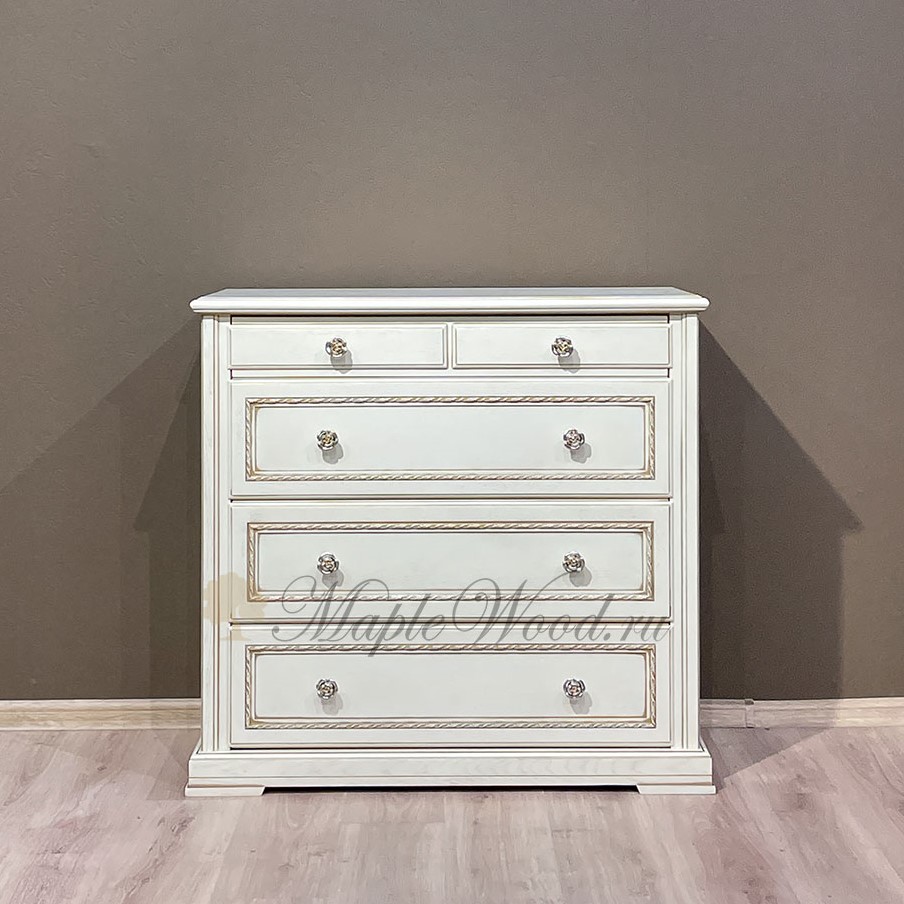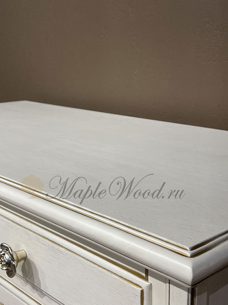 Бельевой комод для спальни из коллекции Палермо от фабрики Тимбер выполнен в классическом стиле из шпонированного МДФ с элементами из массива дерева и декорирован золотой патиной, которая подчеркивает акцентные детали изделия.